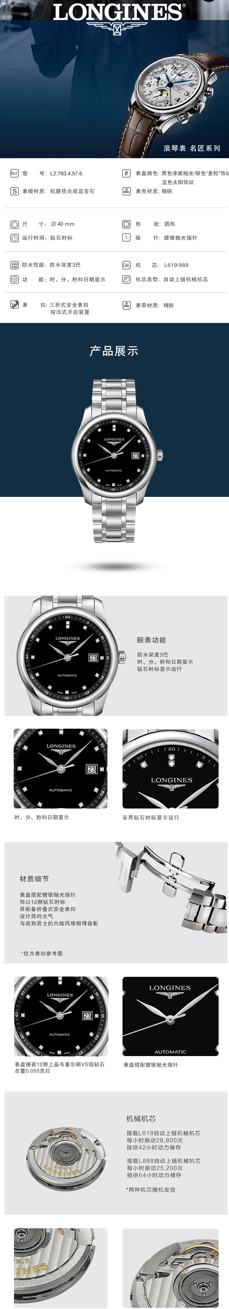 Longines浪琴 名匠系列男士自动机械手表黑盘钢带(40mm) L2.793.4.57.6 块 黑色