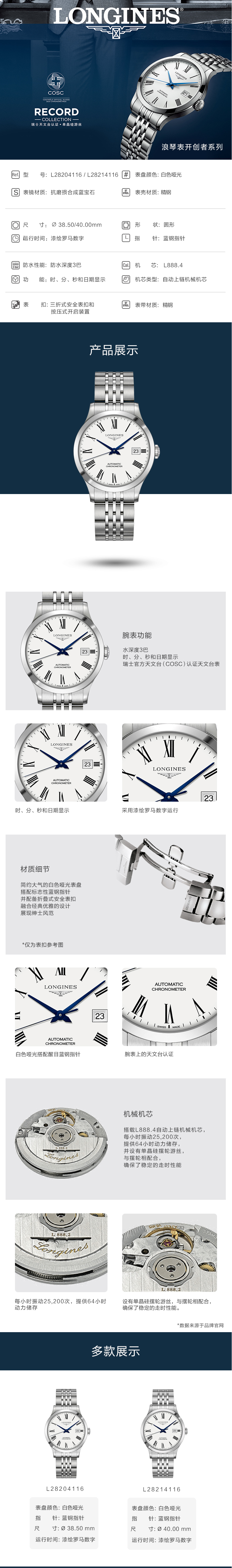 Longines浪琴 开创者系列机械手表男腕表(38.5mm) L2.820.4.11.6 单位:块 白色