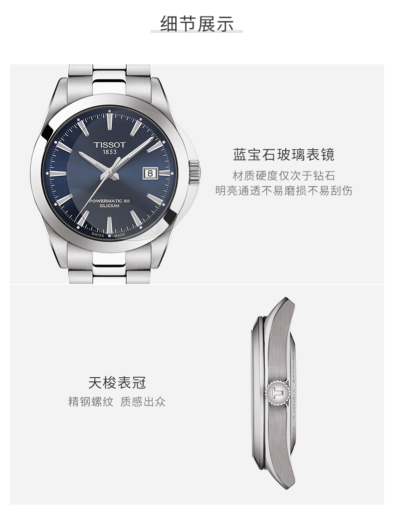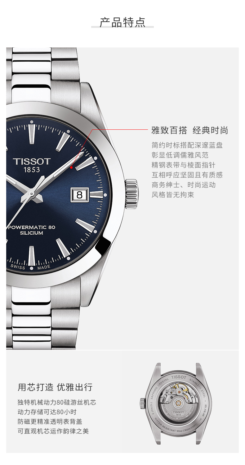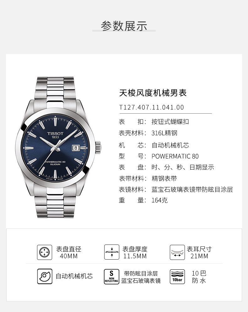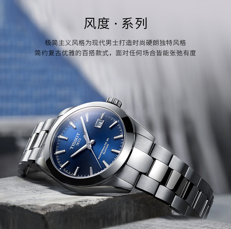 TISSOT天梭 风度系列钢带机械男士手表(40mm) T127.407.11.041.00(块) 蓝色