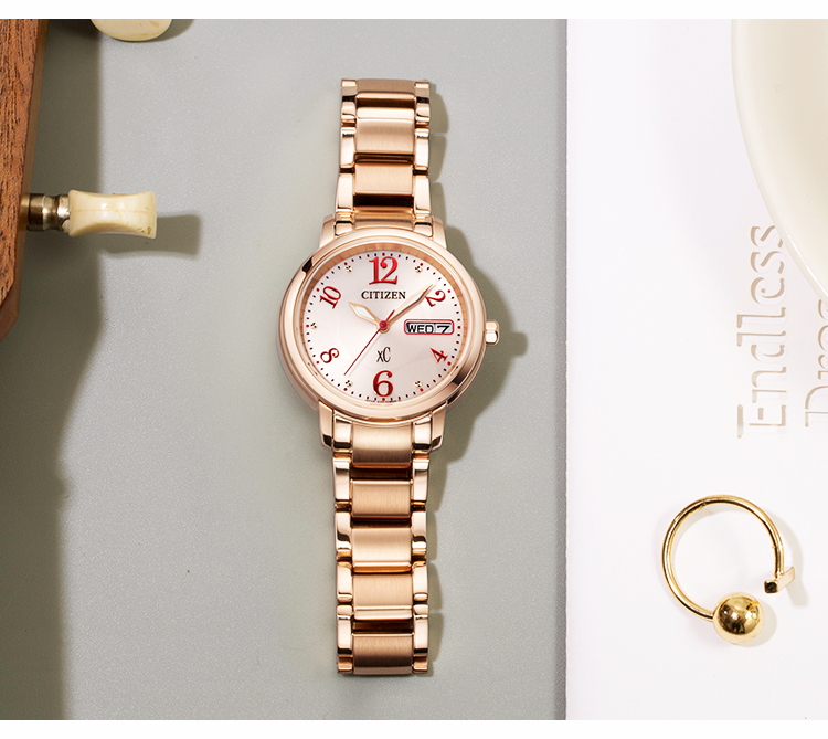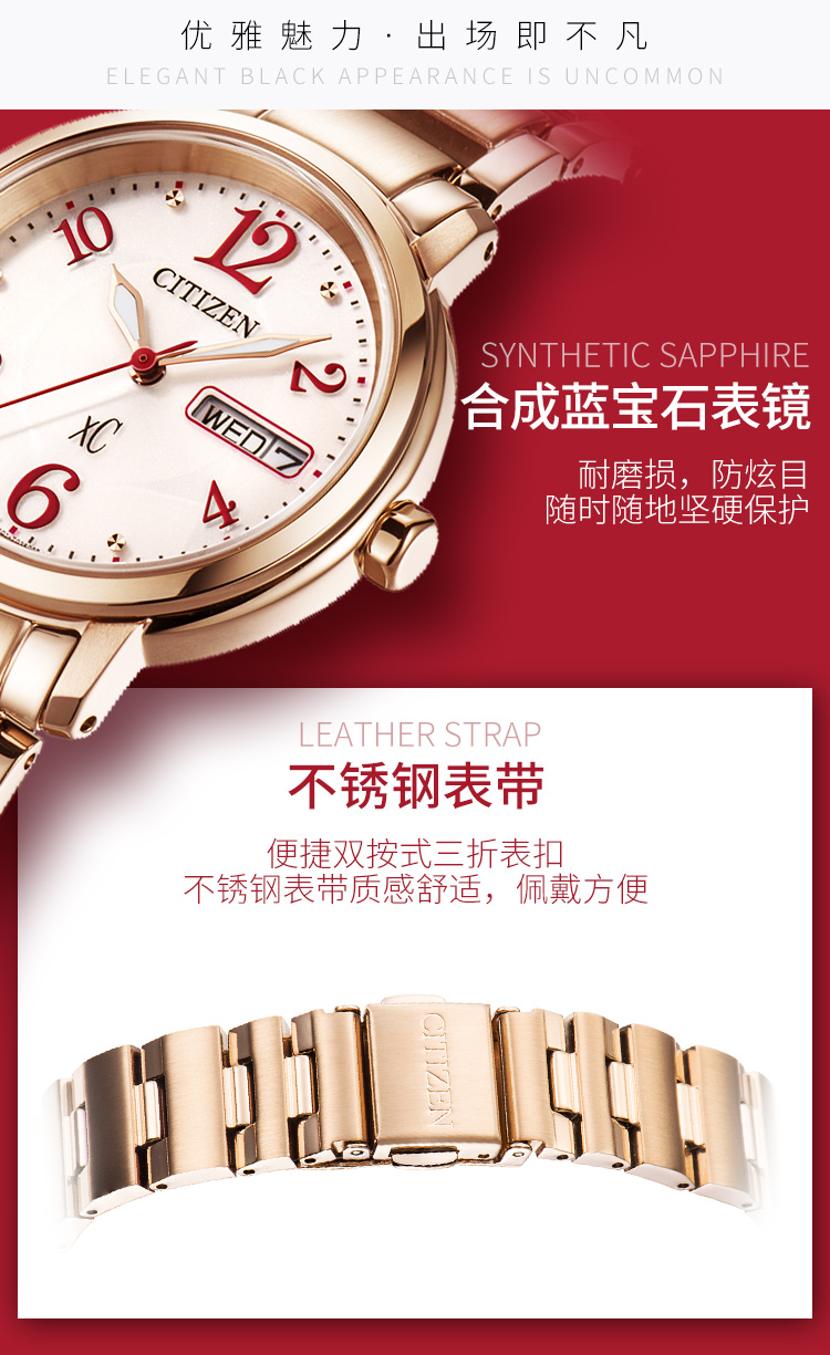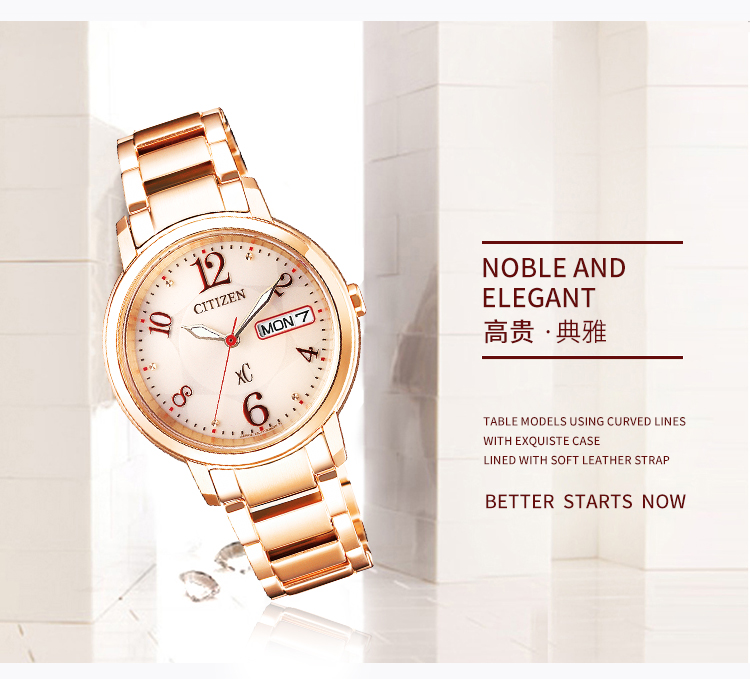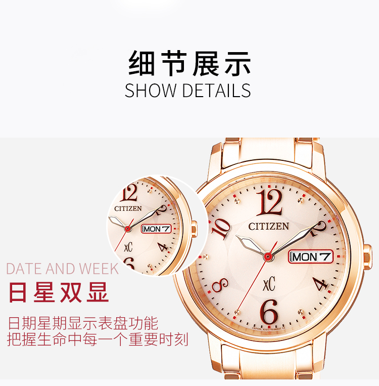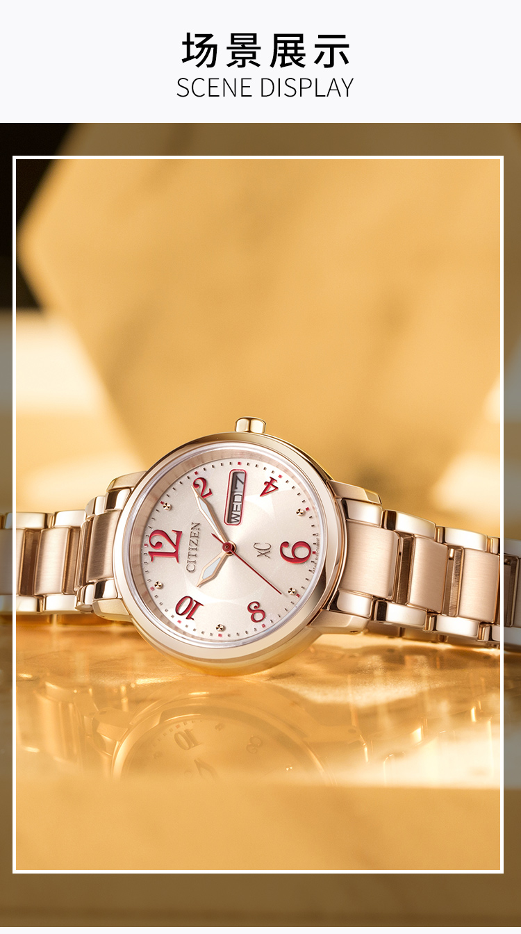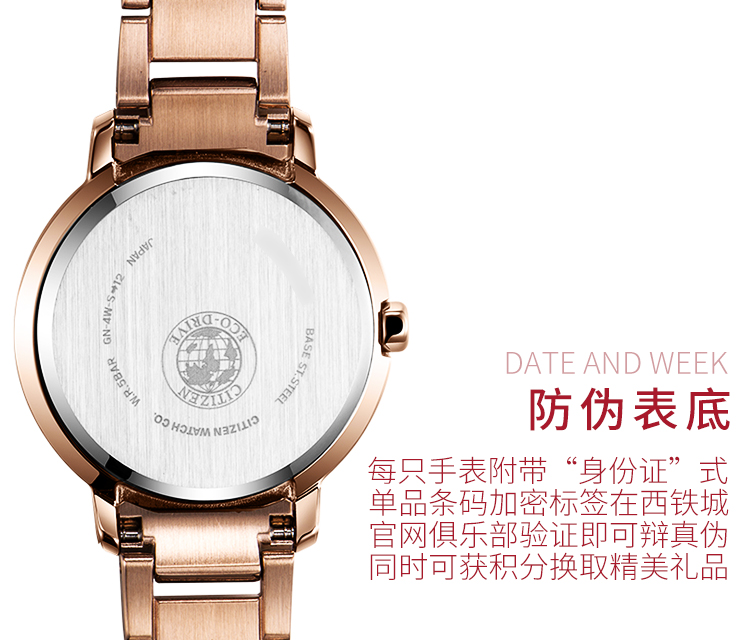 Citizen西铁城 光动能星期日期显示粉金色表带商务简约时尚女表EW2423-52WB 单位:块 金色