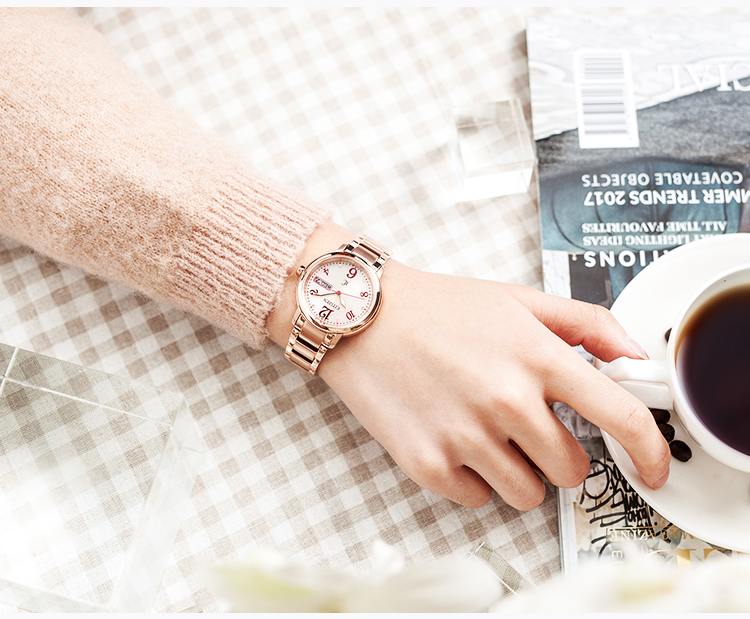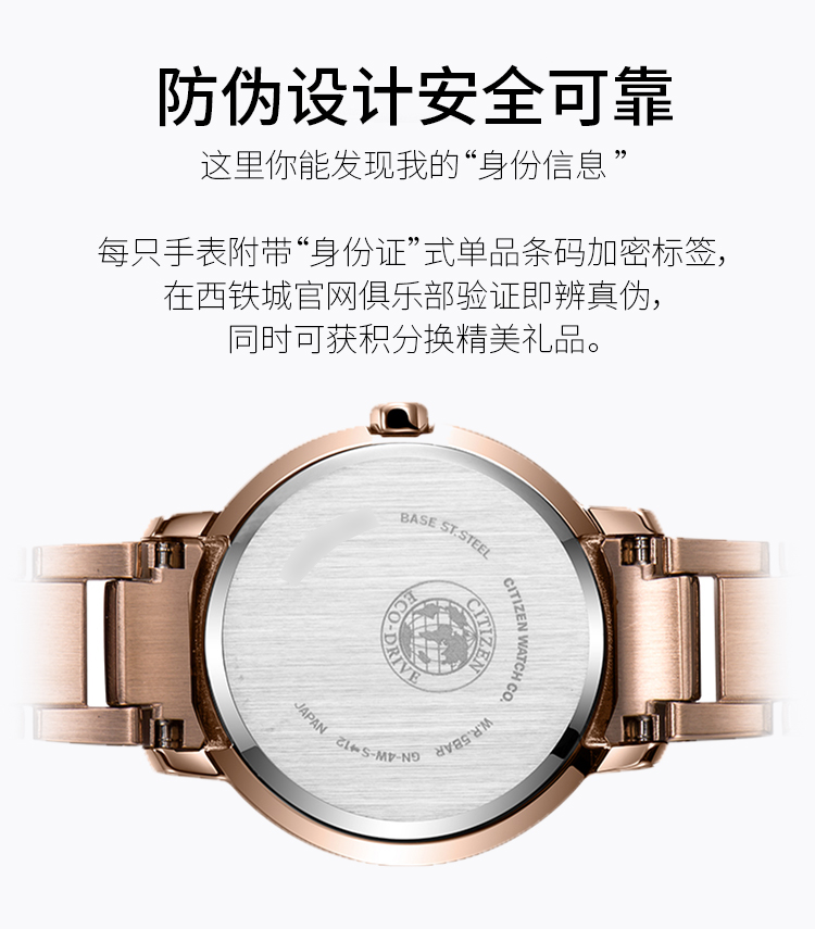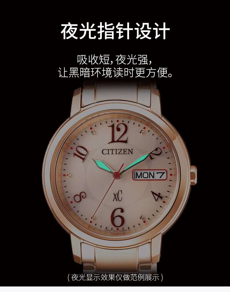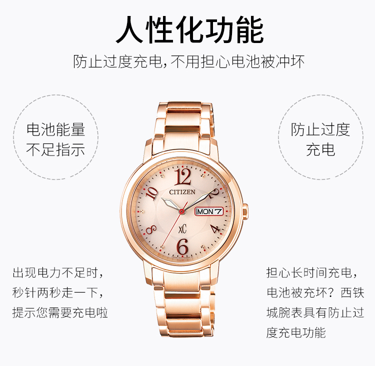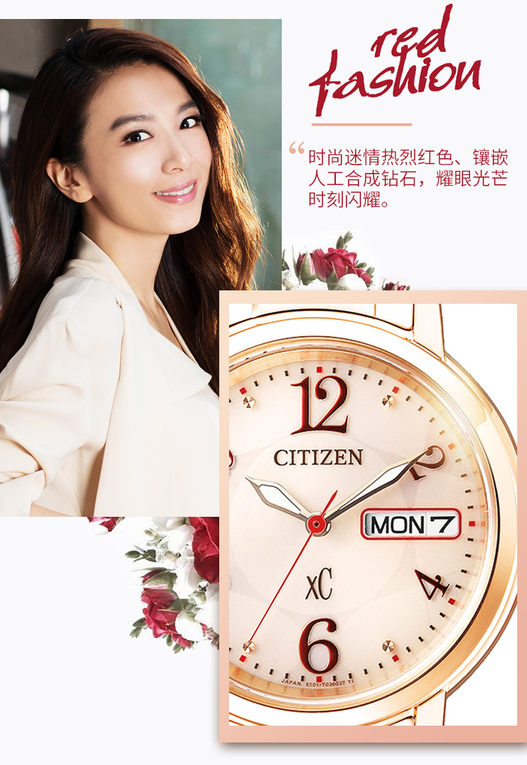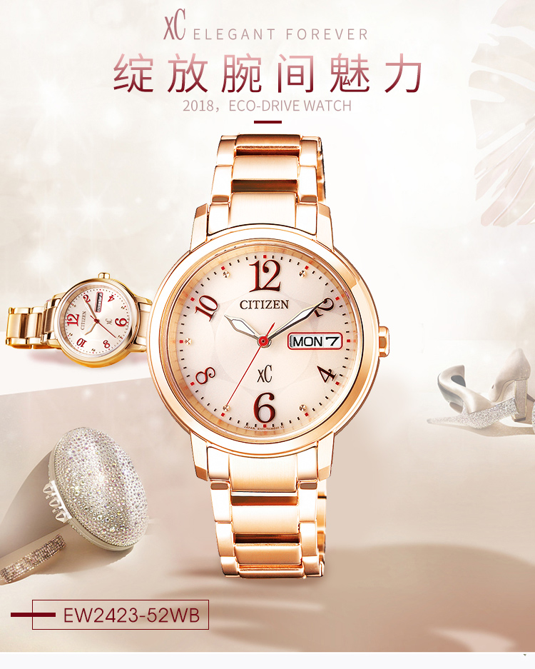 Citizen西铁城 光动能星期日期显示粉金色表带商务简约时尚女表EW2423-52WB 单位:块 金色