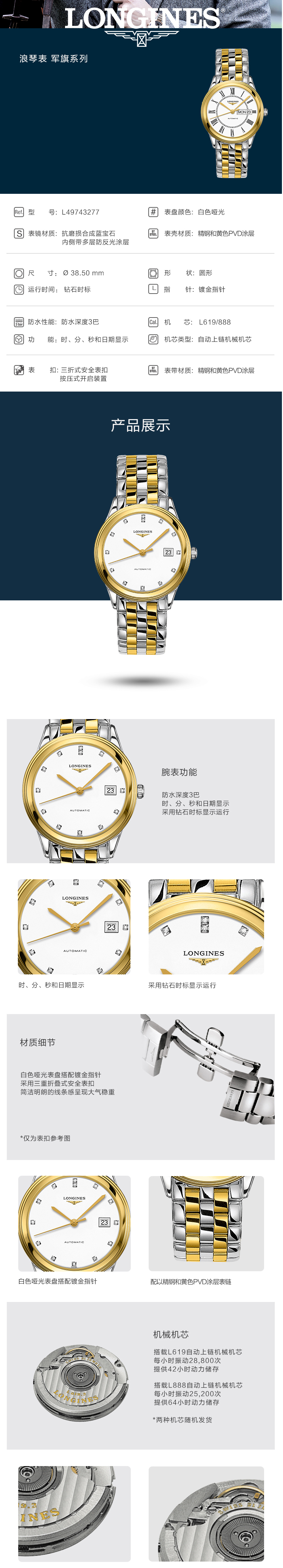 Longines浪琴 军旗系列机械手表男腕表(38.5mm) L4.974.3.27.7 单位:块 白色