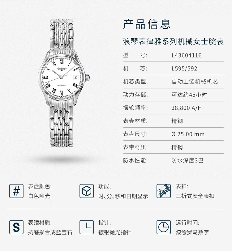 Longines浪琴 律雅系列女士机械手表女腕表(25mm) L4.360.4.11.6(单位:块) 白色