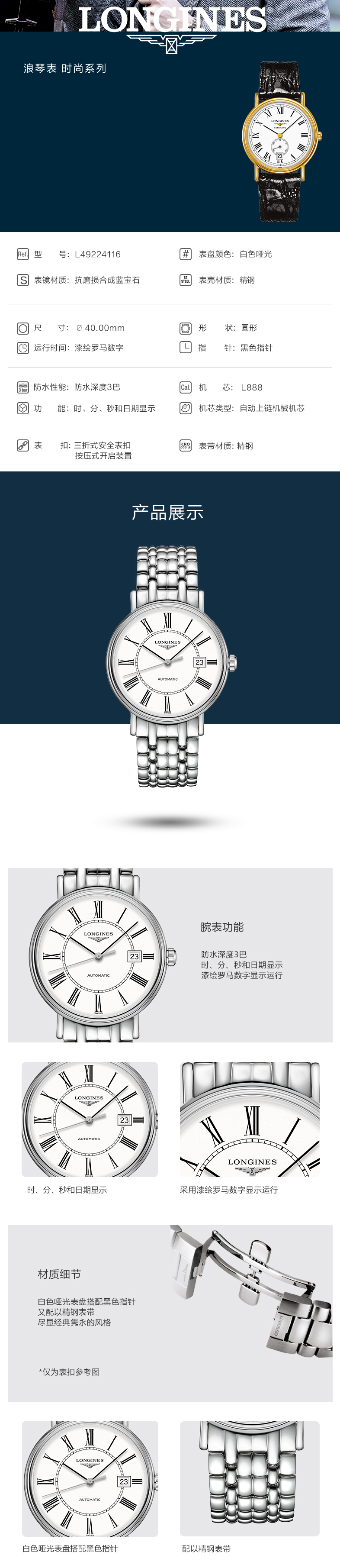Longines浪琴 时尚系列机械手表罗马数字男腕表(40mm) L4.922.4.11.6(块) 白色