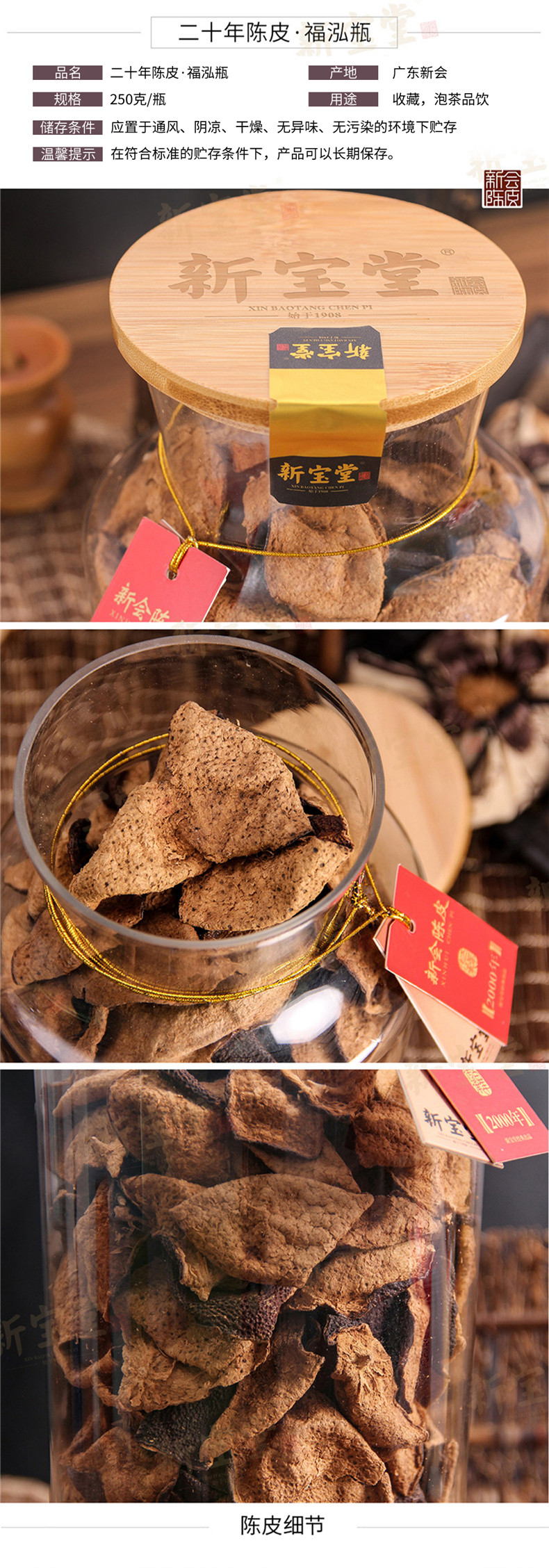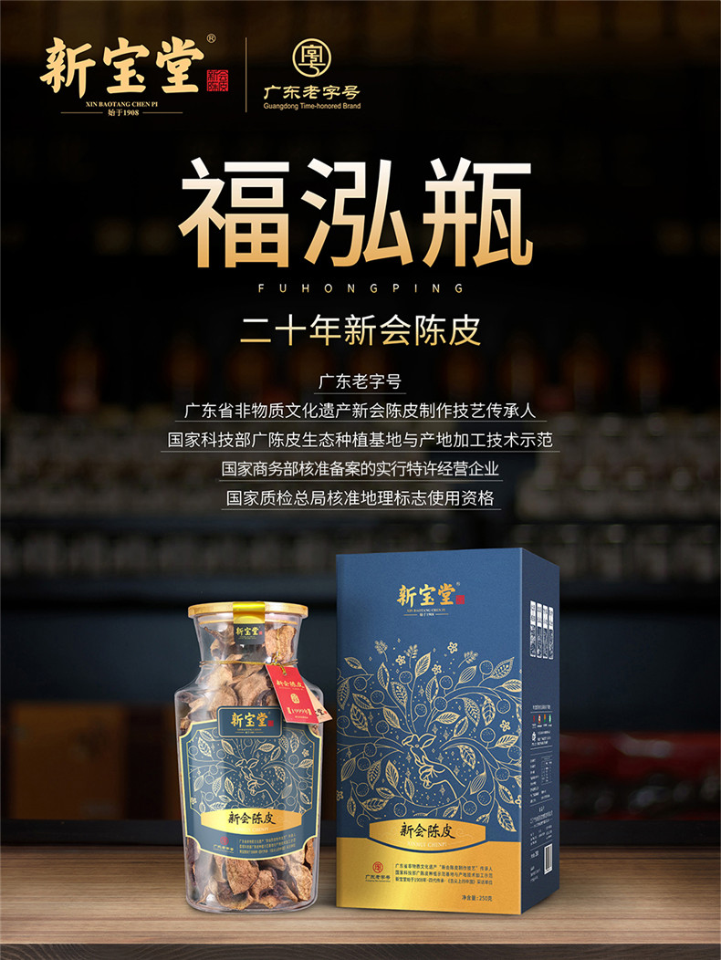 新宝堂新会陈皮二十年老陈皮玻璃瓶装礼盒陈皮干福泓瓶礼盒250克