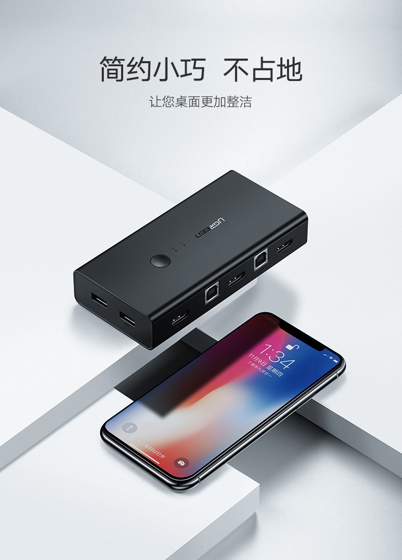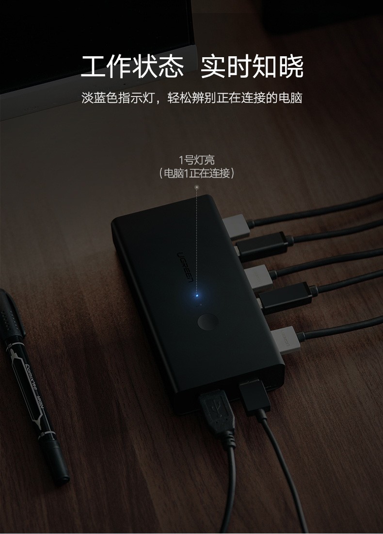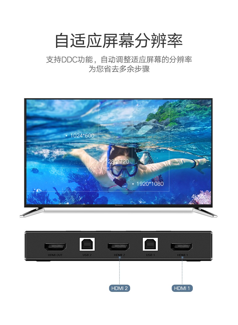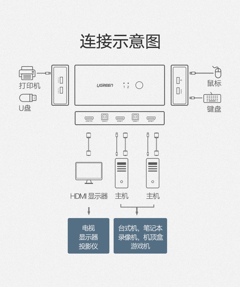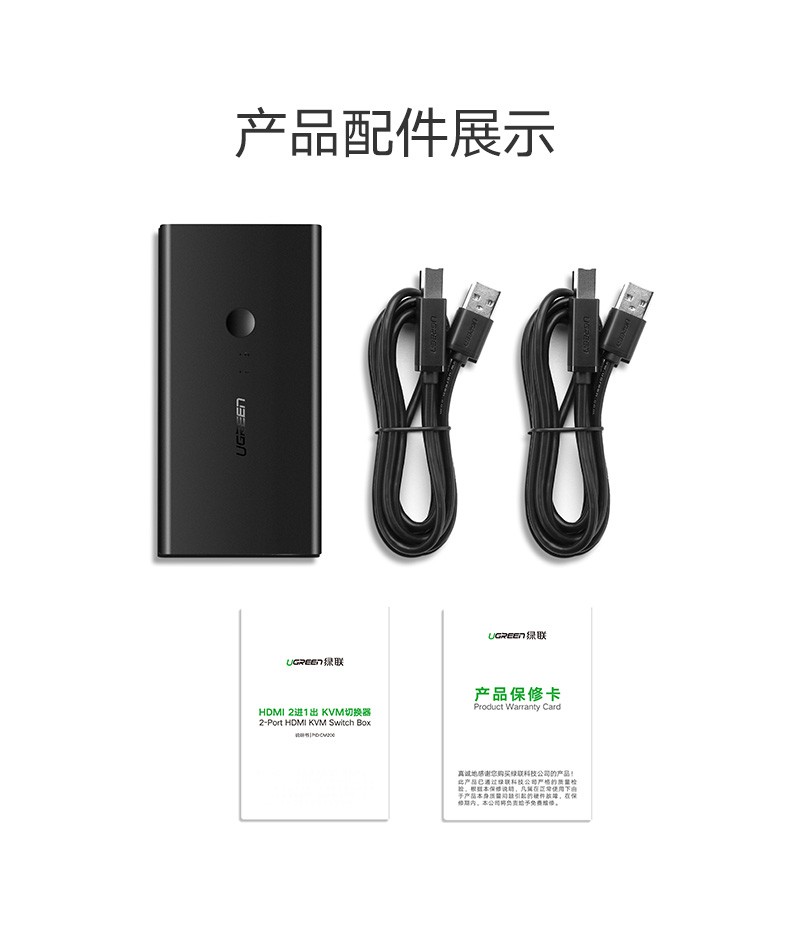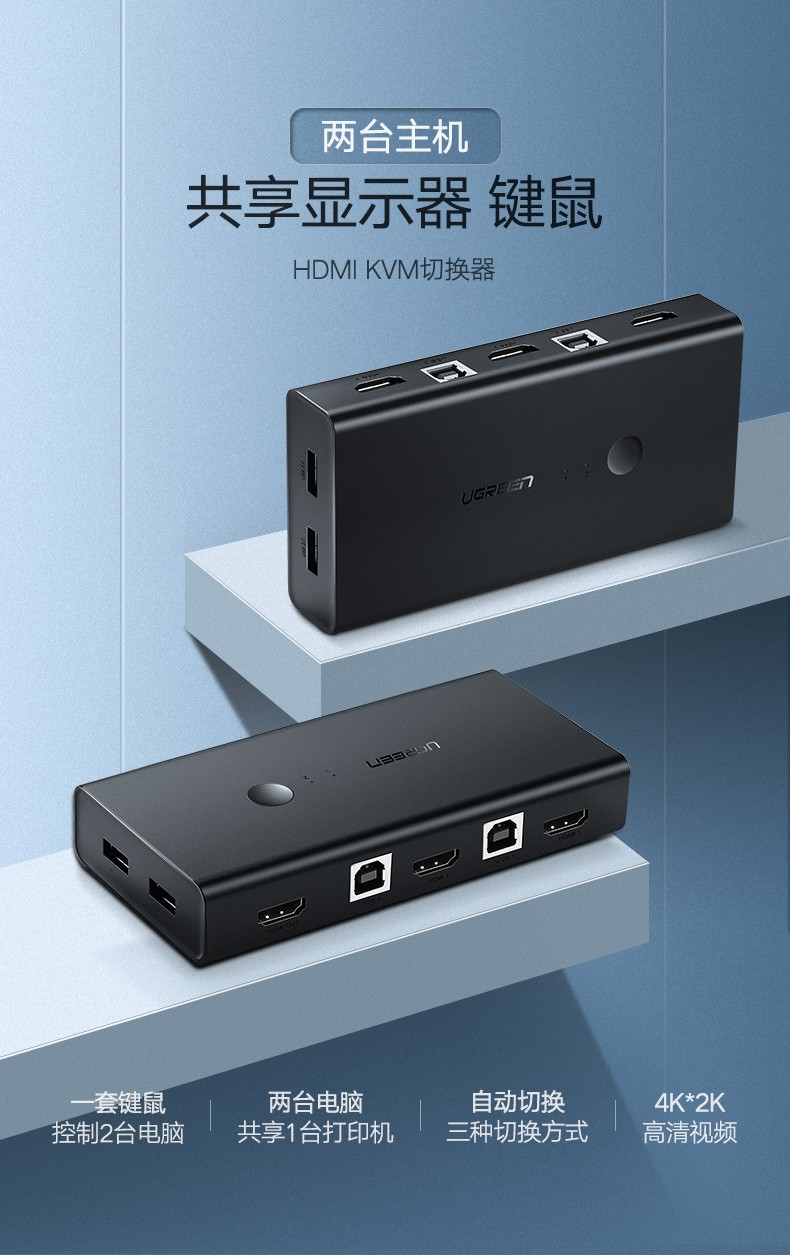 绿联 KVM切换器 HDMI切屏器2进1出4K高清 USB打印机共享器 两台电脑共享台显示器自动切换 KVM切换器 50744 黑色
