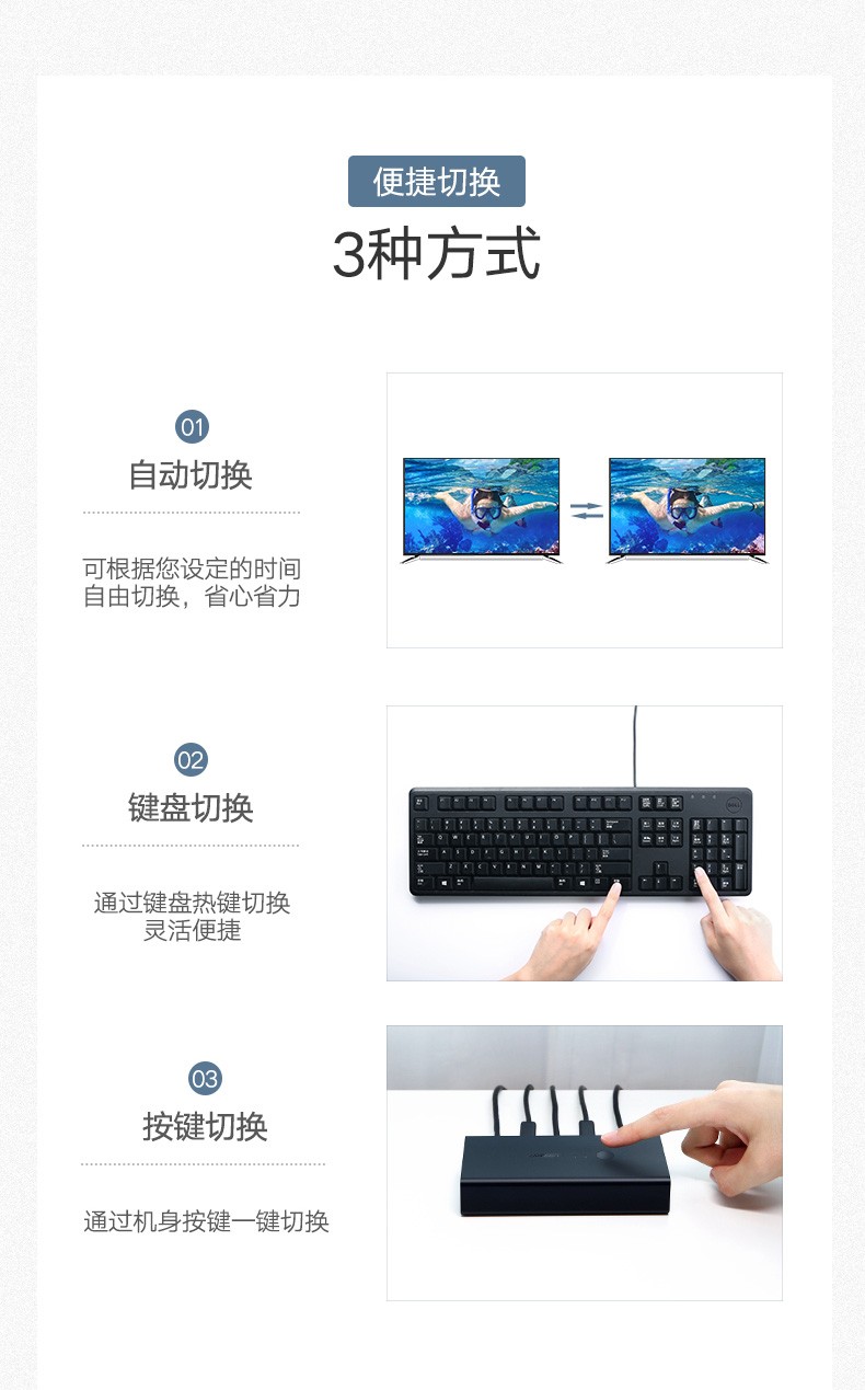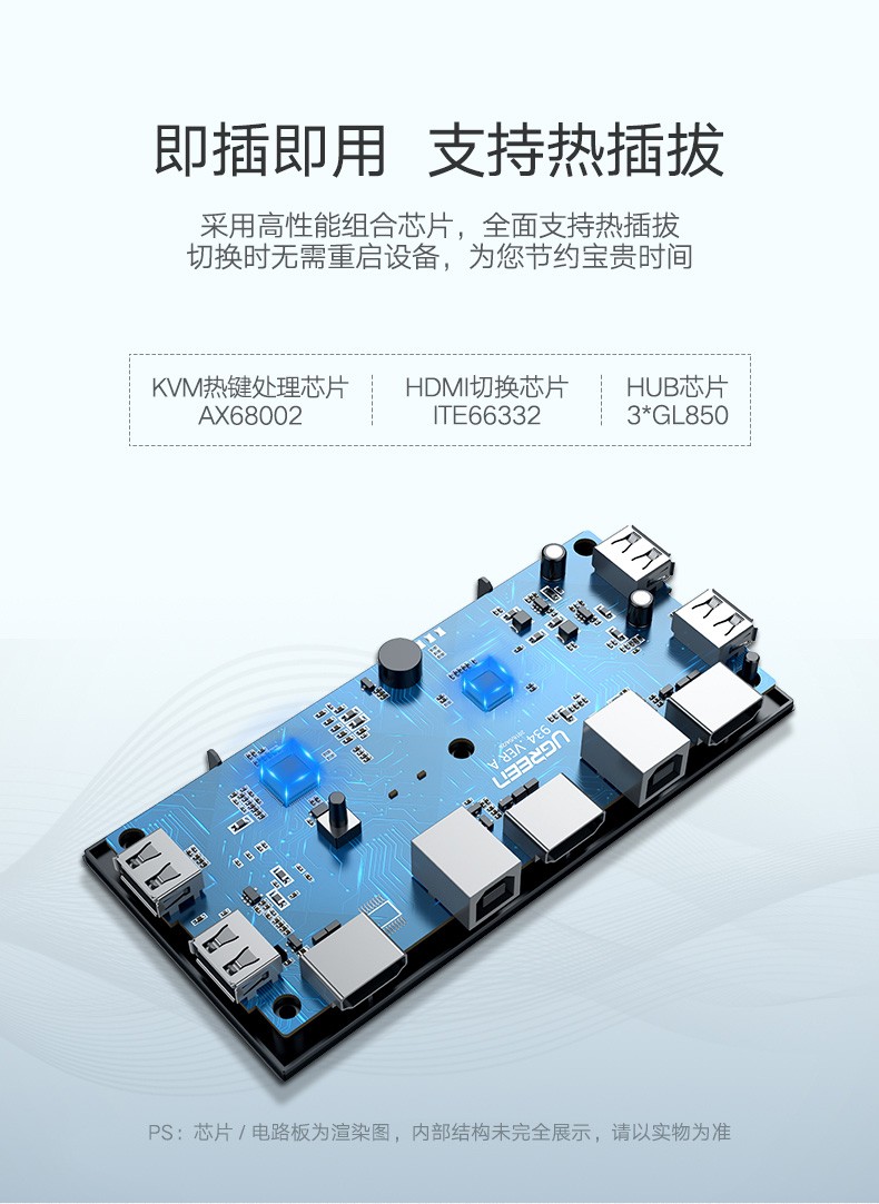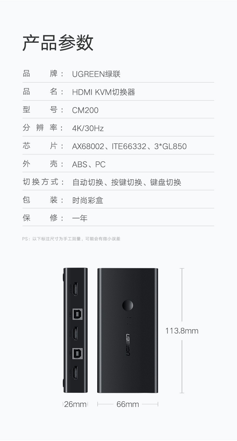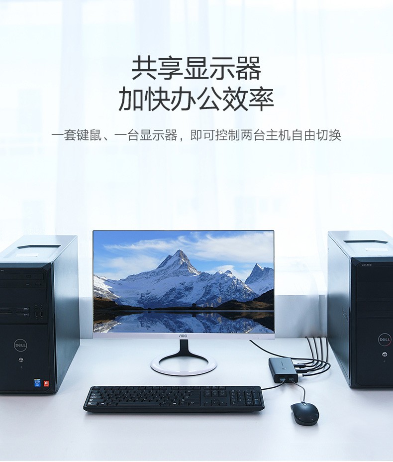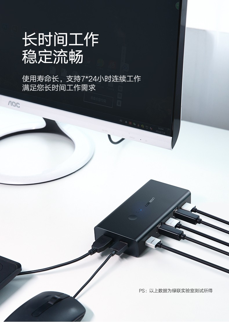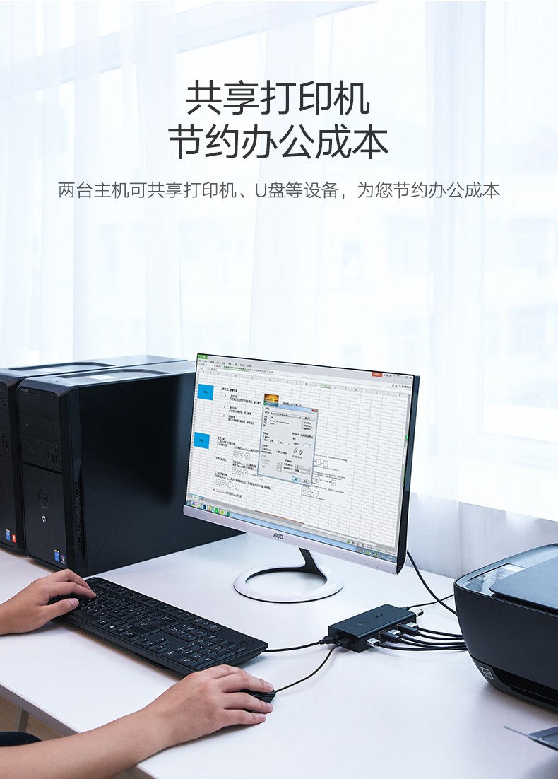 绿联 KVM切换器 HDMI切屏器2进1出4K高清 USB打印机共享器 两台电脑共享台显示器自动切换 KVM切换器 50744 黑色