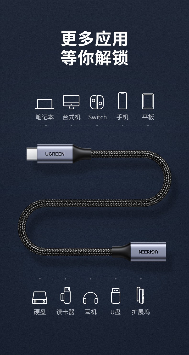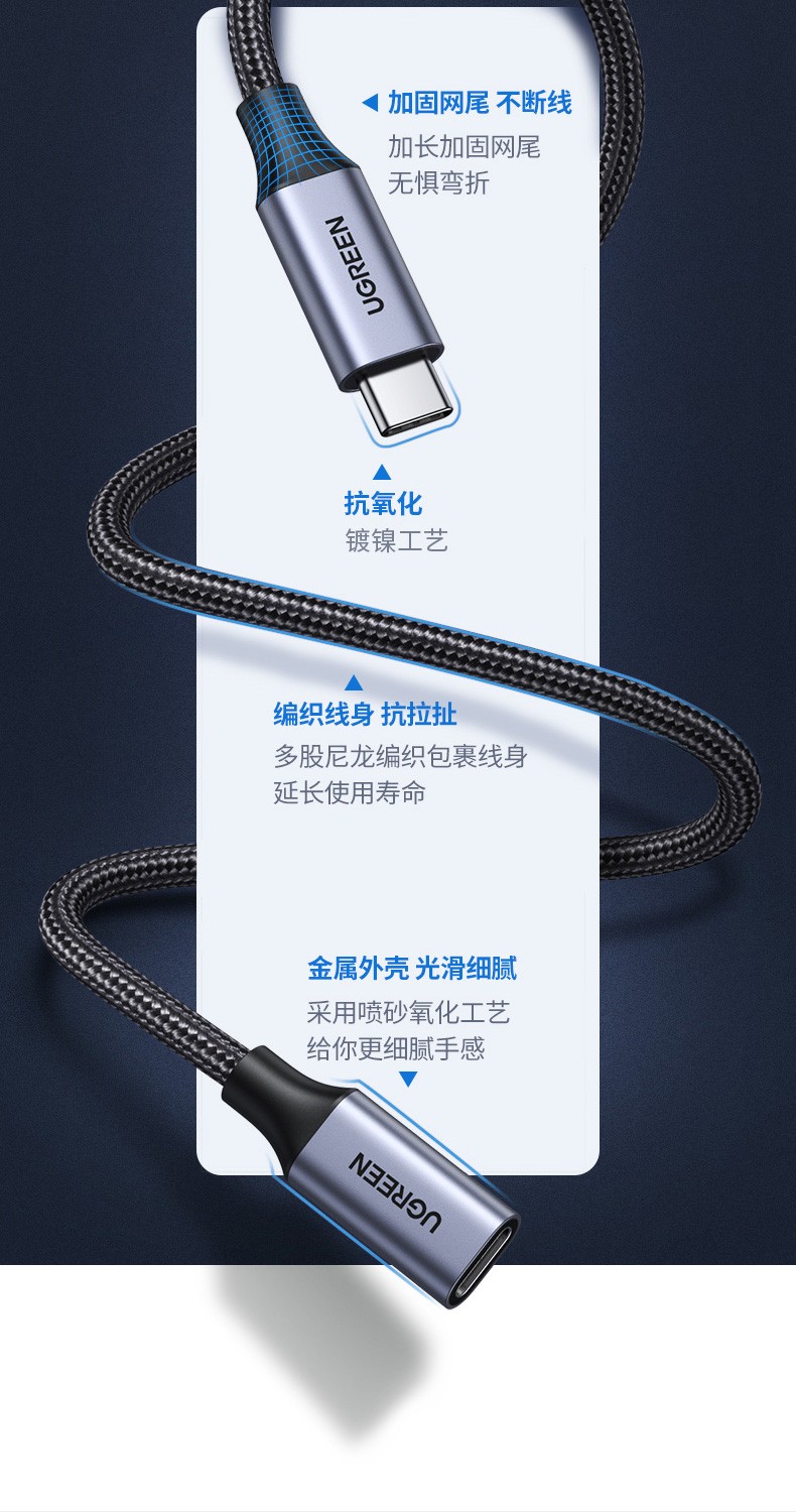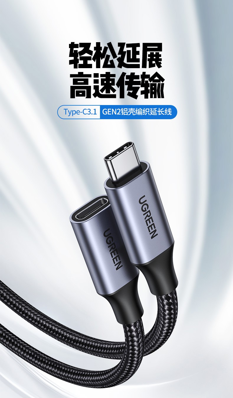 绿联 Type-C延长线公对母usb3.1gen2数据线PD100W充电扩展坞转接 延长线1米 黑色