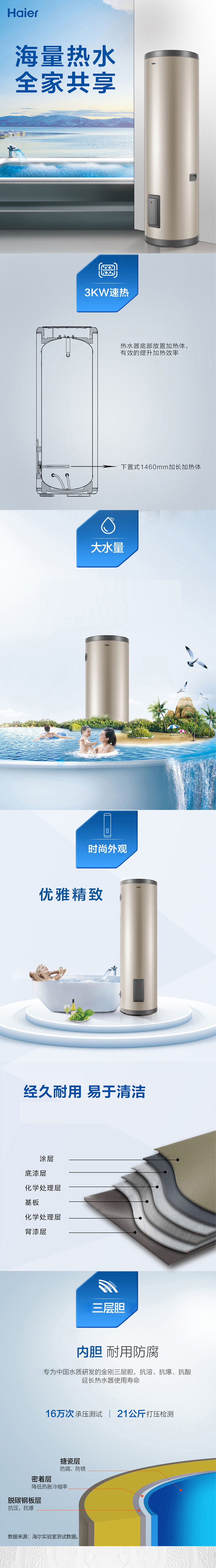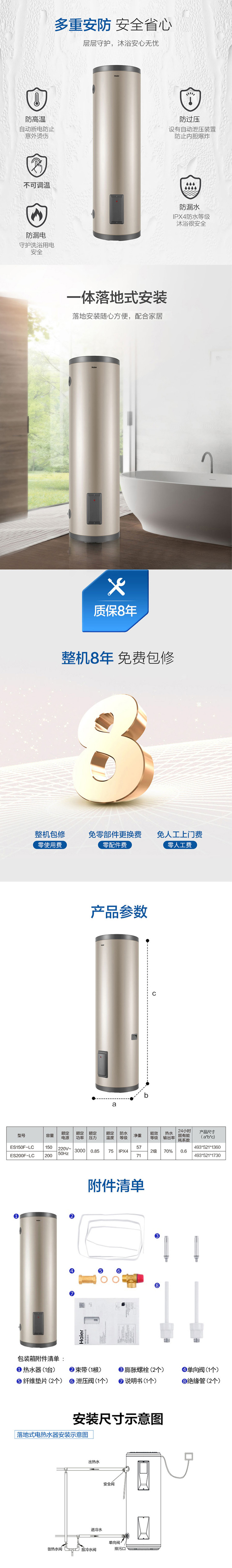 海尔(Haier) 商用家用电热水器大功率大容量速热立式中央全屋供水落地式150升ES150F-LC 香槟色