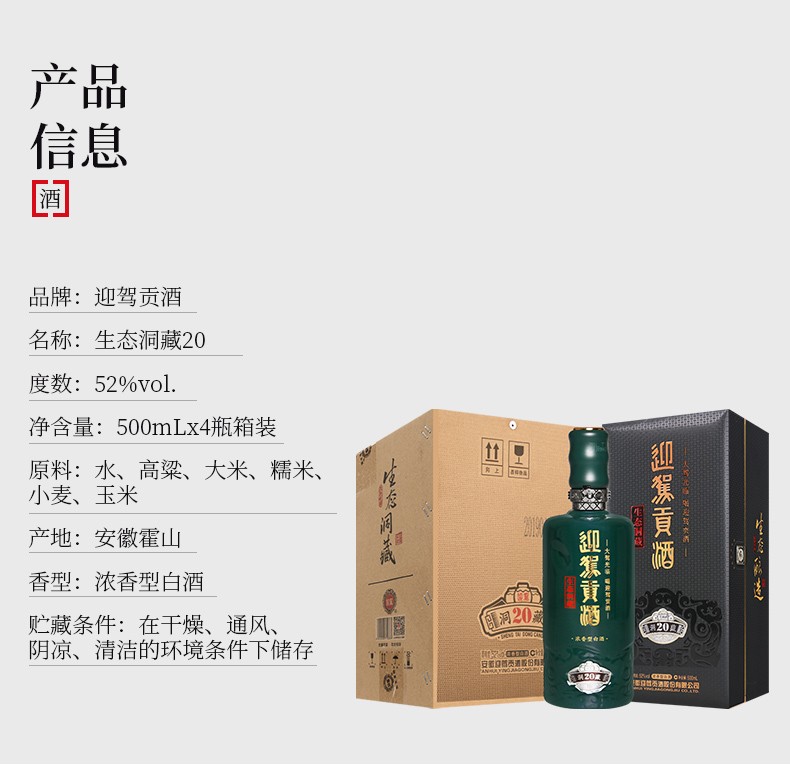 迎驾贡酒生态洞藏20年52度500ml*4瓶/箱 整箱
