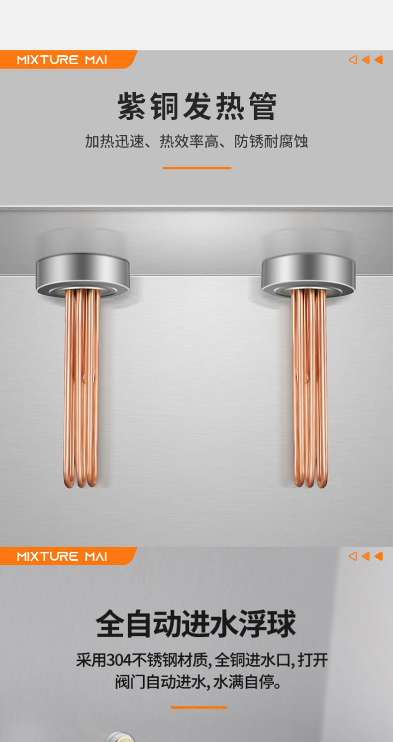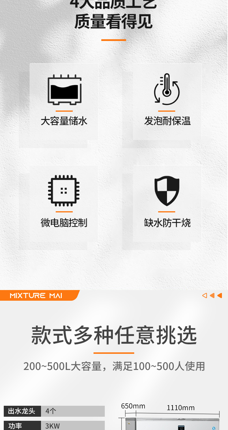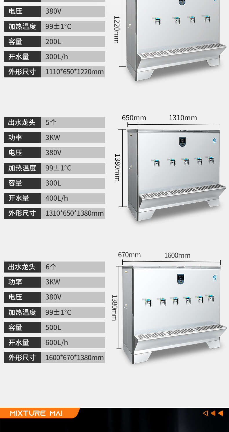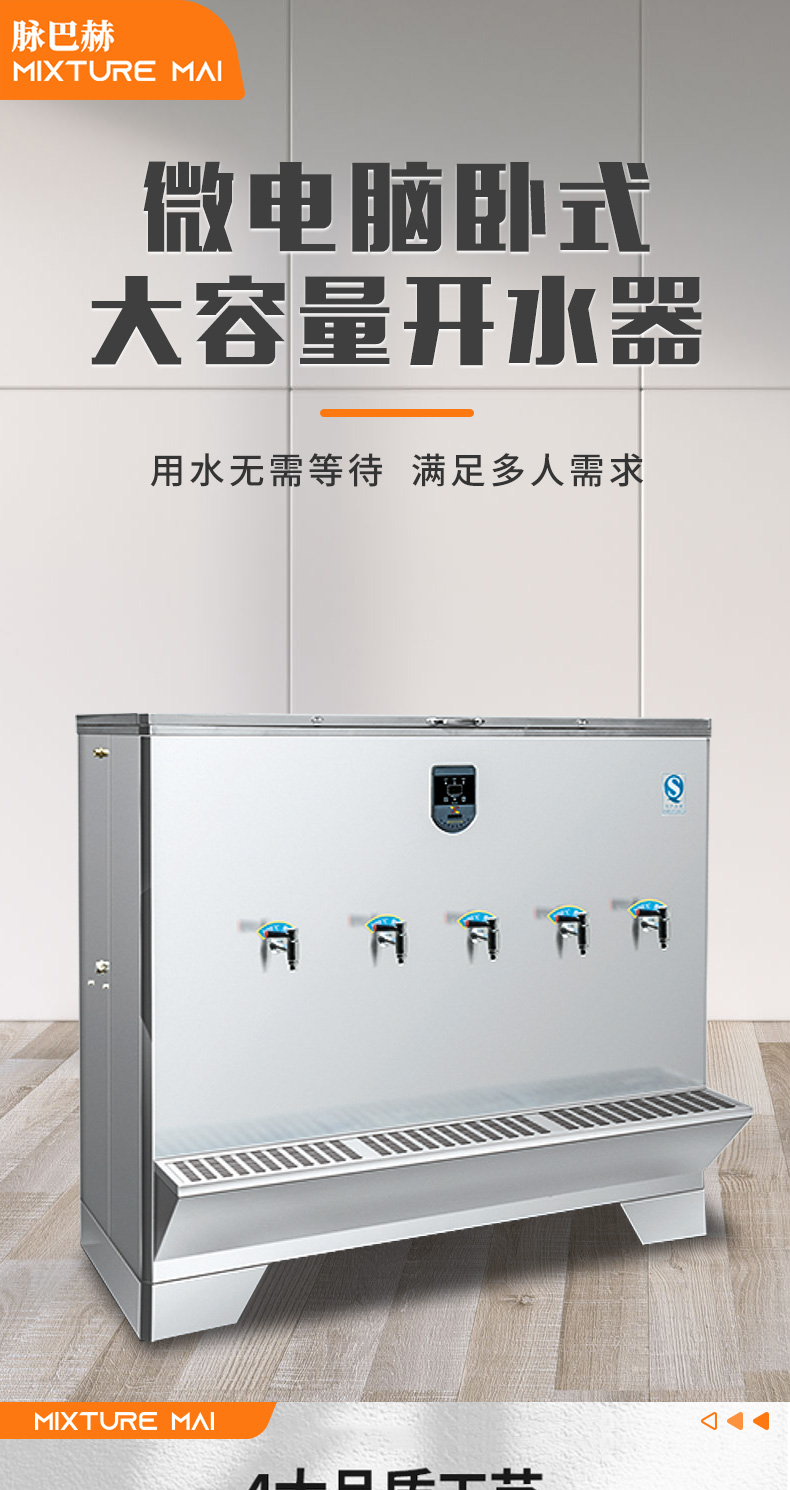 脉巴赫 商用300L大容量卧式开水器 五龙头不锈钢电热开水器 BMBH-WSKSQ5-300 不锈钢色