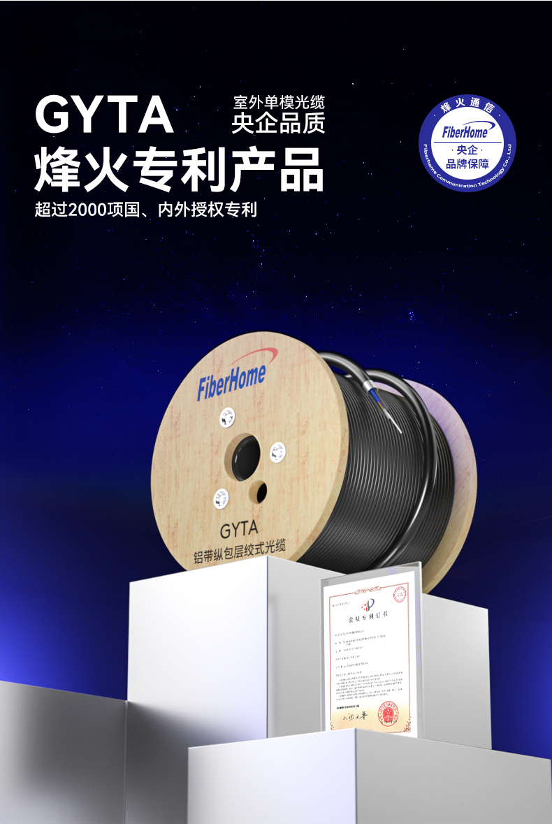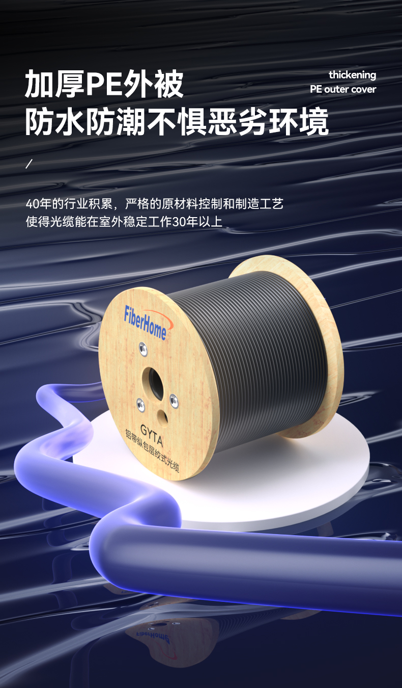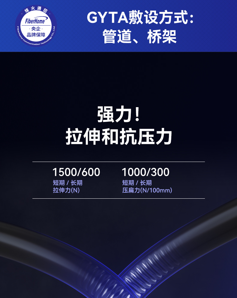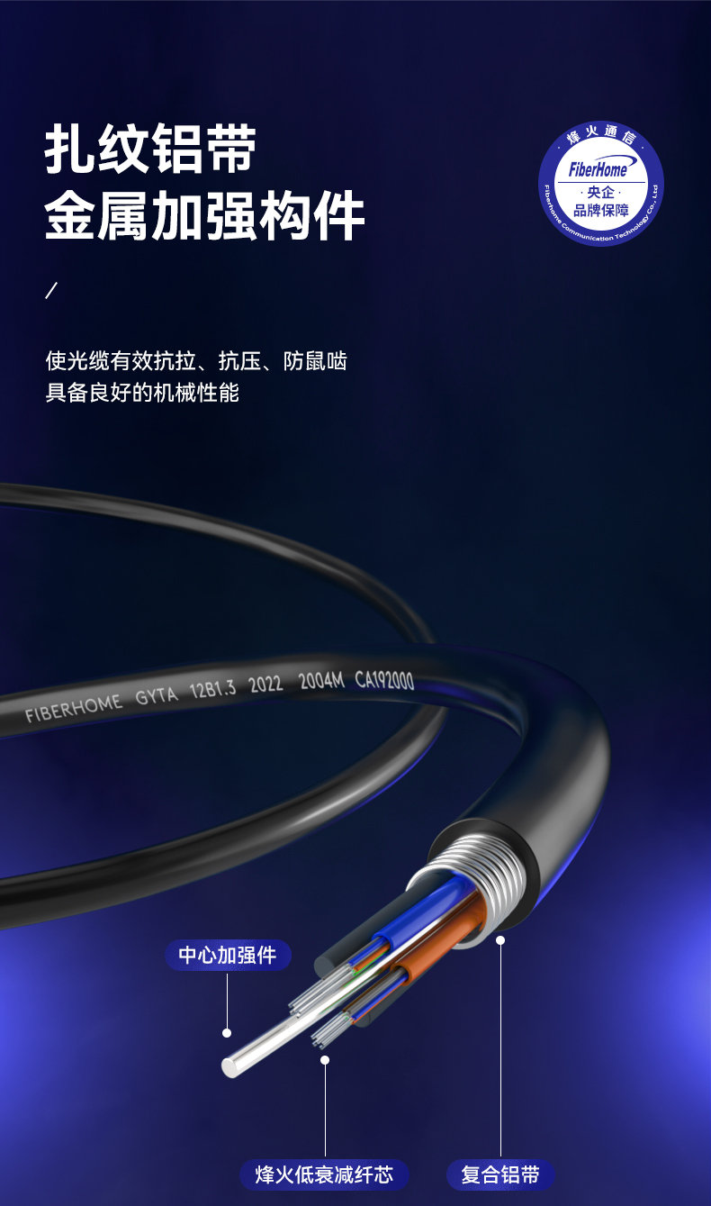 烽火(FiberHome)GYTA-12 铝带纵包架空管道工程层绞式室外光缆铠装单模室外光纤线电信级 12芯100米 曜石黑