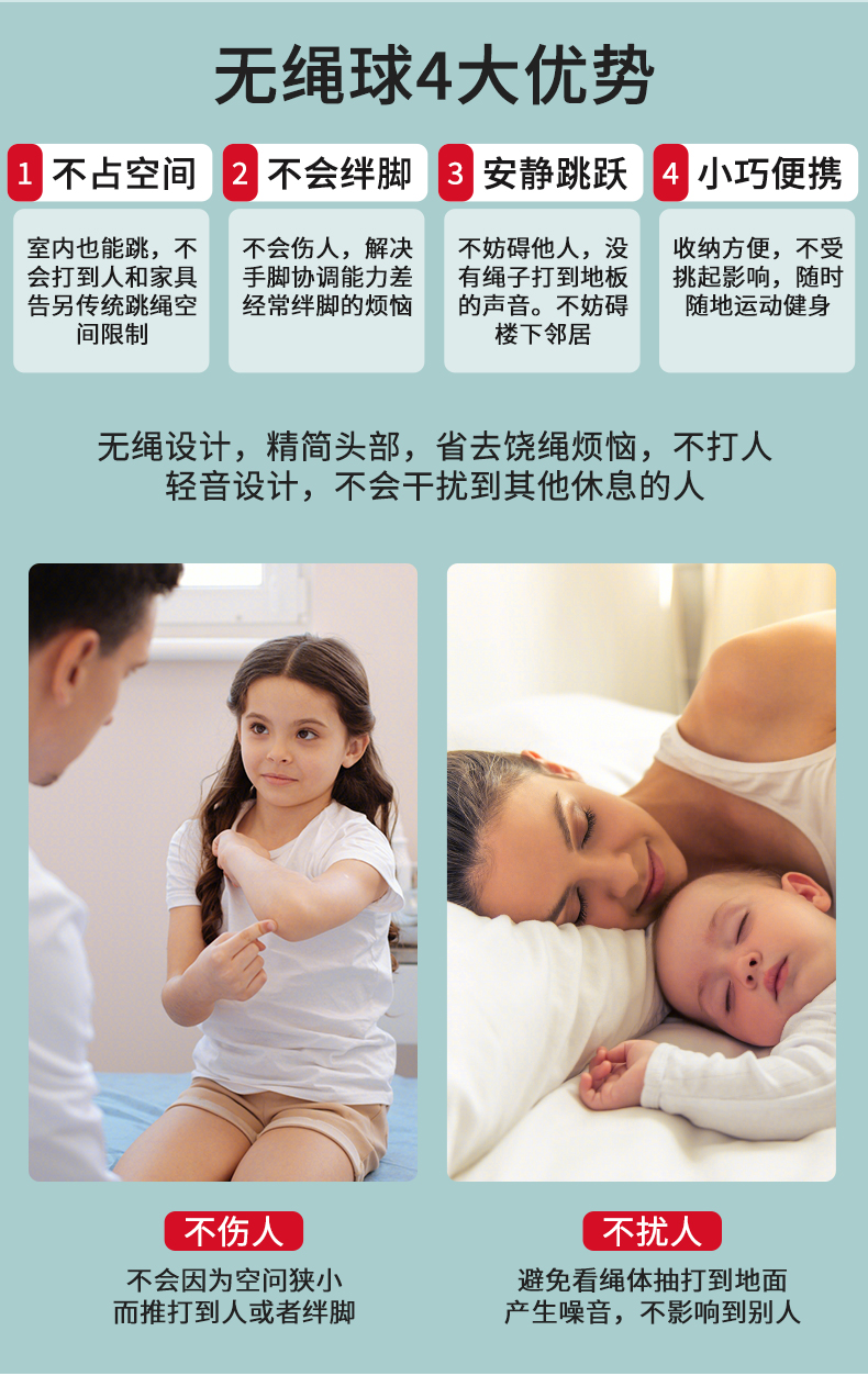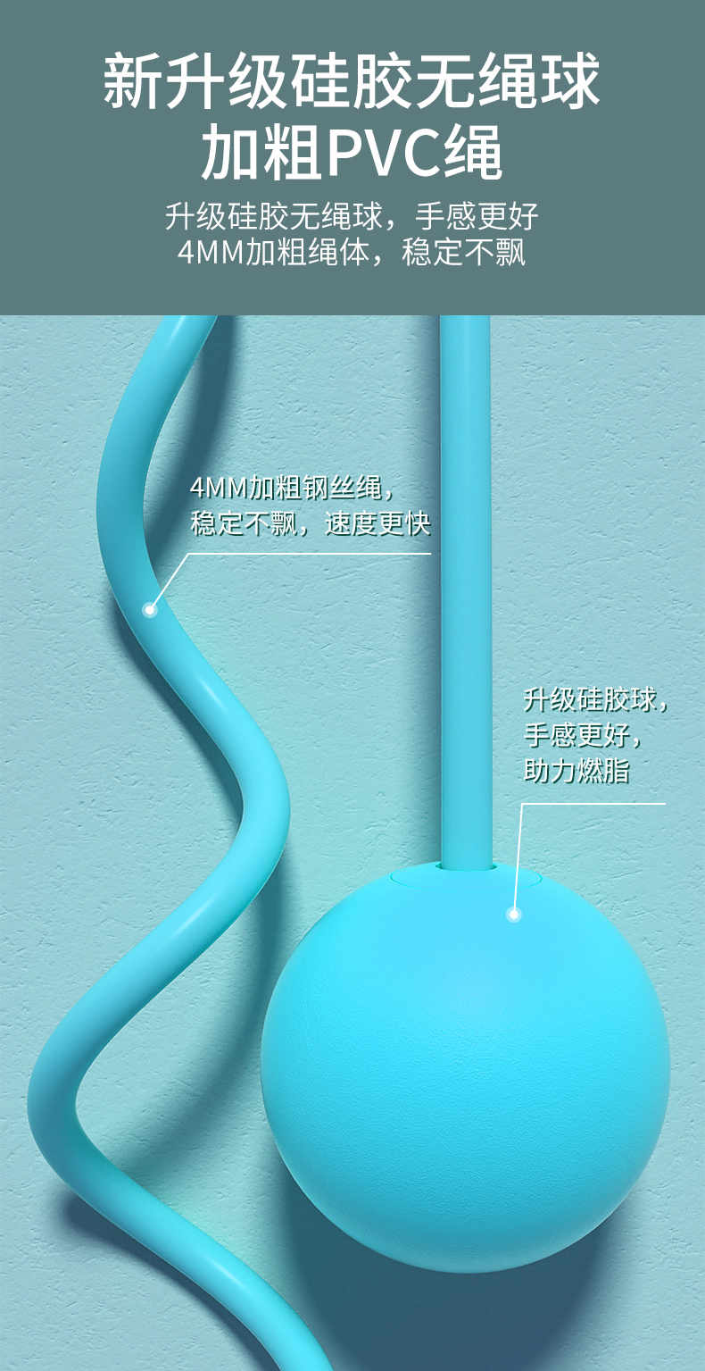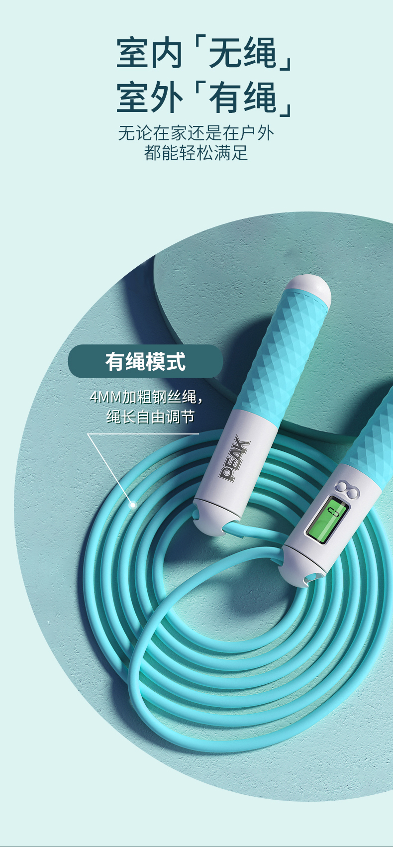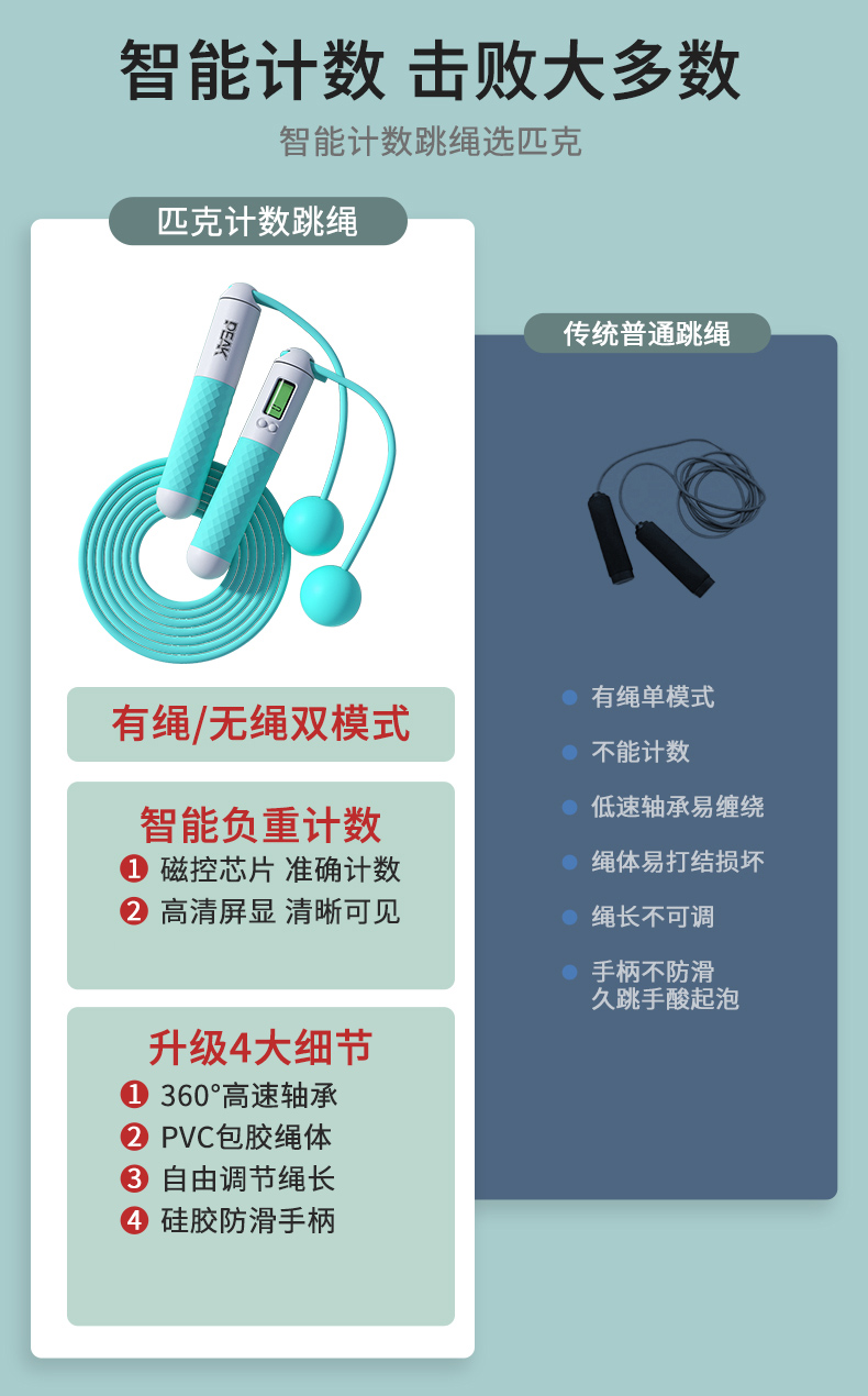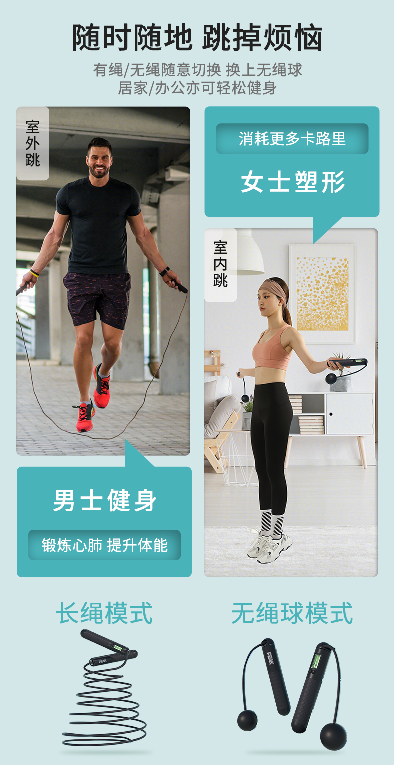 匹克(PEAK)两用款负重计数跳绳成人儿童学生中考试可调节2.8米无绳球跳绳 两用款YW21279个 水蓝色