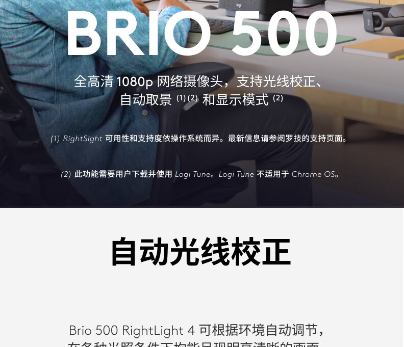 罗技(Logitech)Brio 500 全高清1080P网络摄像头 电脑摄像头 台式机摄像头 网课会议摄像头 家用摄像头 套 银色