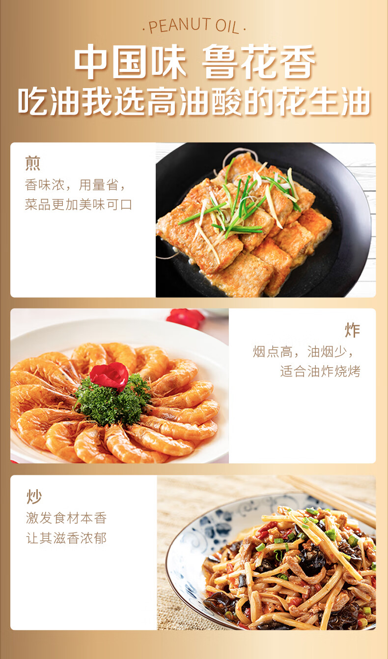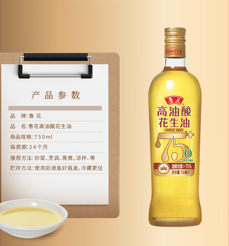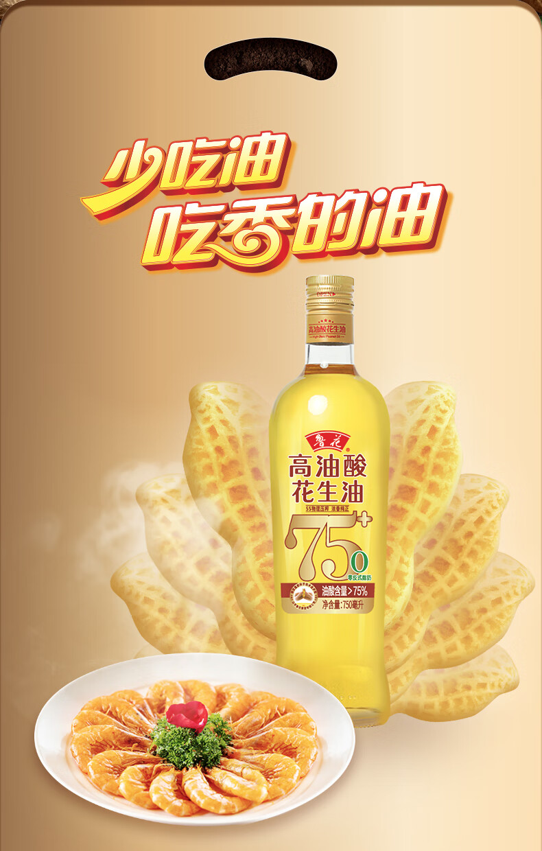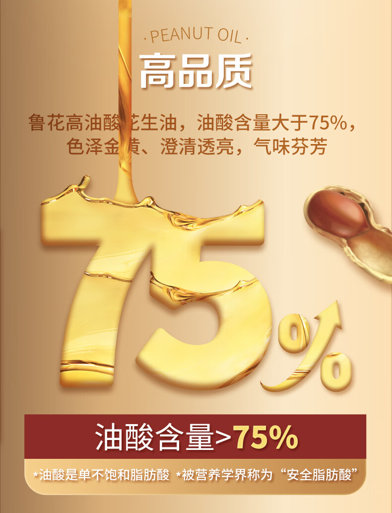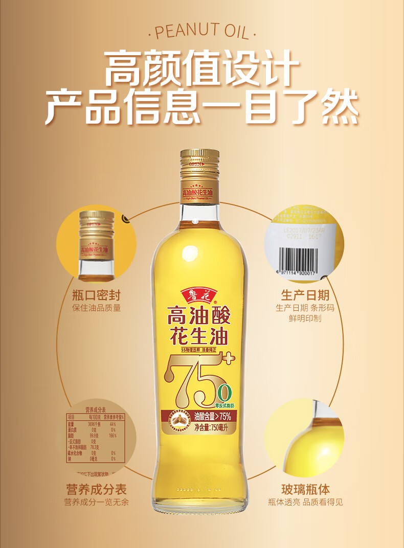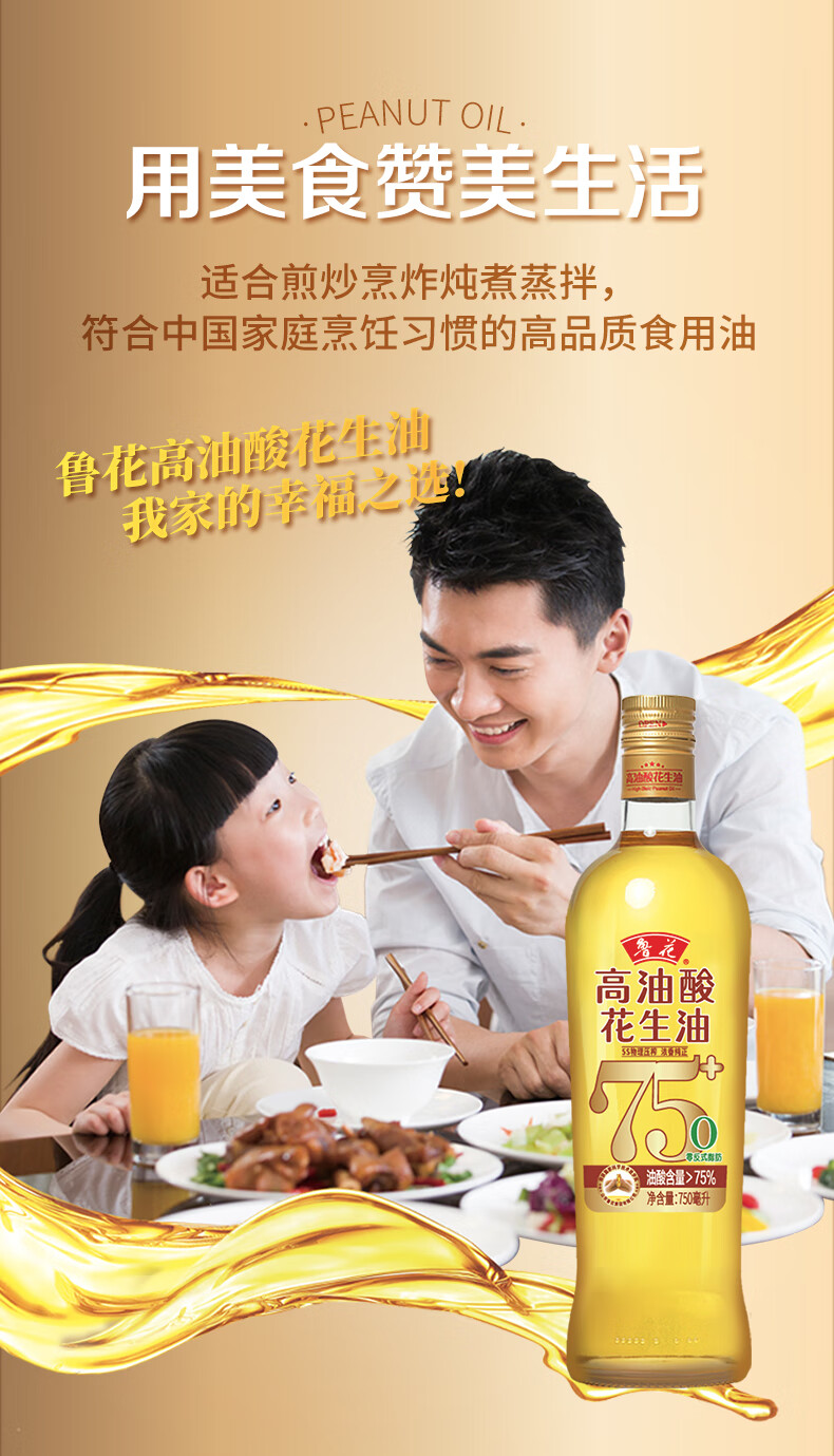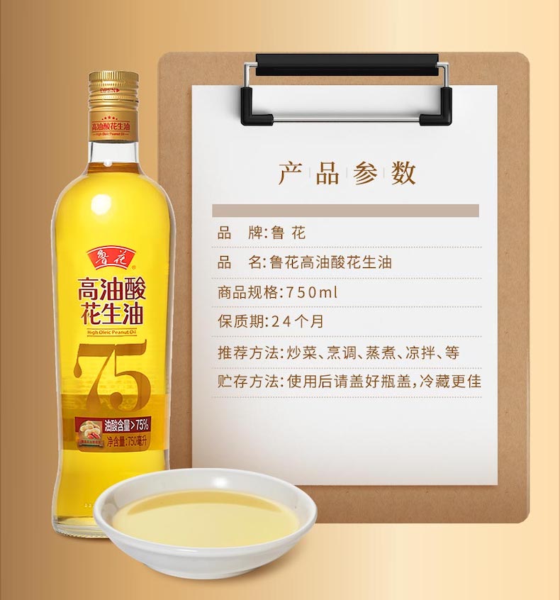 鲁花 油酸含量大于75%,烟点高,油烟少,用量省。 花生油 750ml 香槟黄(单位:瓶)