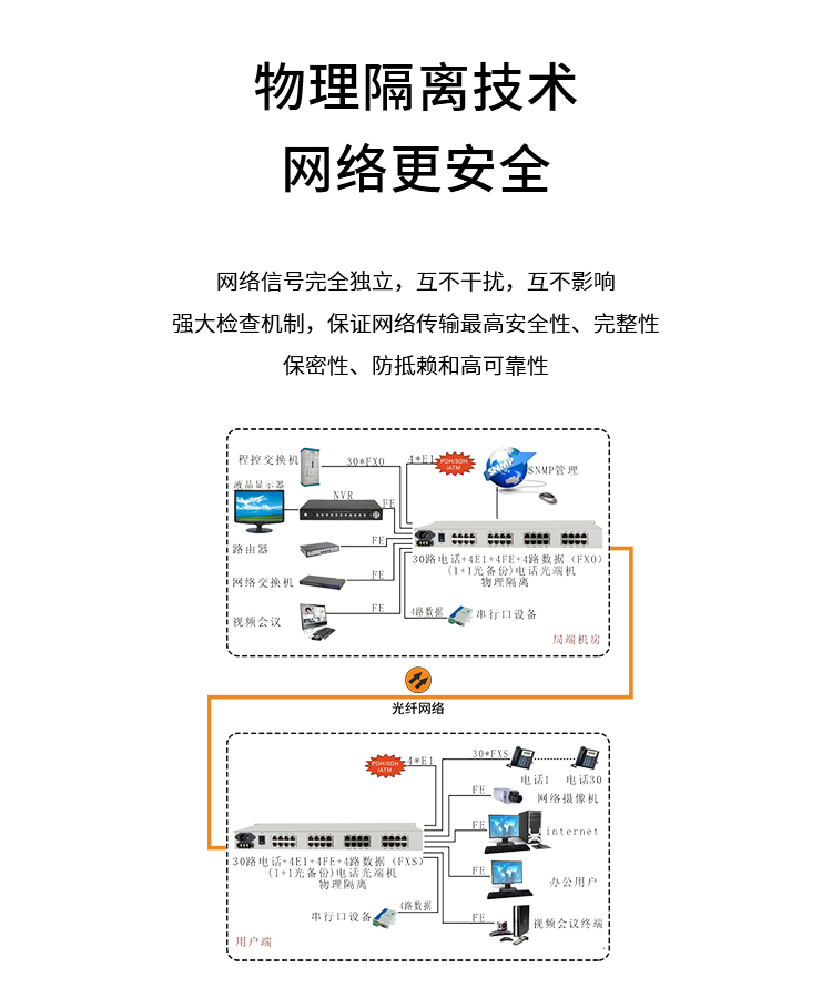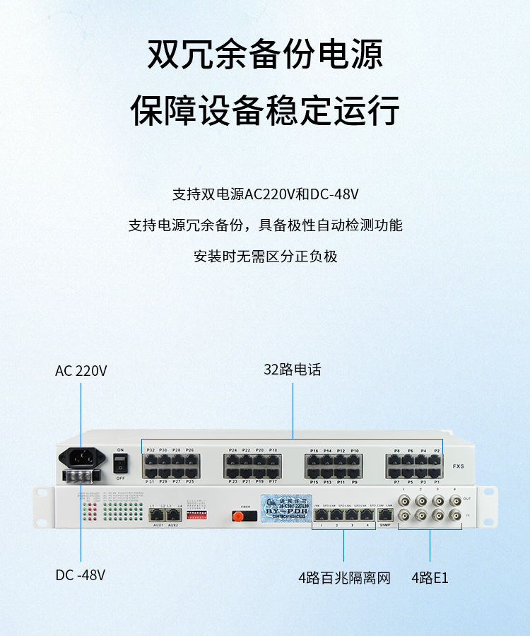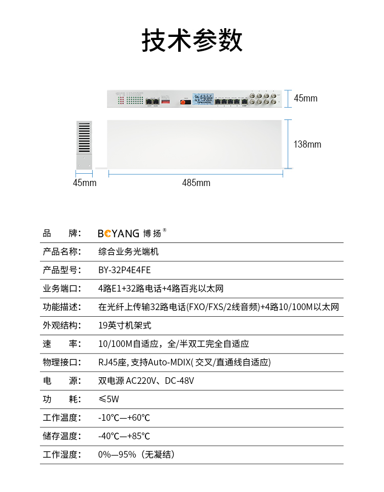 博扬 综合业务电话光端机 4路E1+32路电话+4路百兆以太网 单纤60km 机架式单电源 1对价 BY-32P4E4FE 白色