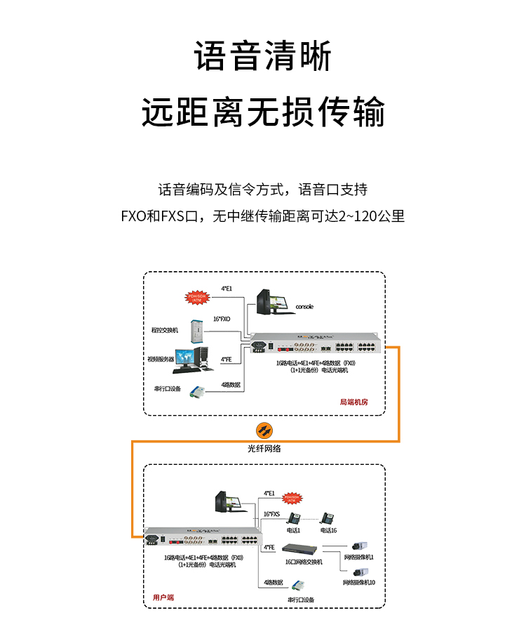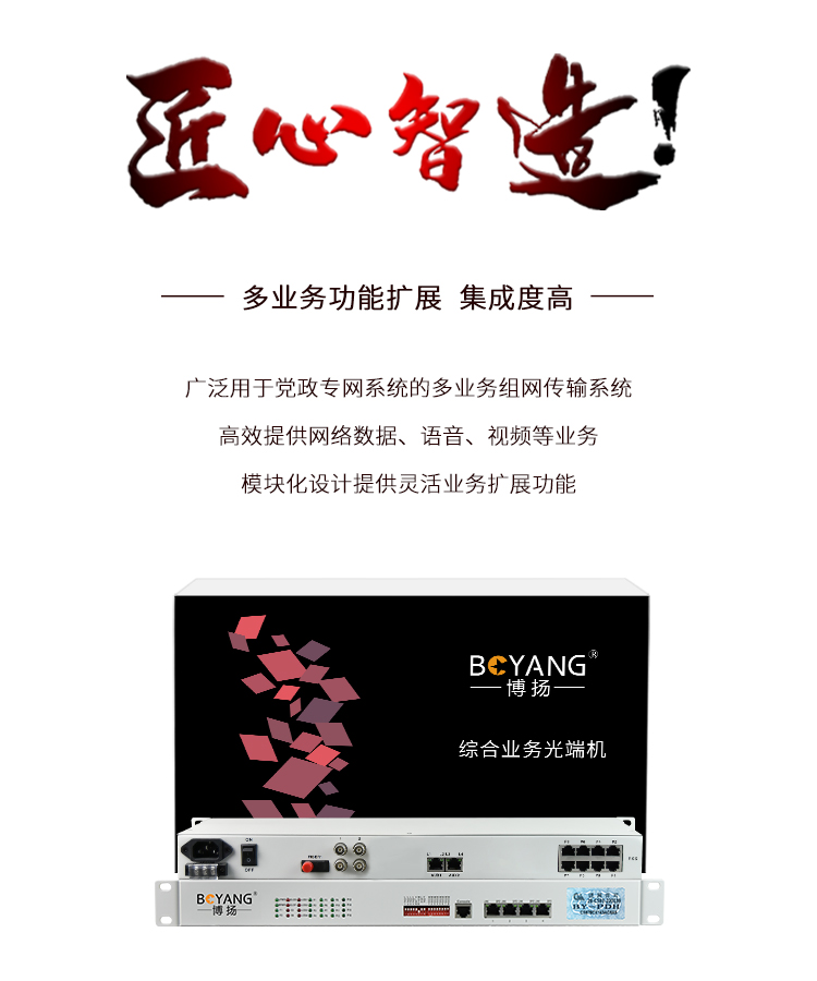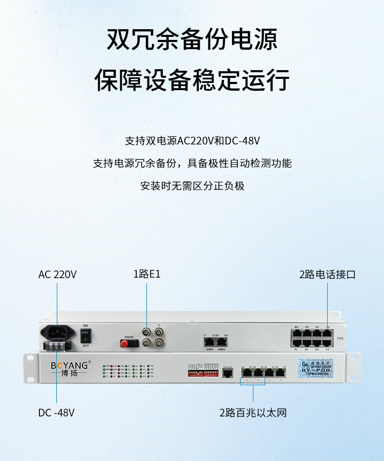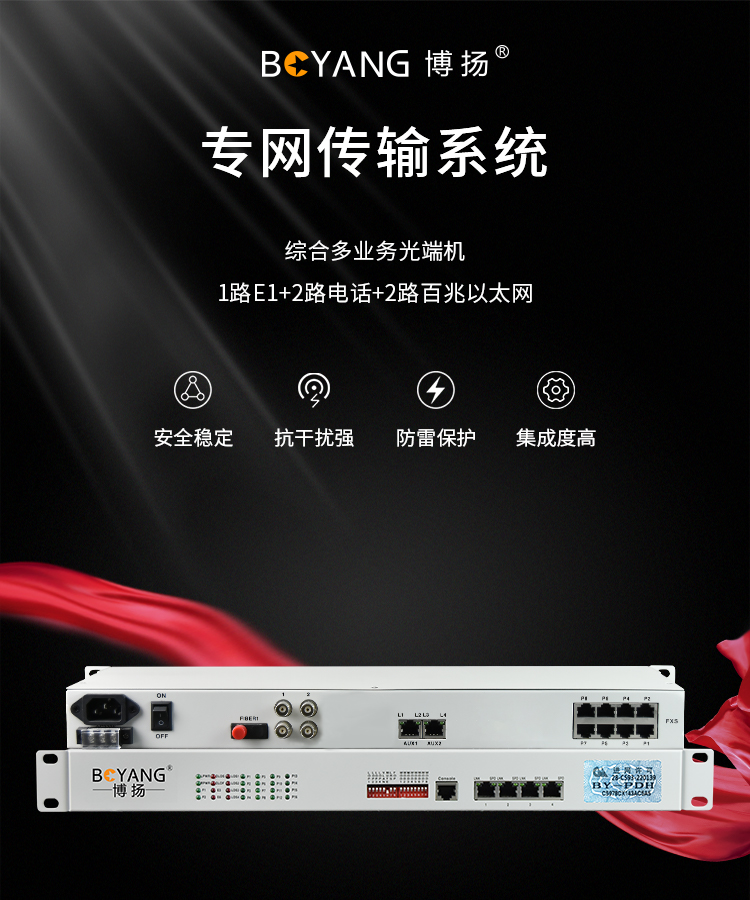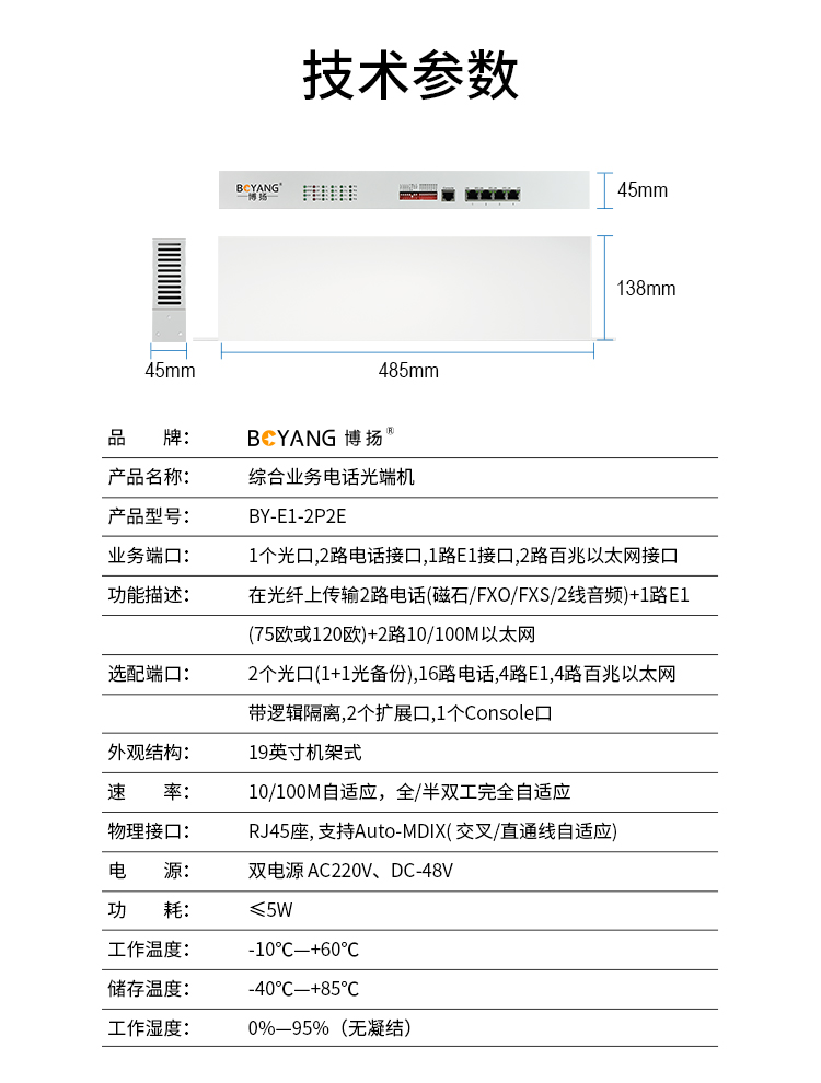 博扬 综合业务电话光端机 1路E1+2路电话+2路百兆以太网 20km FC单纤机架式 48V电源 1对价 BY-E1-2P2E 白色