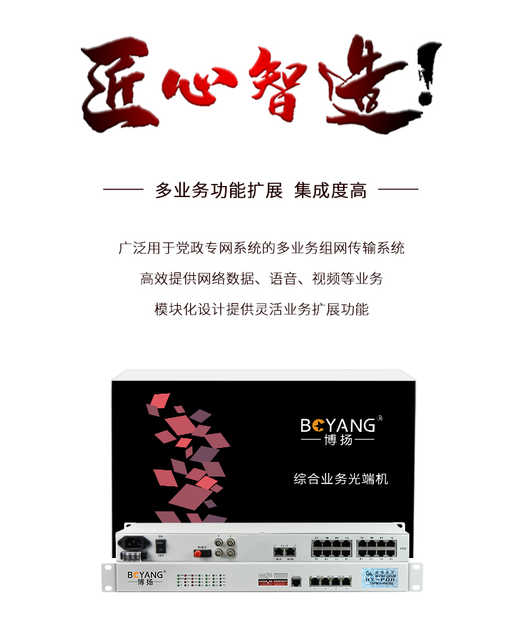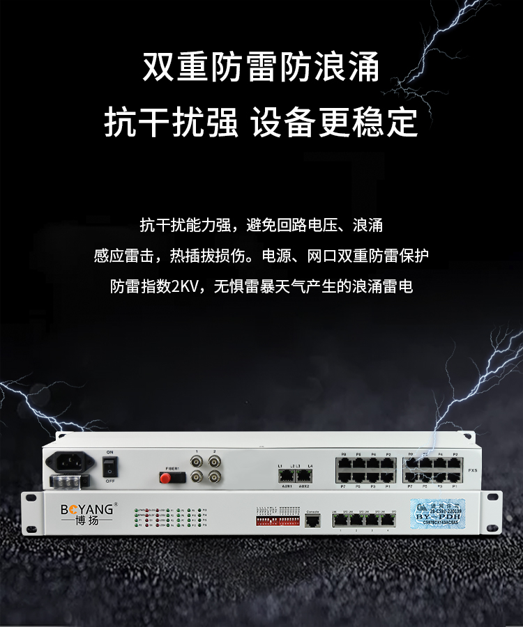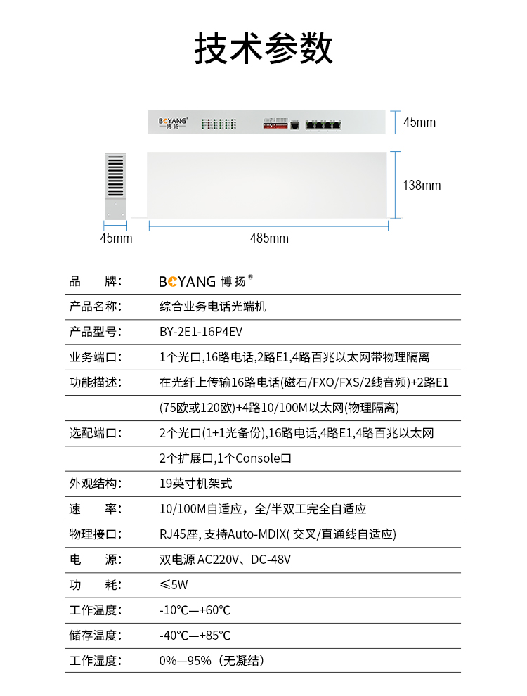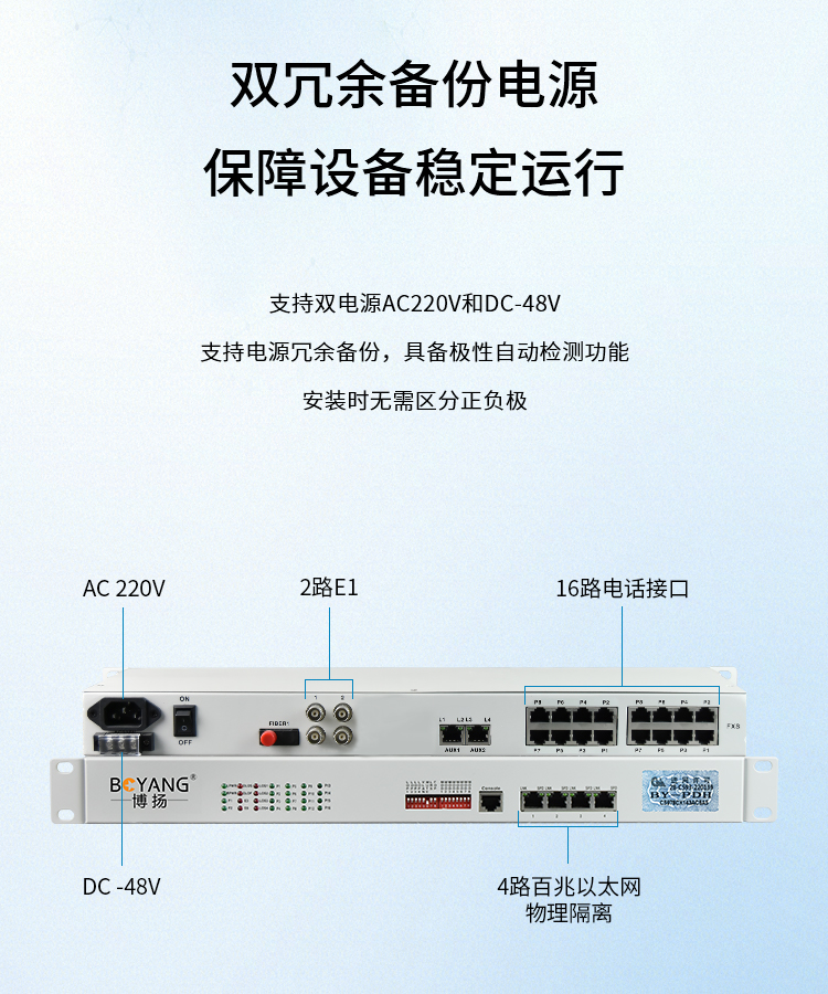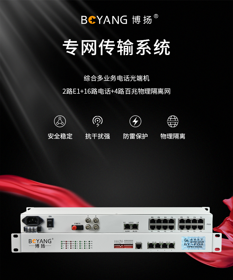 博扬 综合业务电话光端机 2路E1+16路电话+4路百兆物理隔离网 FC单纤40km 机架式 1对价 BY-2E1-16P4EV 白色