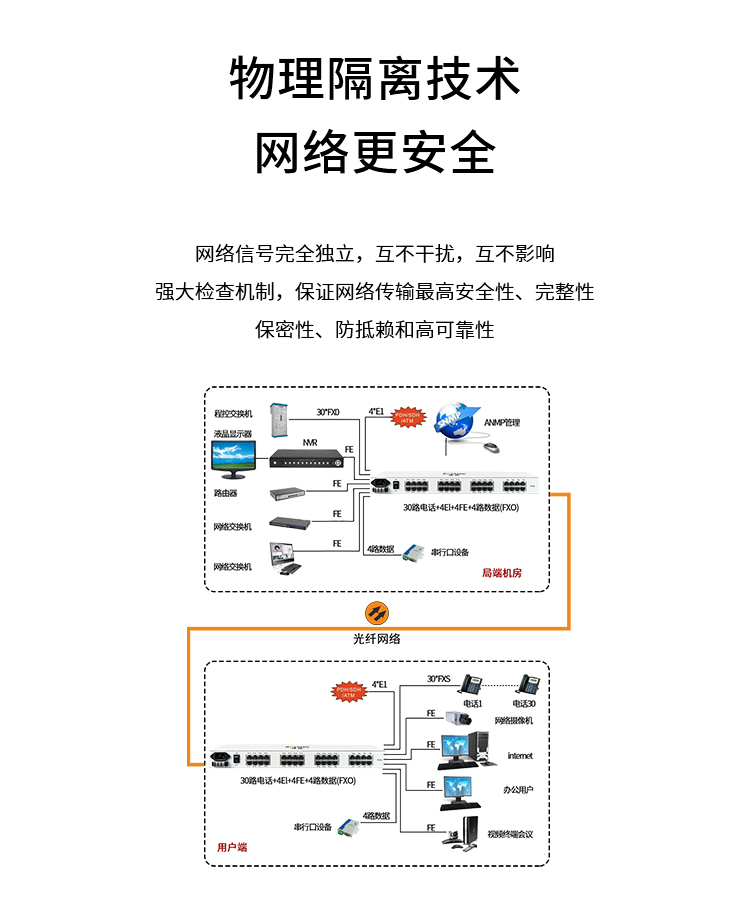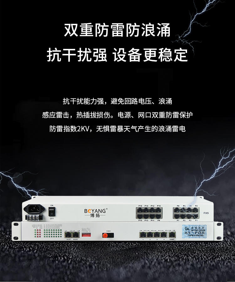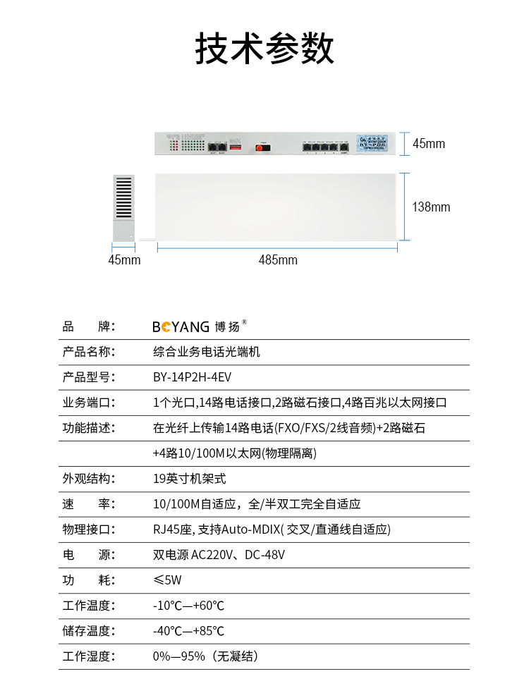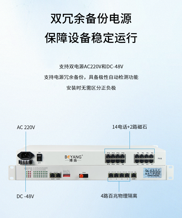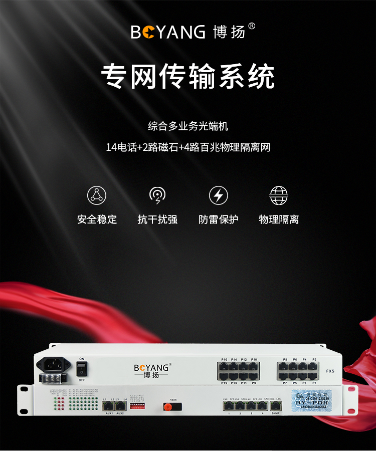 博扬 综合业务电话光端机 14电话+2路磁石(32路电话主板)+4路百兆物理隔离网 单纤20KM机架式1对BY-14P2H-4EV 白色