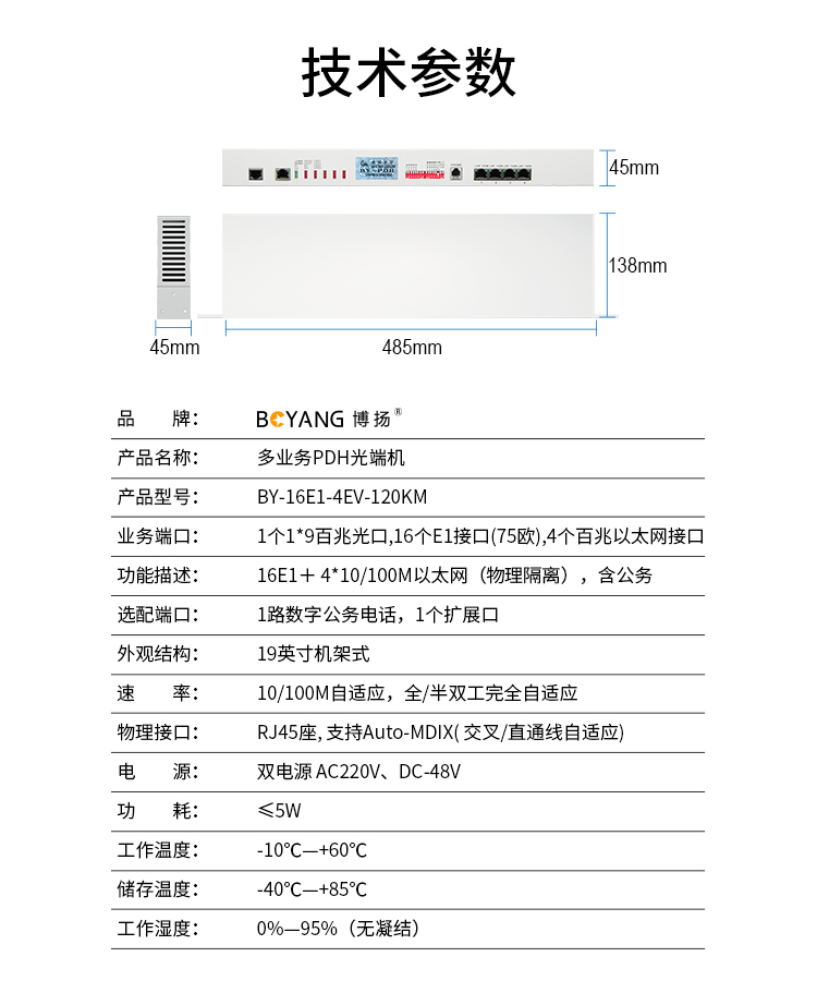 博扬(BOYANG)PDH光端机16E1 16路2M+4路以太网带物理隔离 FC单纤120公里机架式 1对价BY-16E1-4EV-120KM 白色