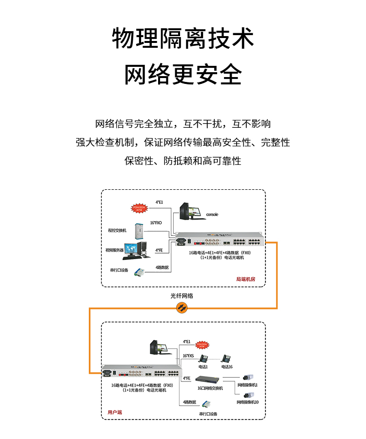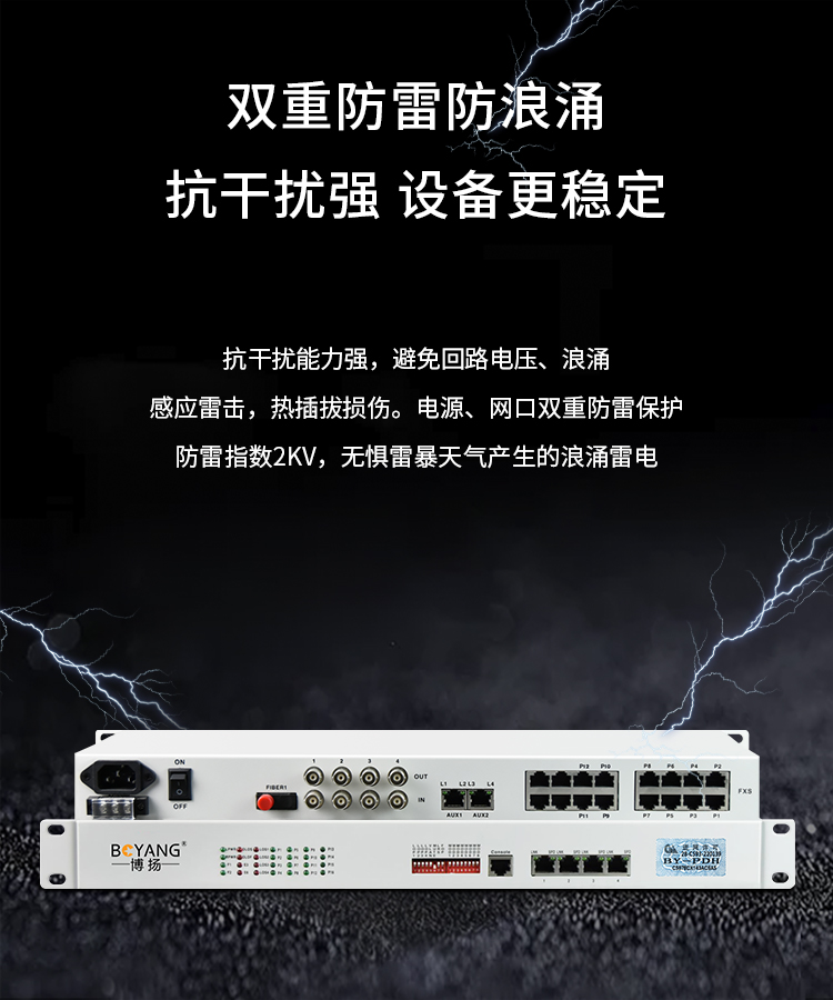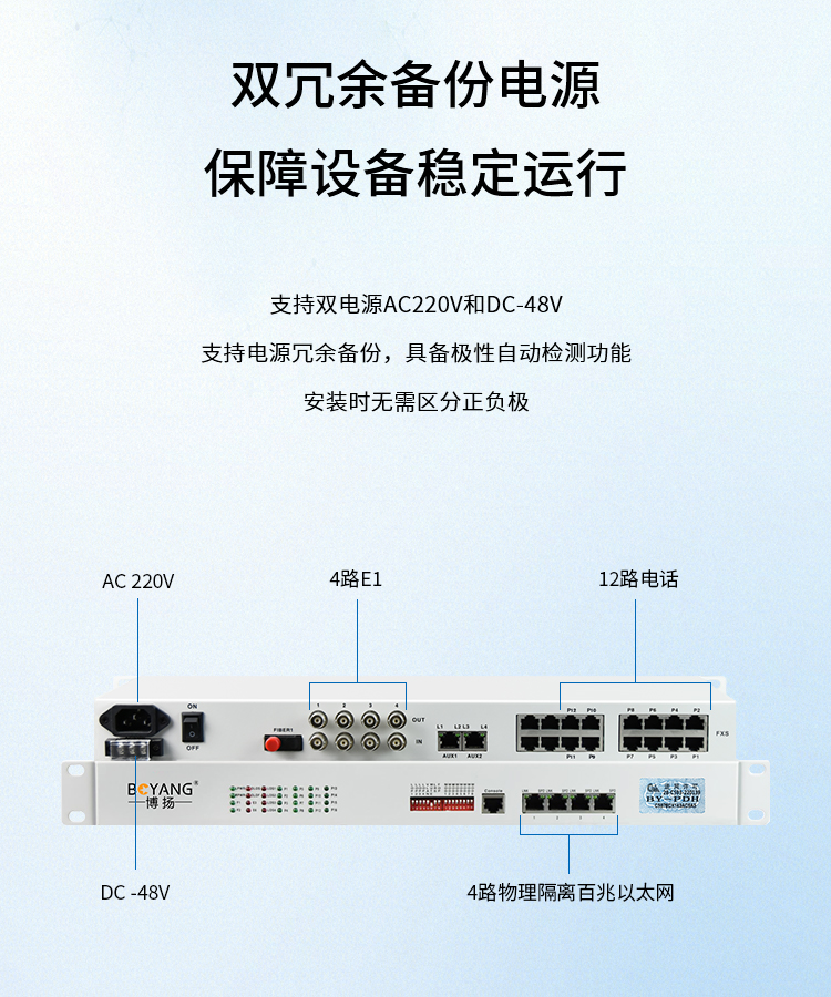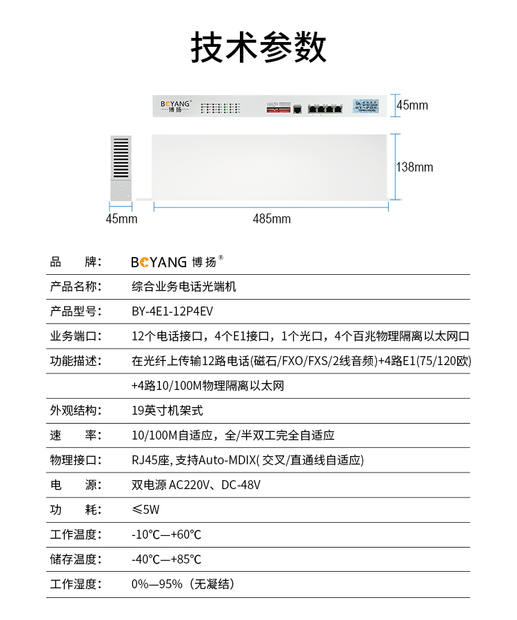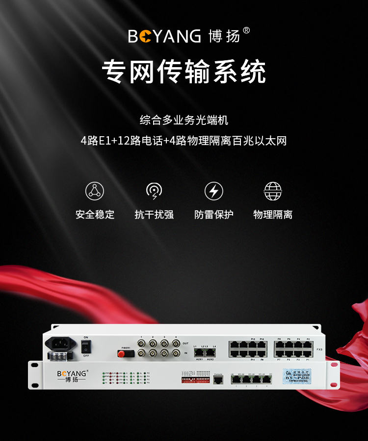 博扬 综合多业务电话光端机 4路E1+12路电话+4路百兆以太网物理隔离 单纤60km机架式 1对价BY-4E1-12P4EV 白色