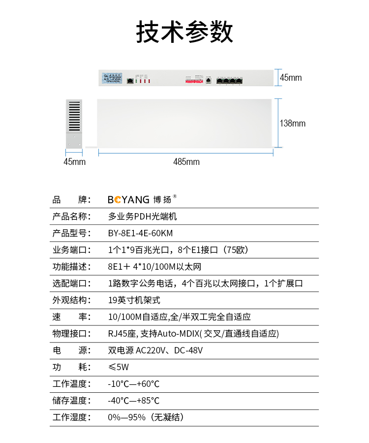 博扬(BOYANG)BY-8E1-4E-60KM PDH光端机8E1 8路2m+4路以太网 FC单纤60公里 机架式双电源 白色