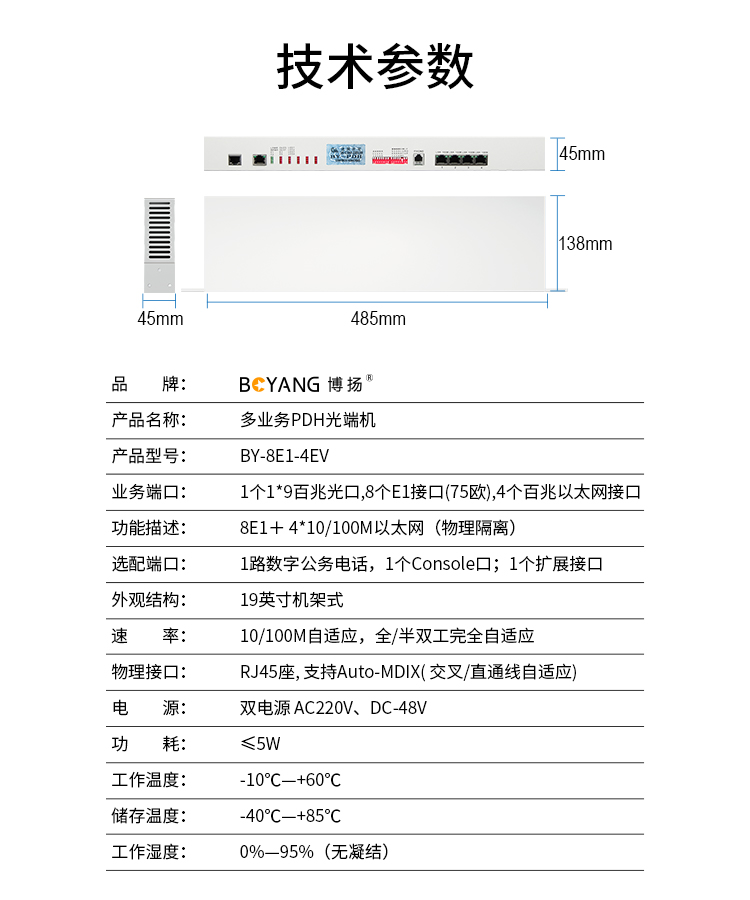 博扬(BOYANG)BY-8E1-4EV PDH光端机8E1 8路2M+4路以太网带物理隔离 FC单纤20公里 机架式 双电源 白色
