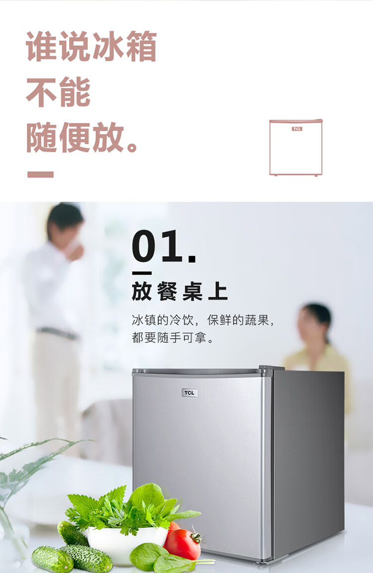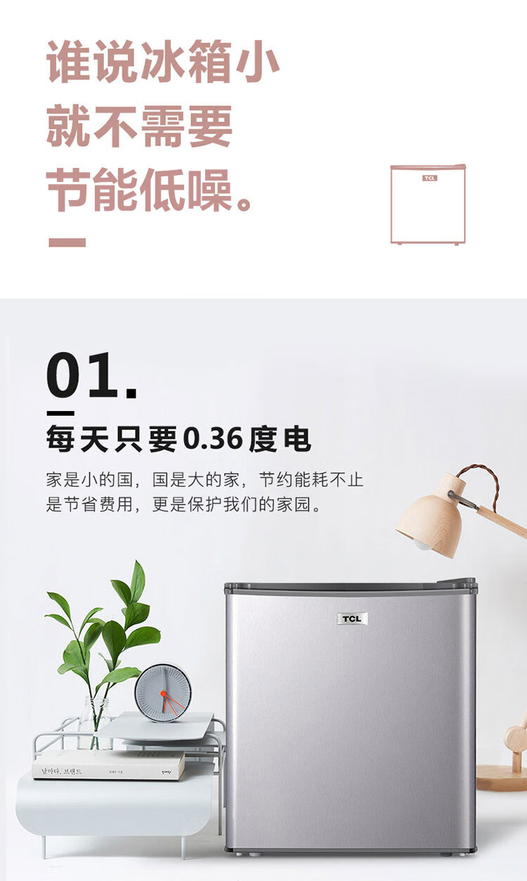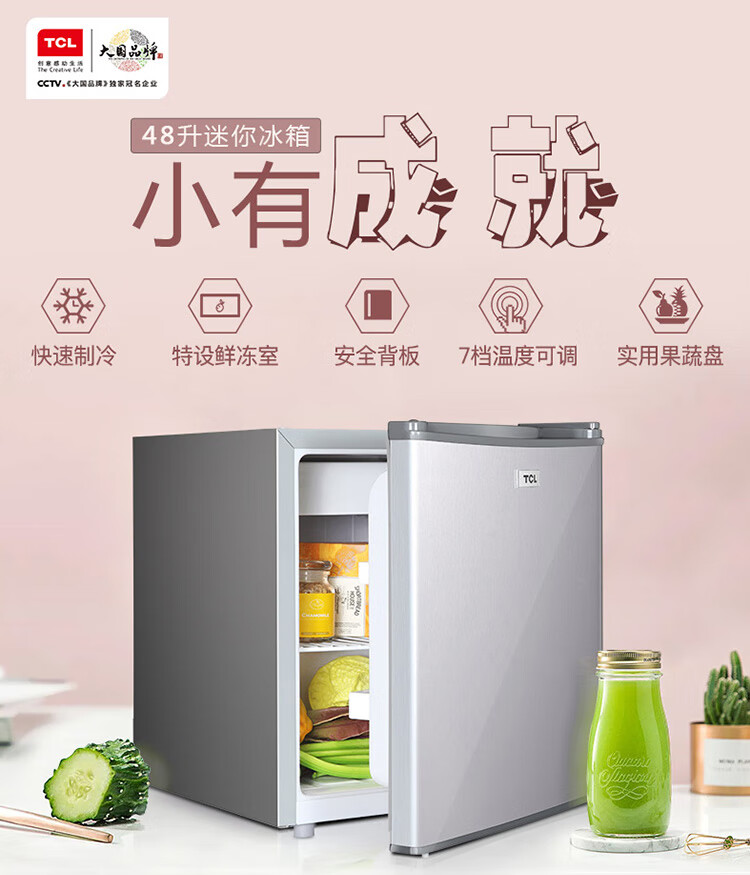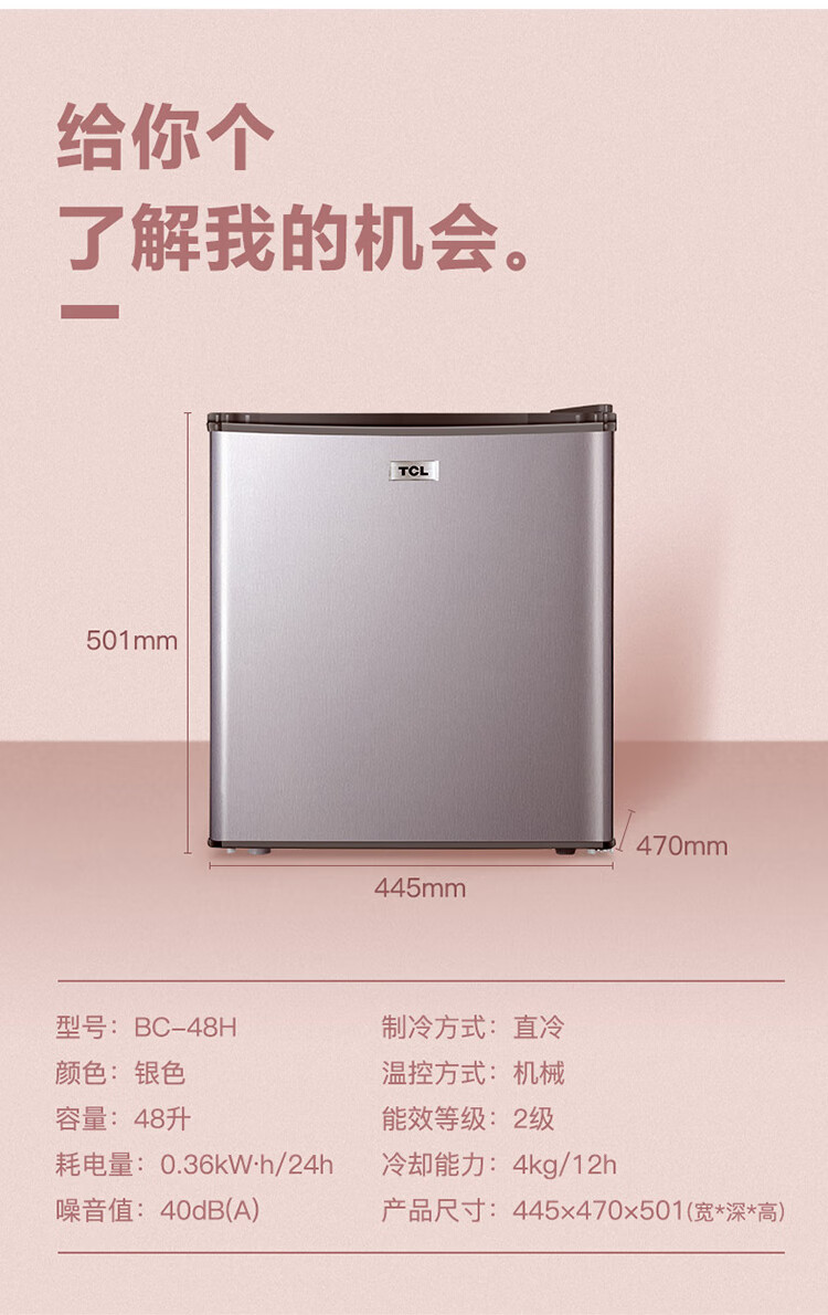 TCL48容量小型酒店冰箱 三级能效 单门直冷快速制冷 7档温度可调 特色鲜冻室BC-48H 台 银色