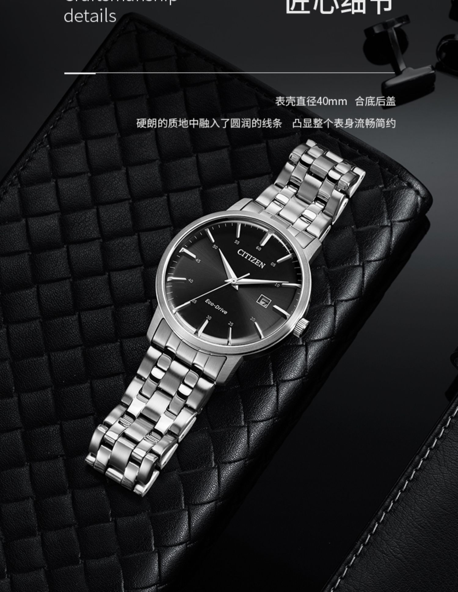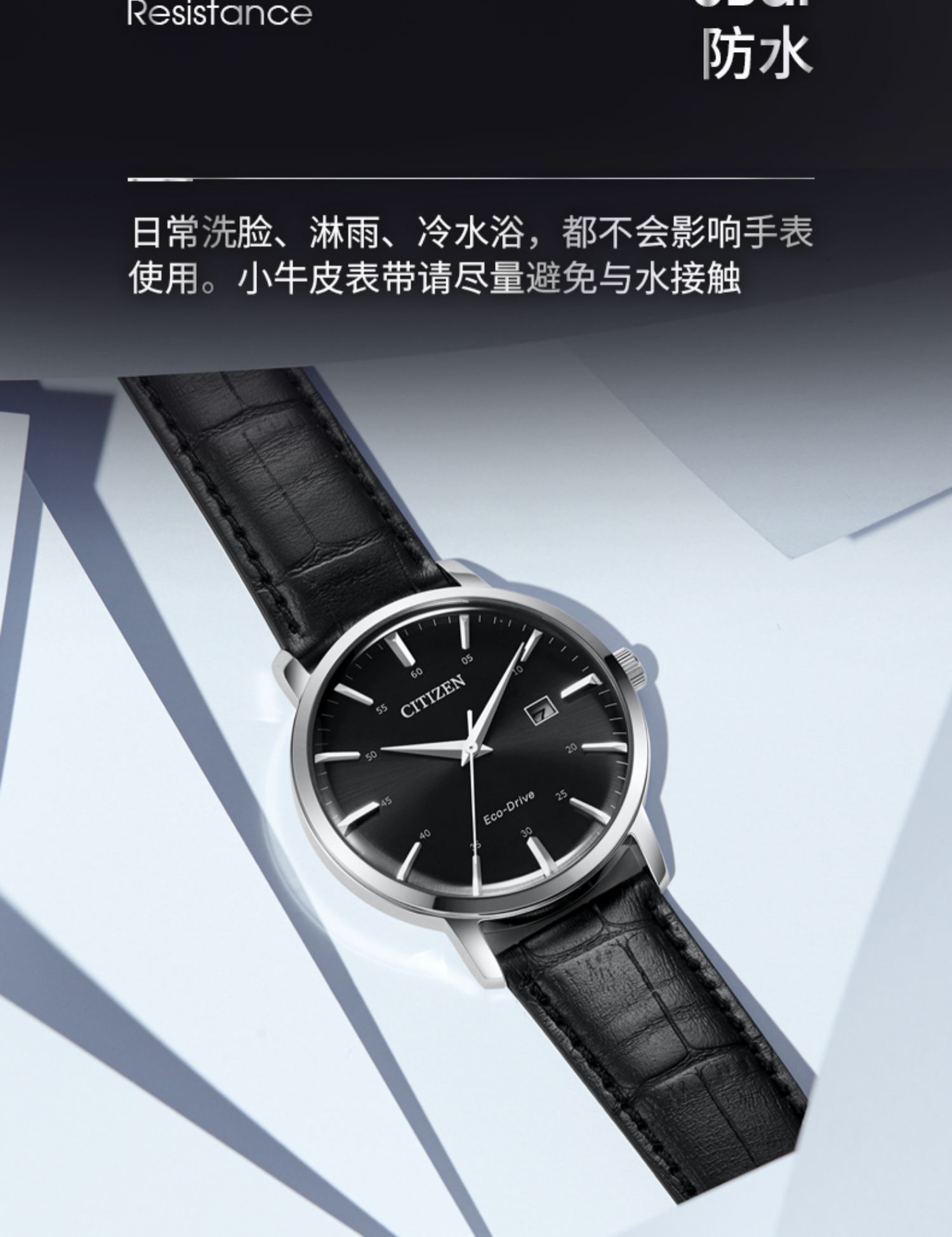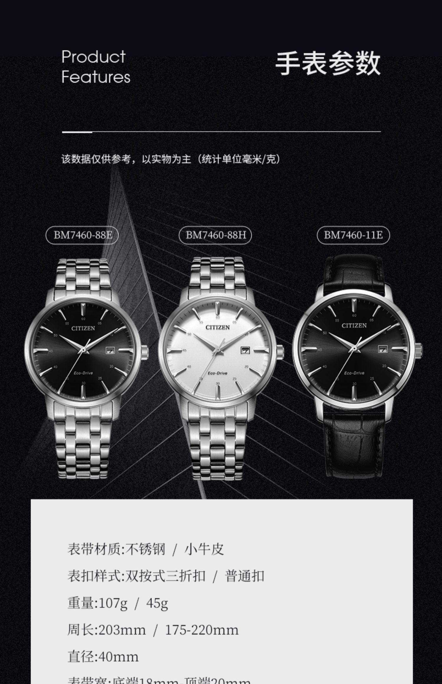 Citizen西铁城 光动能手表日显休闲时尚黑盘皮带男表 BM7460-11E 黑色