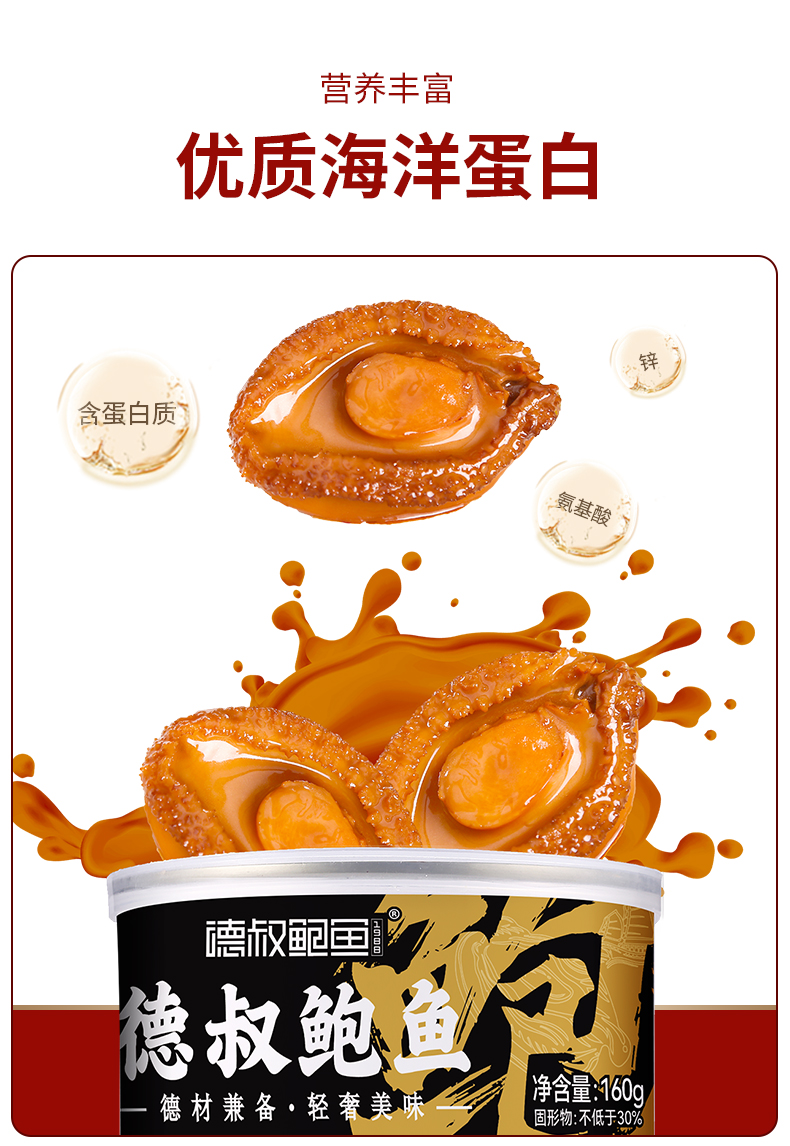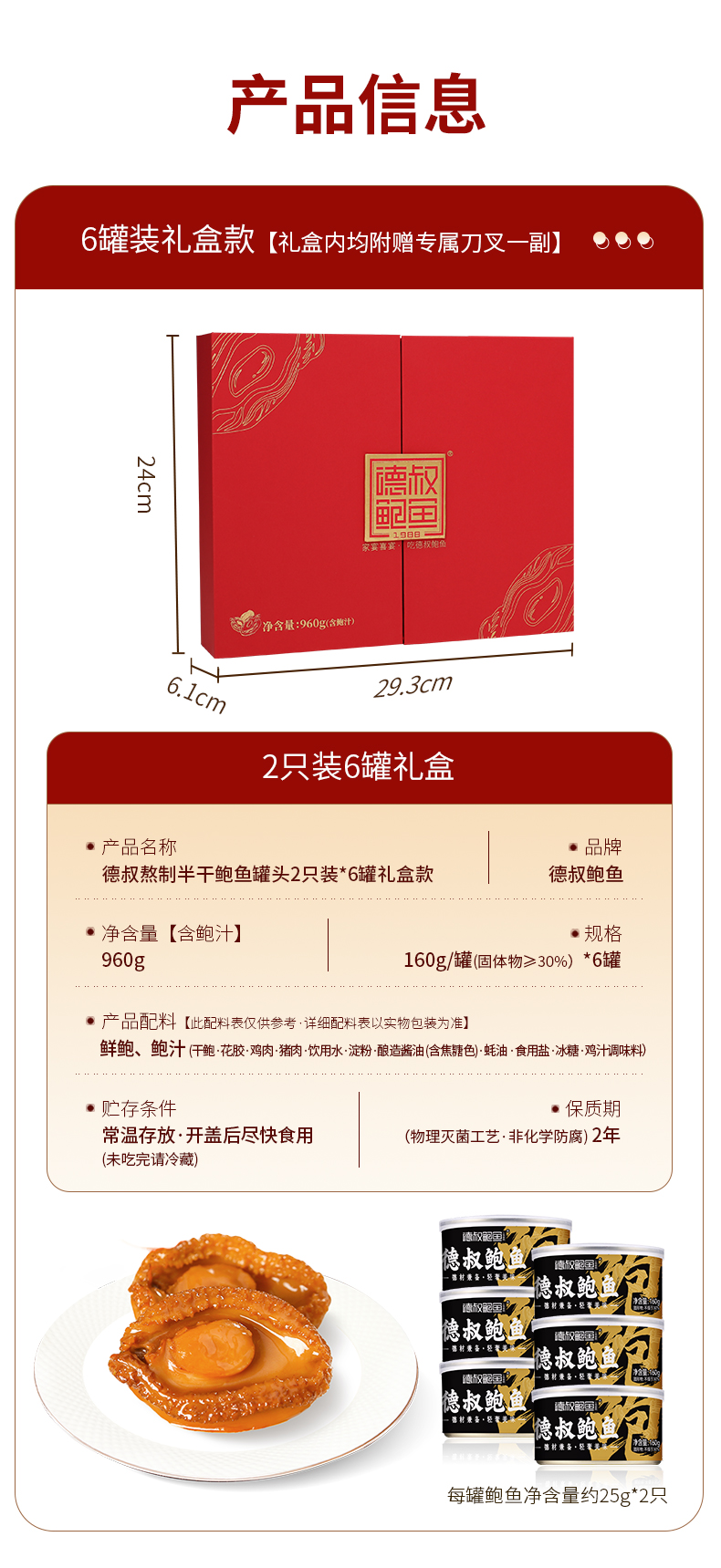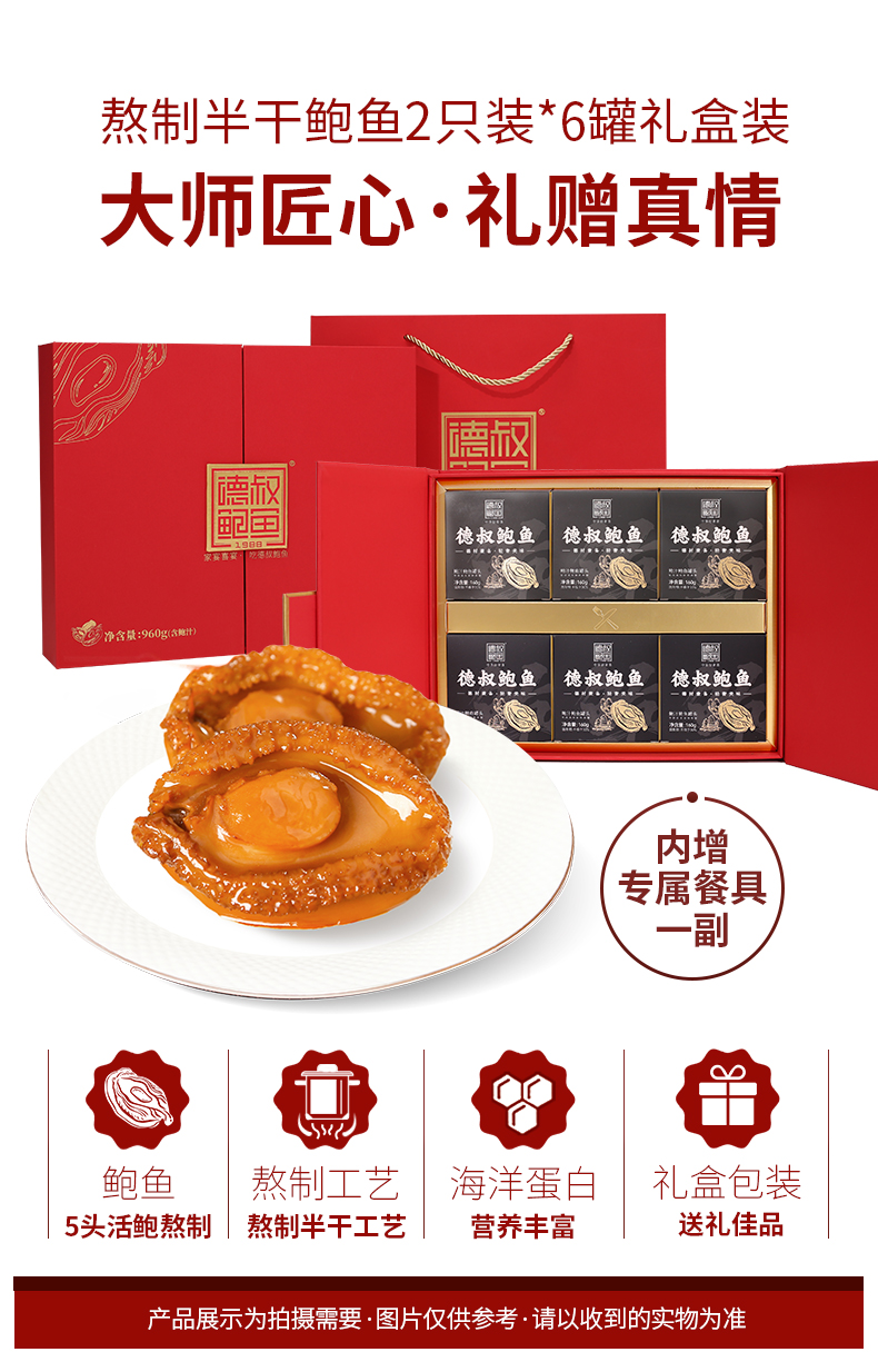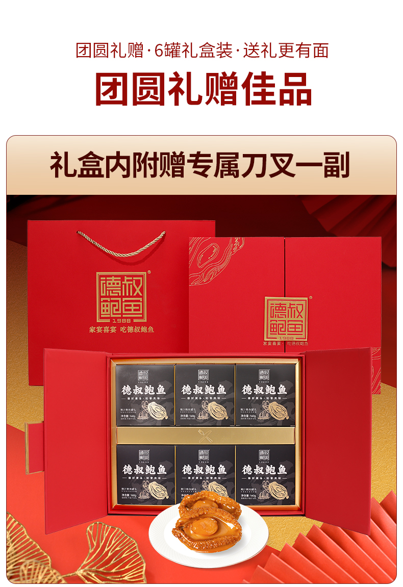 德叔鲍鱼 鲍汁鲍鱼罐头2只装(5头大鲍)*6罐960g礼盒款 红色