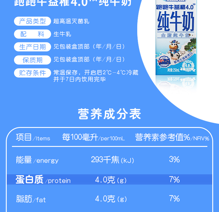 纽麦福跑跑牛4.0g蛋白儿童纯牛奶250ML*10/提礼盒装 本白色
