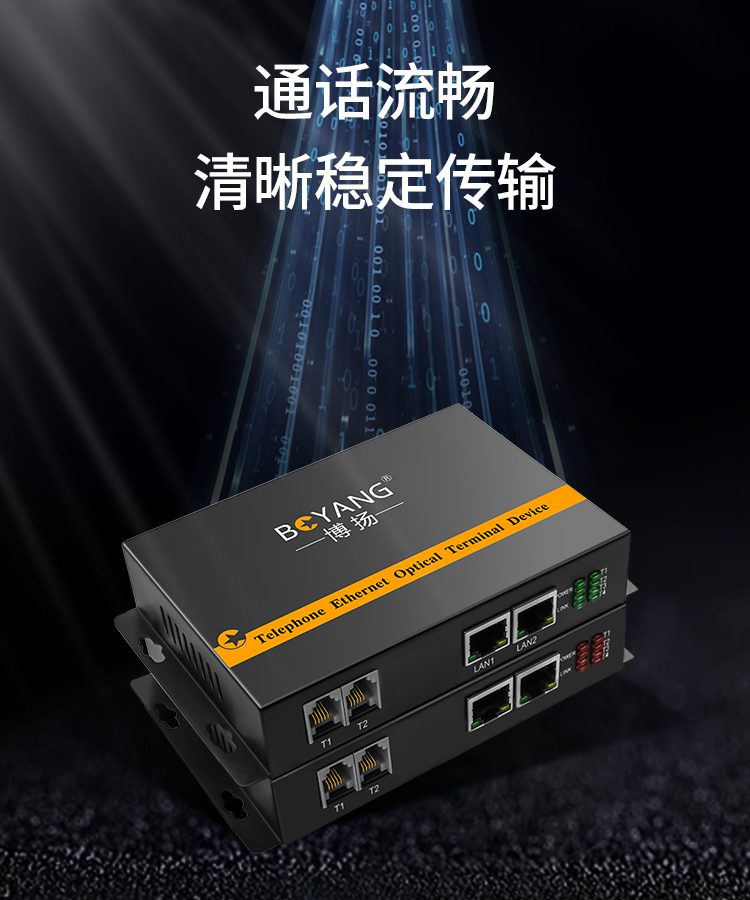 博扬 综合业务数字电话光端机 2路电话+2路百兆网络 对讲音频加以太网 单模单纤20km 1对BY-2P2E 黑色