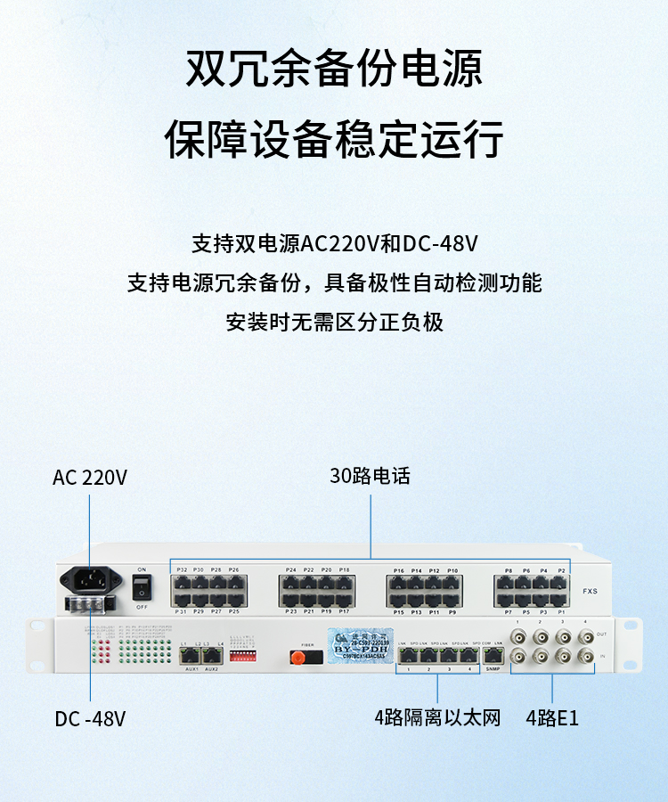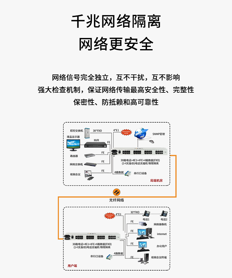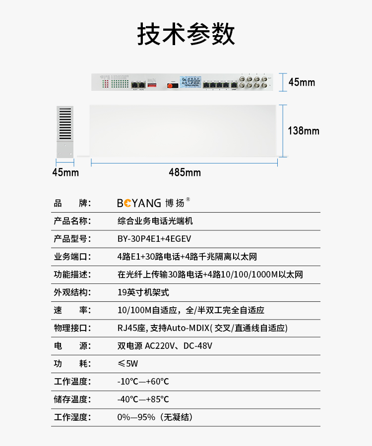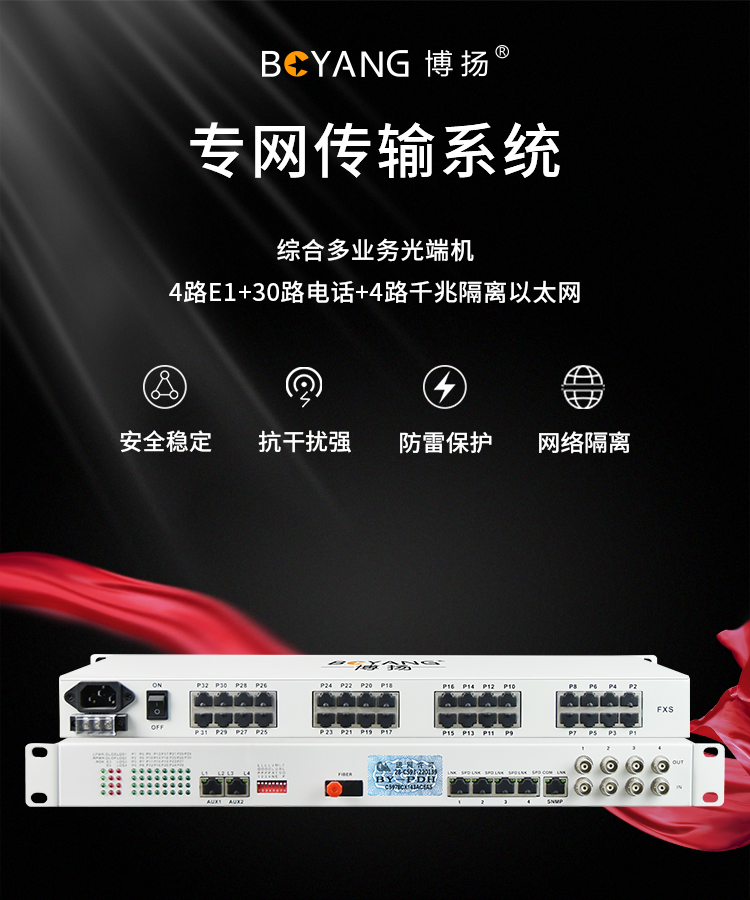 博扬 综合业务光端机 4路E1+30路电话+4路千兆隔离以太网 单纤40km 机架式 1对BY-30P4E1+4EGEV 白色