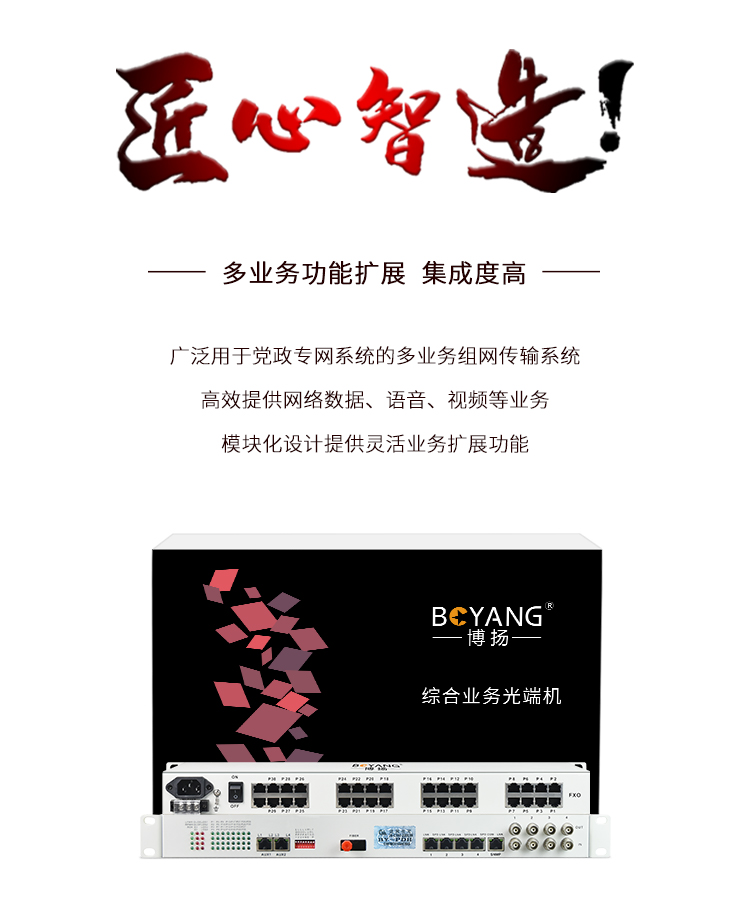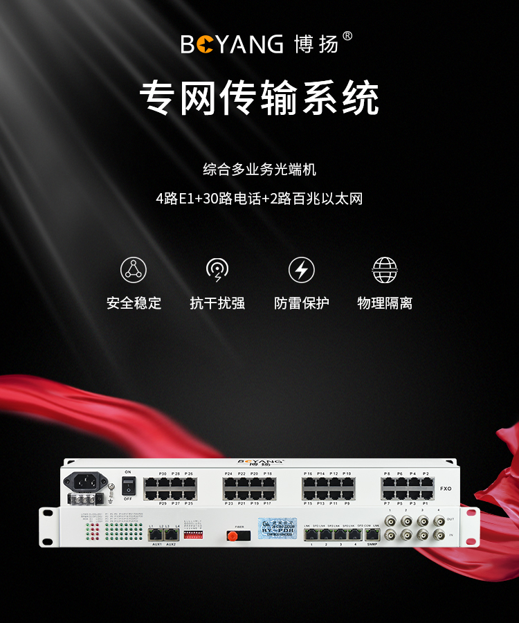 博扬 综合业务电话光端机 4路E1+30路电话+2路百兆以太网物理隔离 单纤40km 机架式 1对价BY-4E1-30H-2E 白色