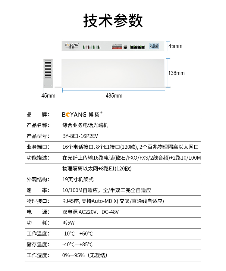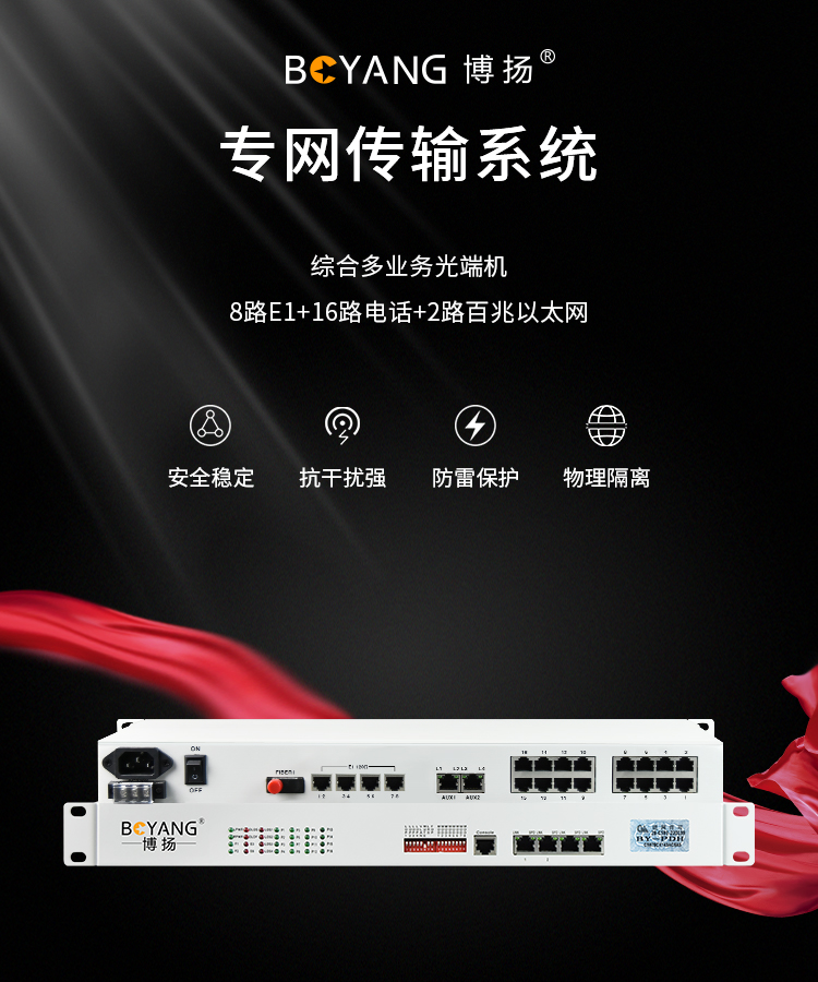 博扬 综合业务电话光端机 8路E1+16电话+2路百兆以太网物理隔离 单纤20km 机架式 1对价BY-8E1-16P2EV 白色