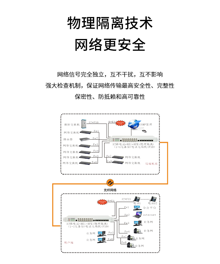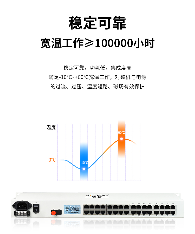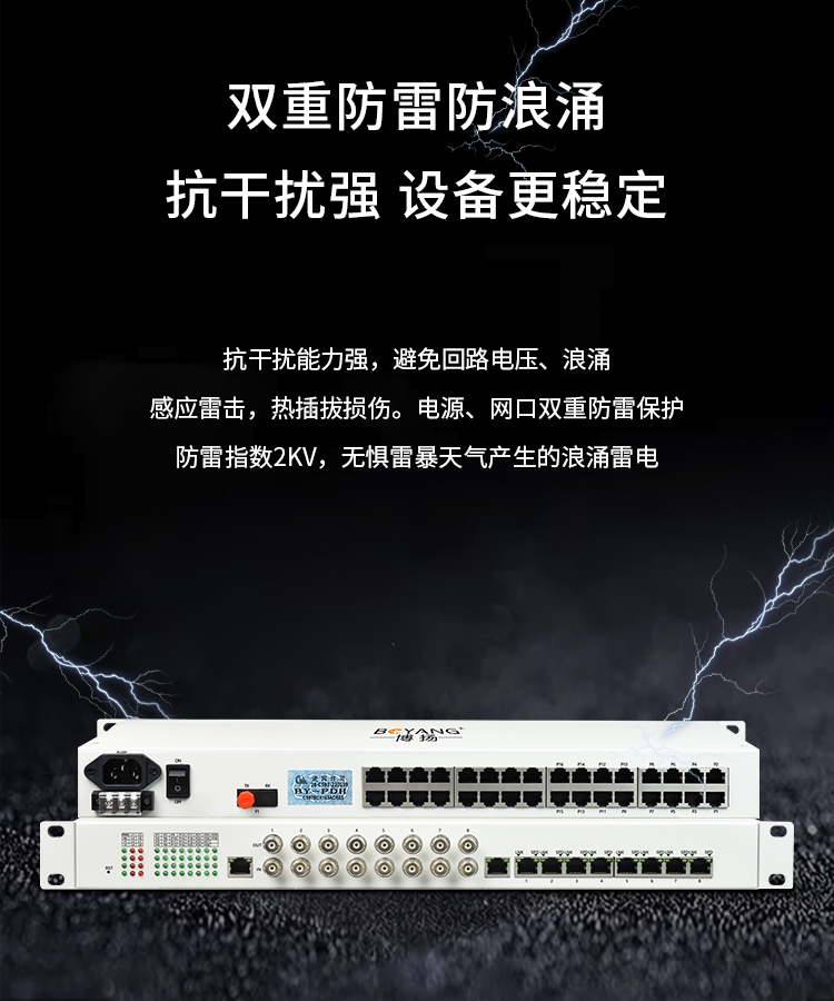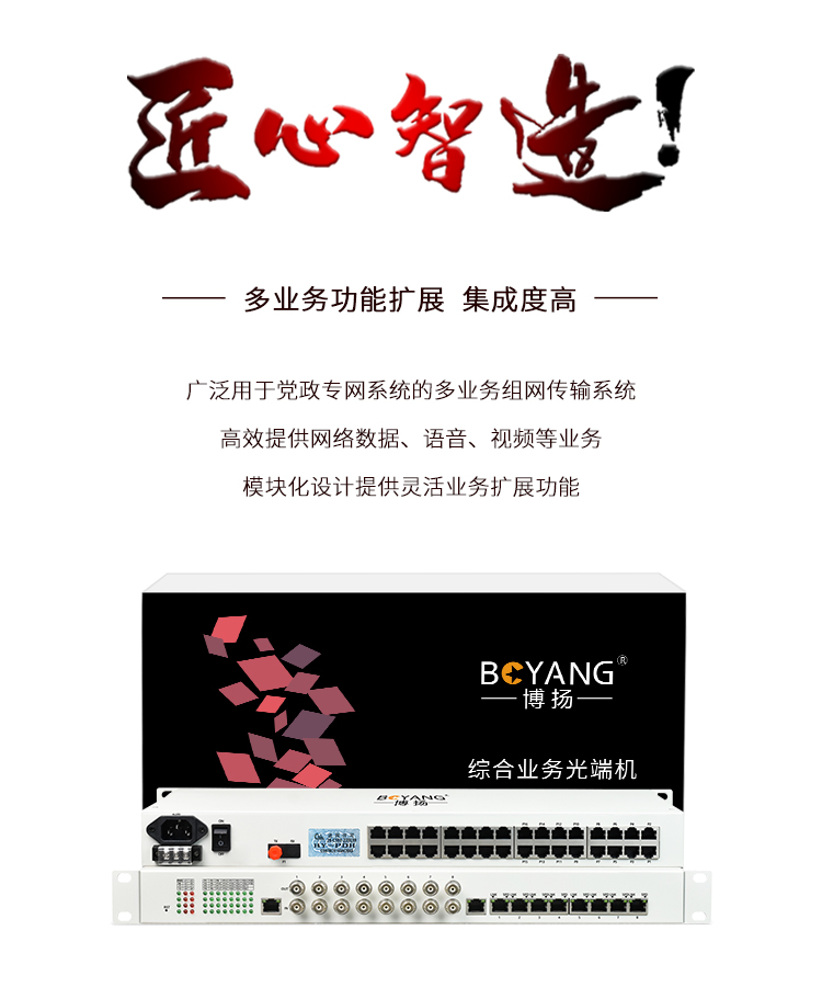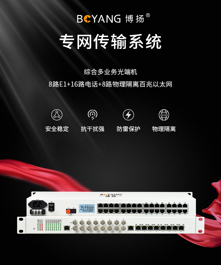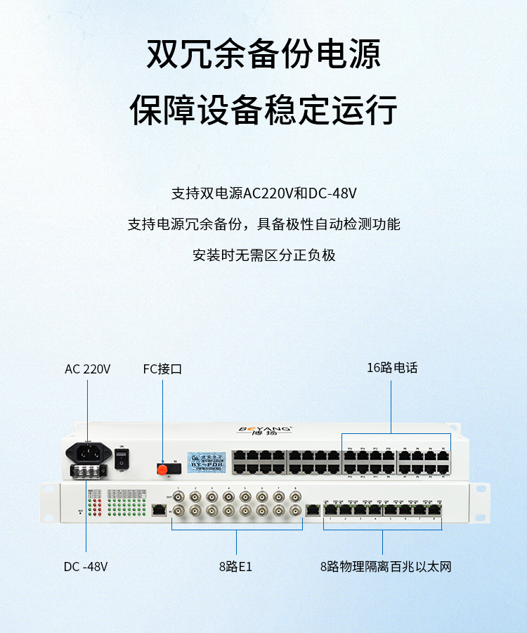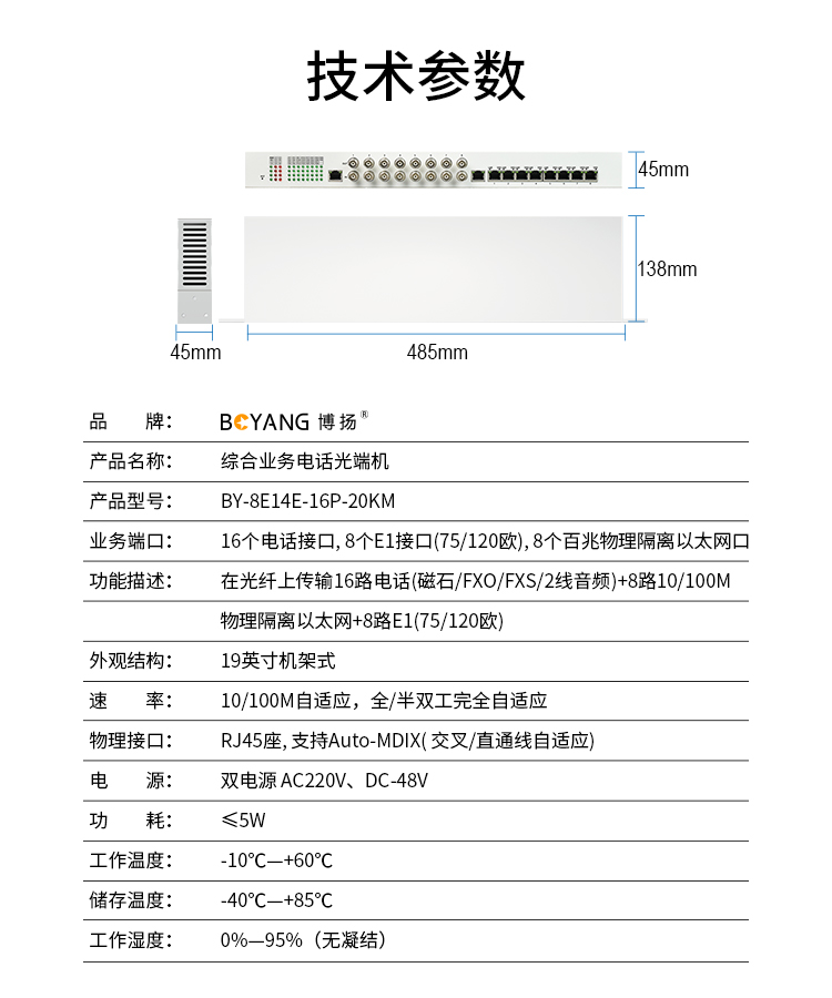 博扬 综合业务电话光端机 8路E1+16路电话+8路百兆以太网物理隔离 单纤20km 机架式 1对价BY-8E14E-16P-20KM 白色