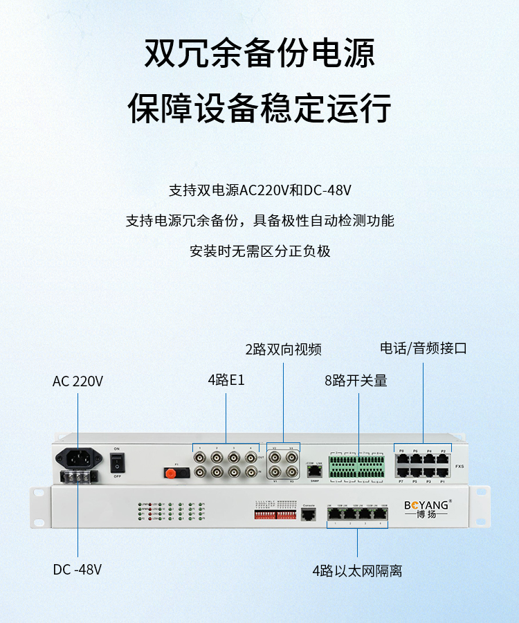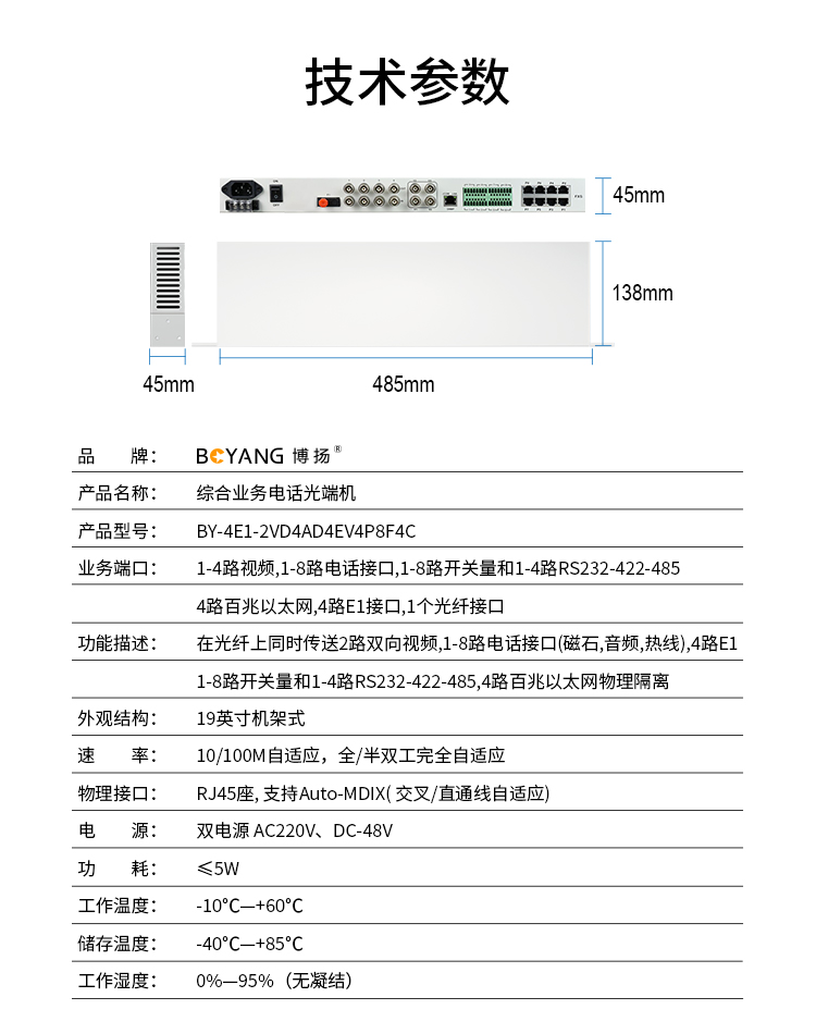 博扬 综合业务电话光端机 4路E1+4路电话+4路以太网隔离+2路双向视频+4路双向音频+8路开关量+4路RS485 1对 白色
