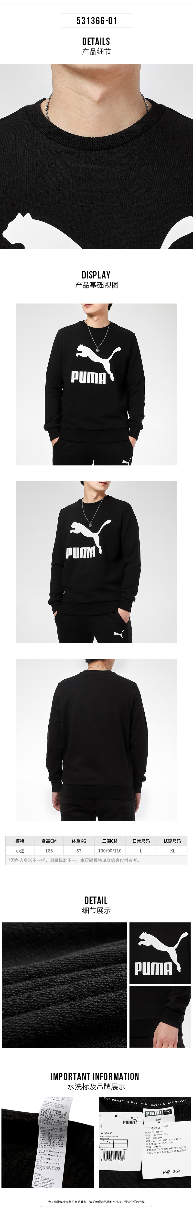 彪马(PUMA)男装卫衣 秋冬季新款户外运动服针织加绒保暖圆领休闲套头衫 531366-01 黑色 M