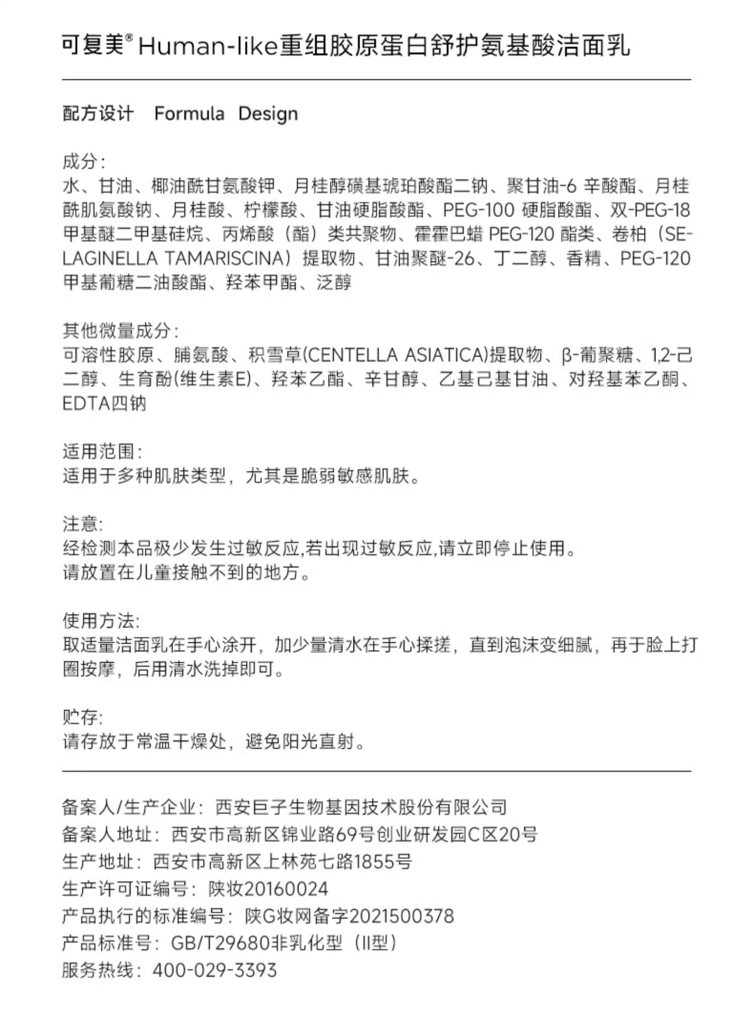 可复美重组胶原蛋白舒护氨基酸洁面乳120g(单位:支)