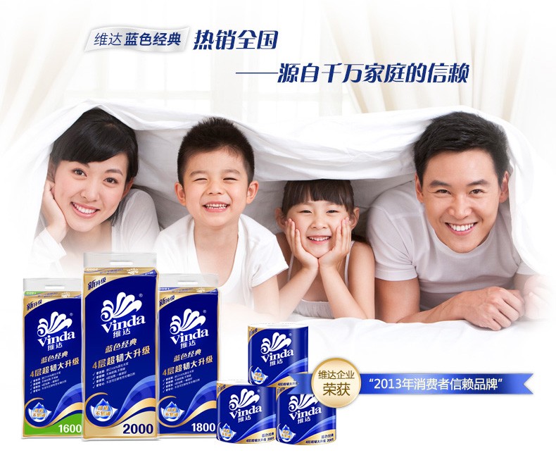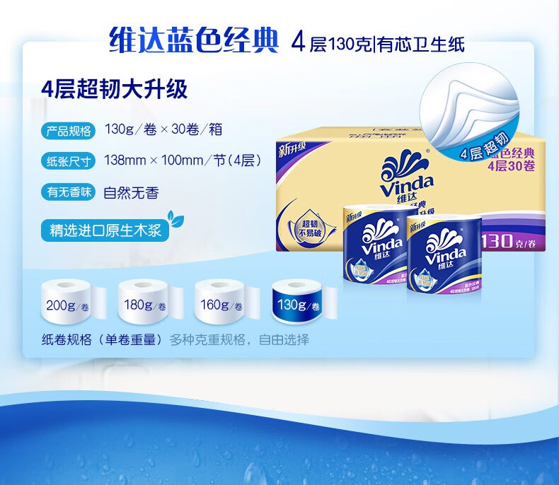 维达 卷纸4层130克加厚蓝色经典有芯卷筒纸卫生纸有芯卷纸30卷(单位:箱) 宝石蓝