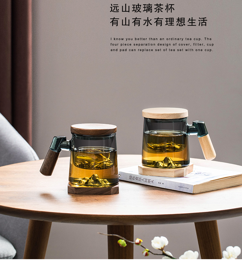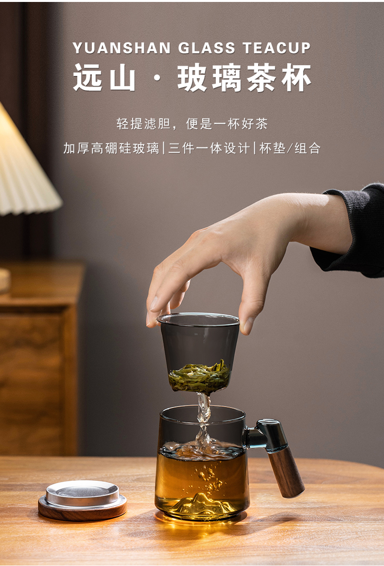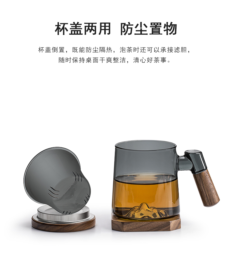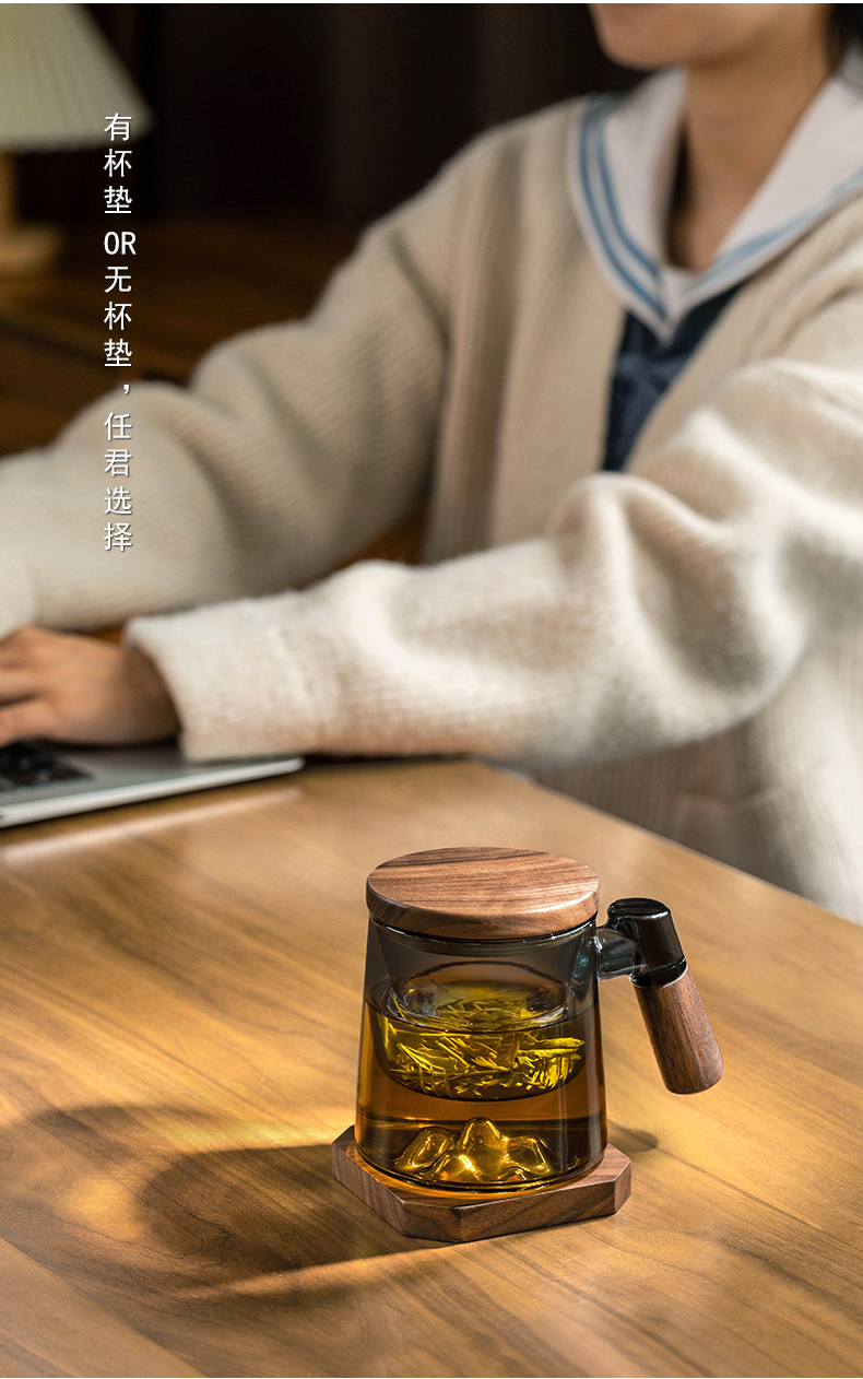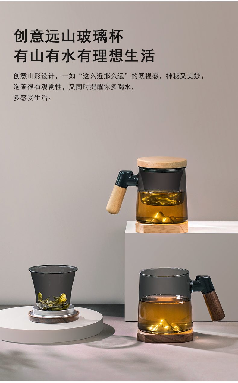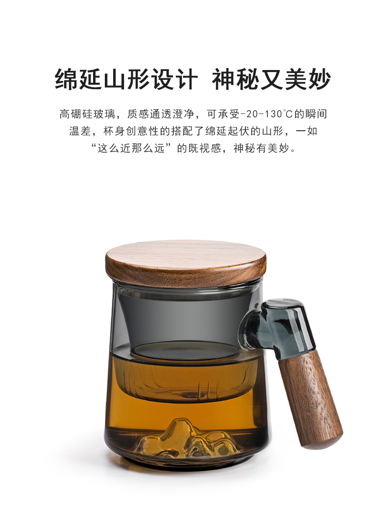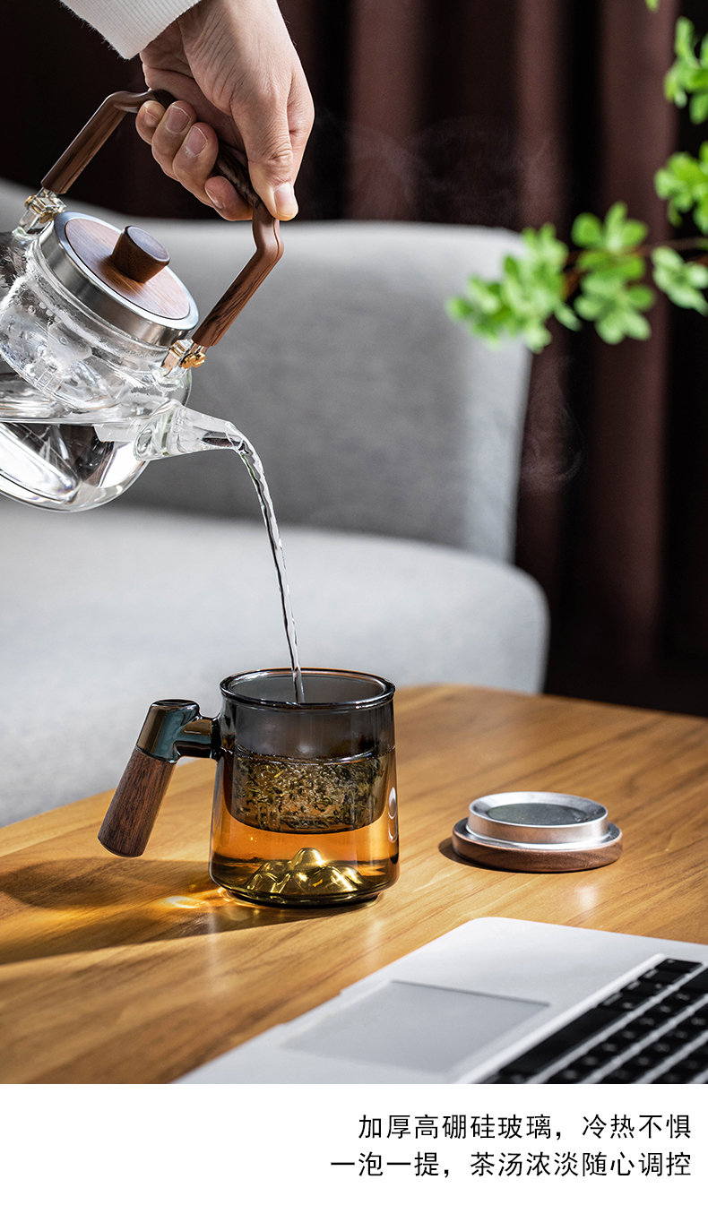 叁旬日式玻璃远山水杯加厚耐热办公室泡茶杯茶水分离个人专用喝茶杯远山玻璃茶杯【胡桃木】(单位:个) 褐色