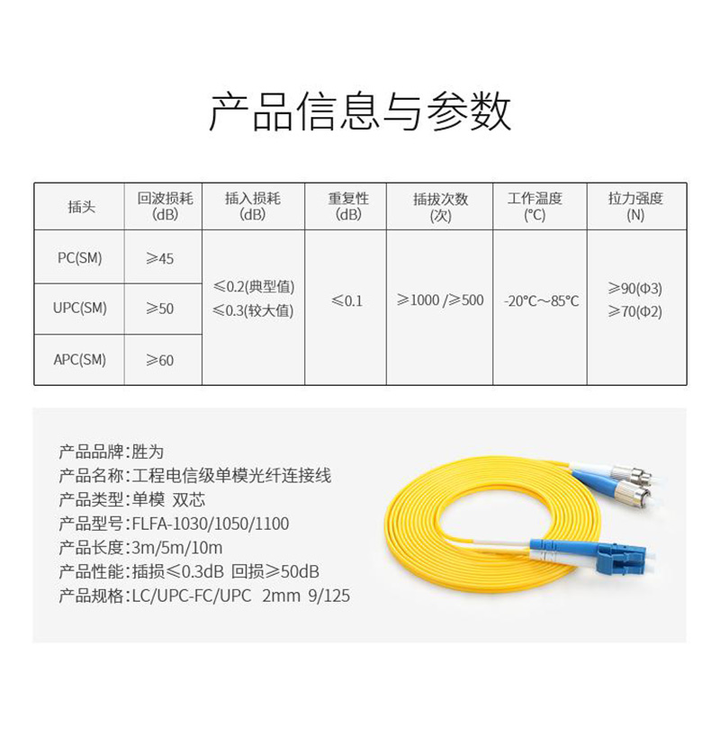 胜为 SHENGWEI FLFA-1030 工程电信级光纤跳线 LC(UPC)-FC(UPC)单模双芯 3米 随机