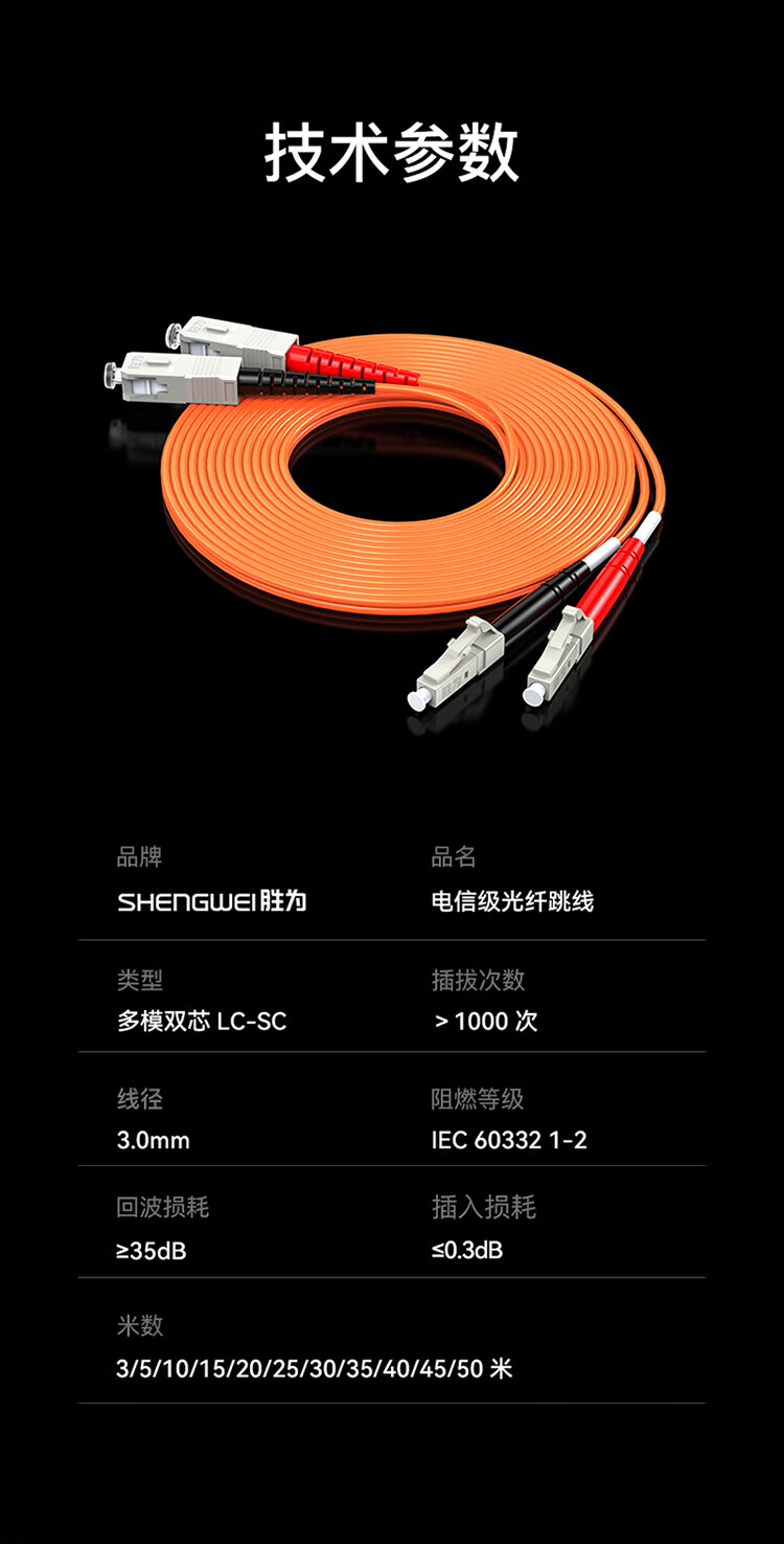 胜为 SHENGWEI FMC-1805 电信级光纤跳线 LC-SC多模双芯尾纤40米/对 交换机/光纤盒连接线 随机