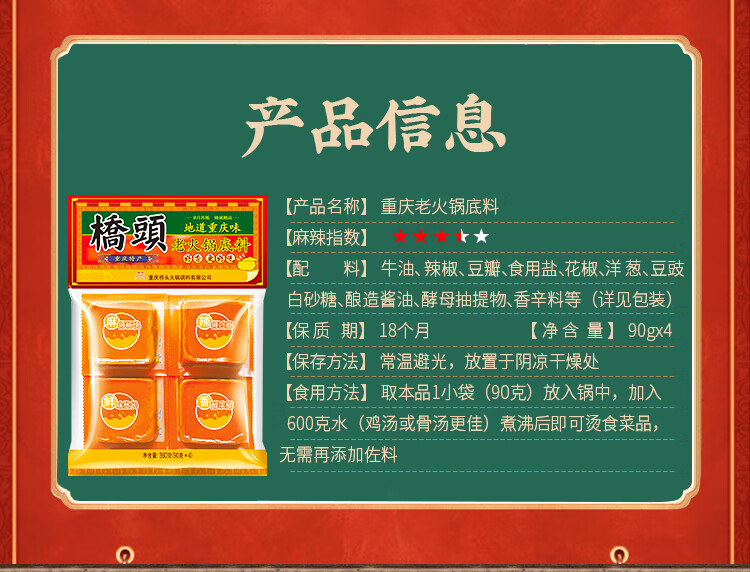 桥头360g地道重庆味老火锅底料(90*4)(单位:袋) 红色