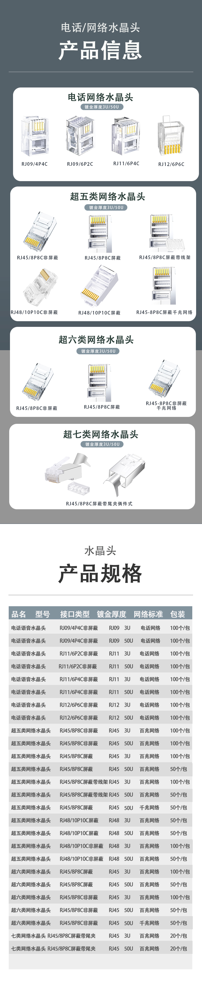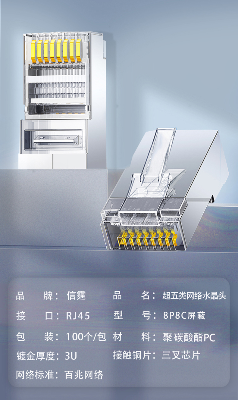信霆 RJ458P8C10 超五类 3U屏蔽 水晶头 银色 100个/包 无色