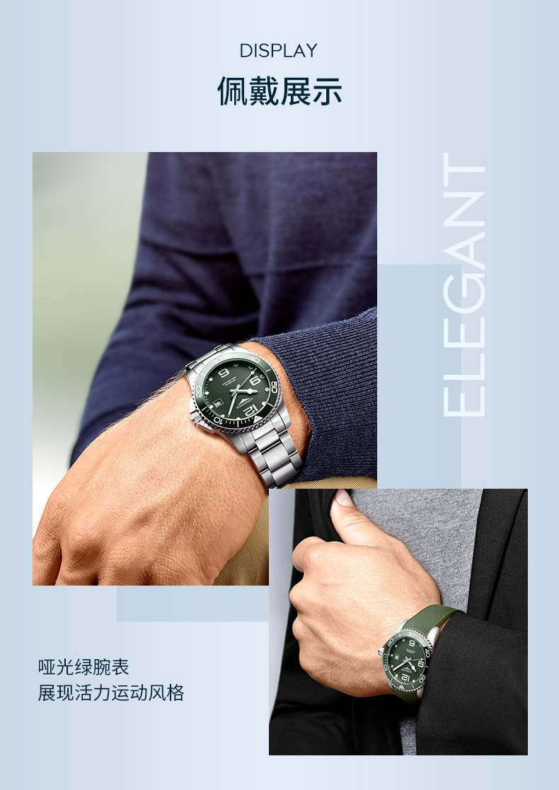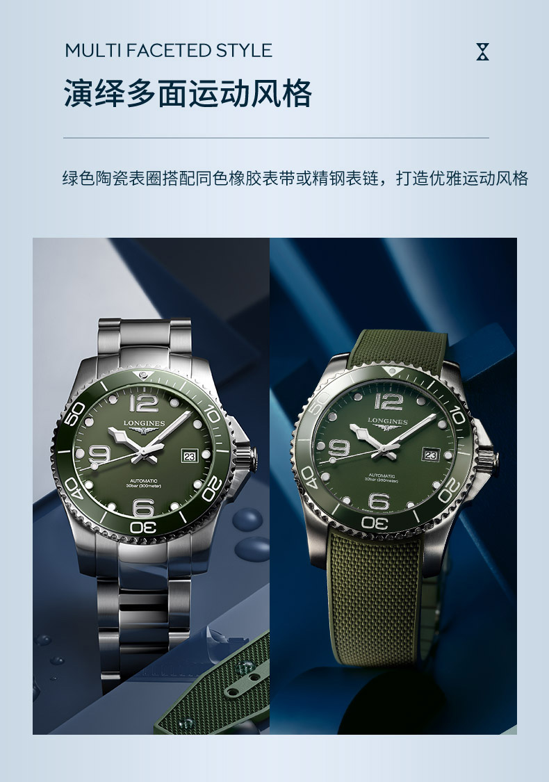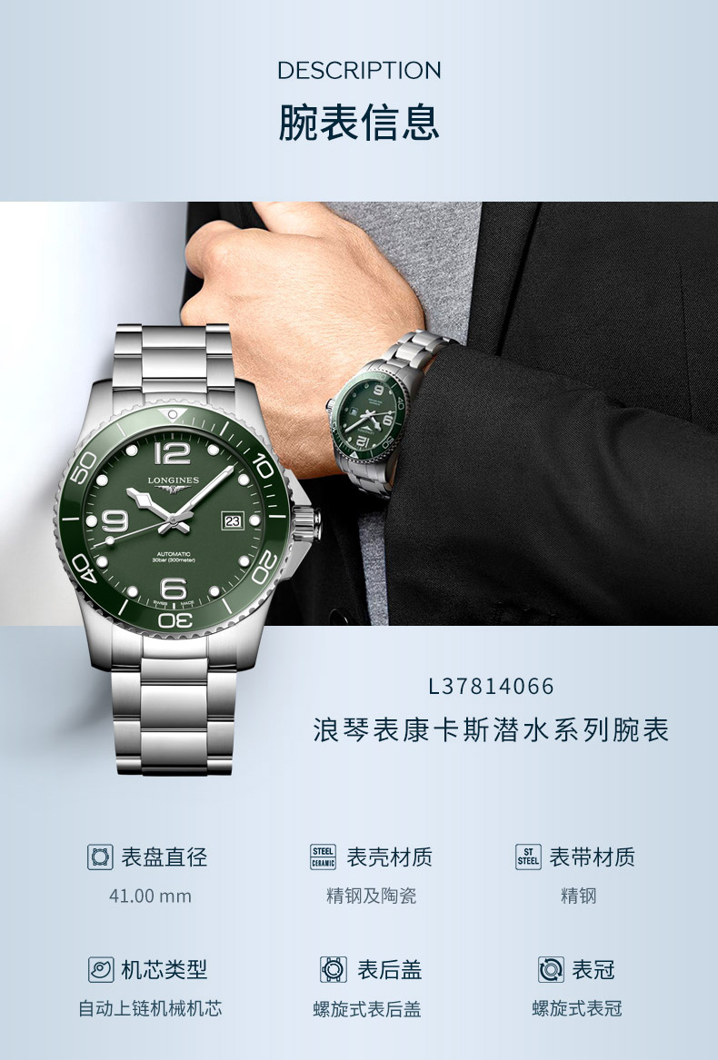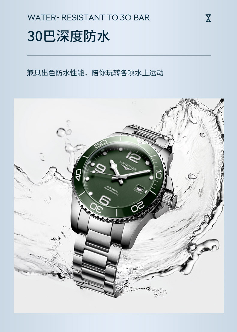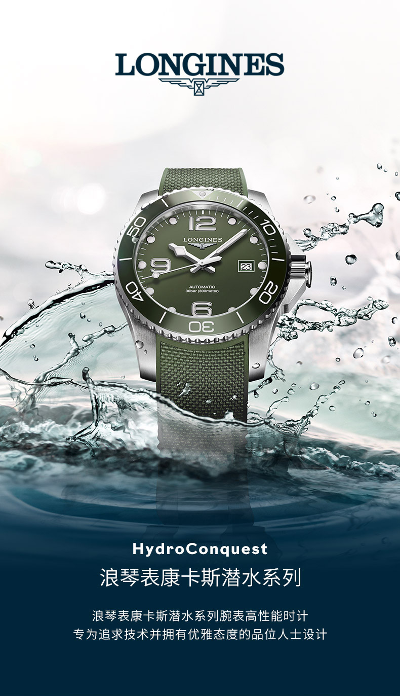 浪琴Longines 康卡斯潜水系列机械手表男士腕表 L3.781.4.06.6 绿色