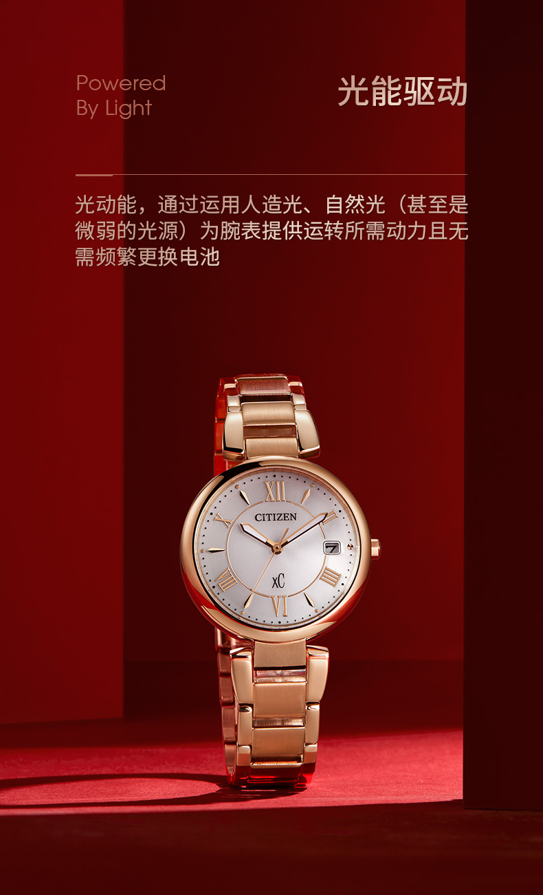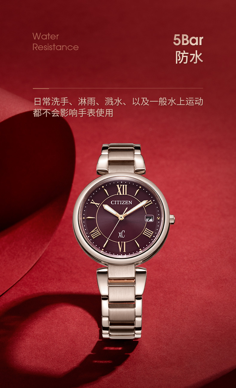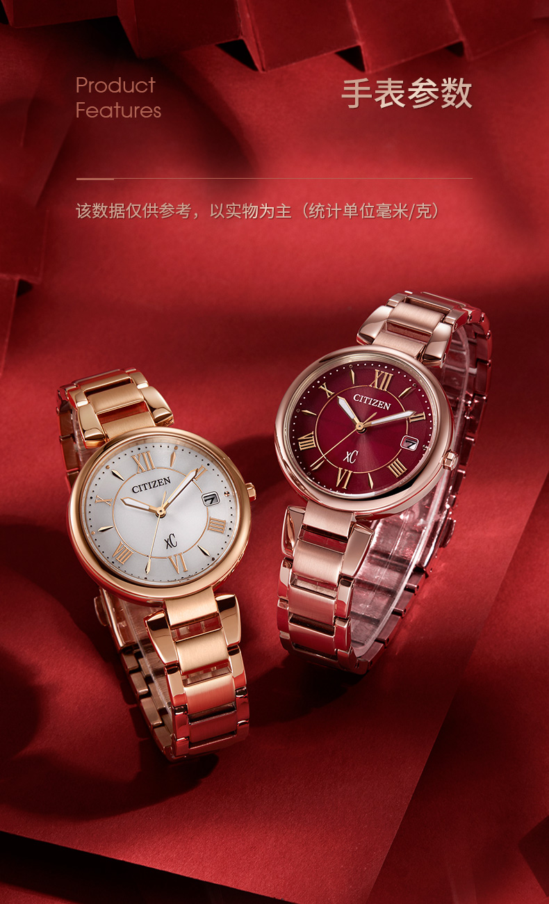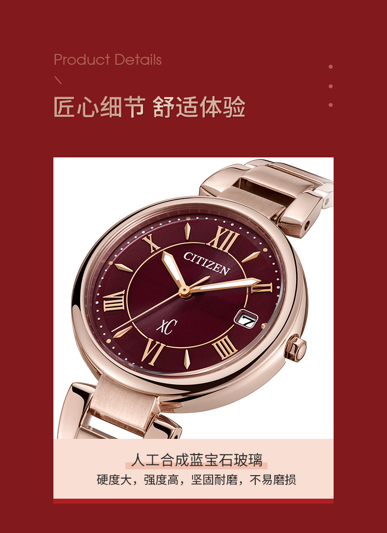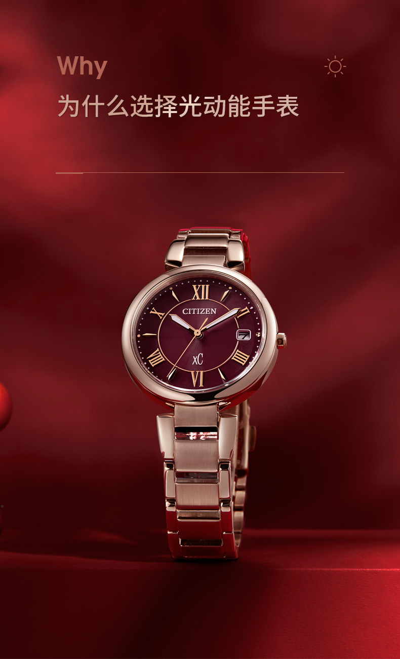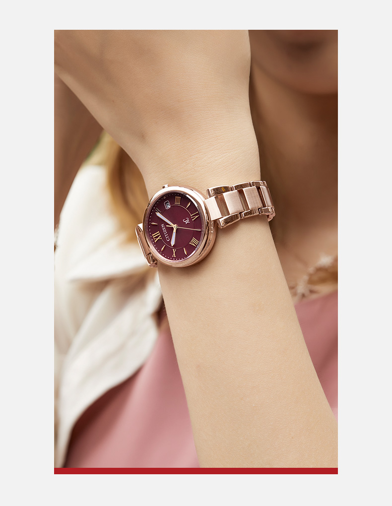 Citizen西铁城 xC系列 光动能手表时尚优雅红盘钢带女表EO1194-53W 酒红
