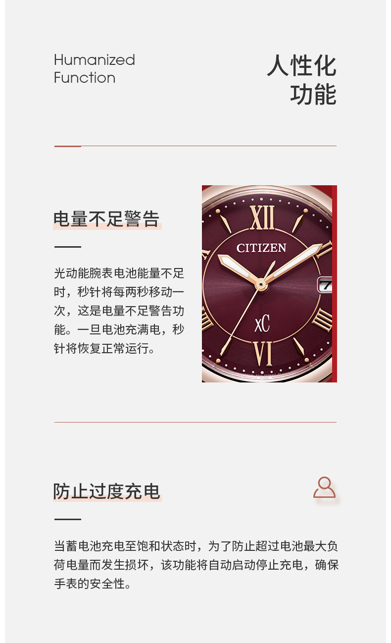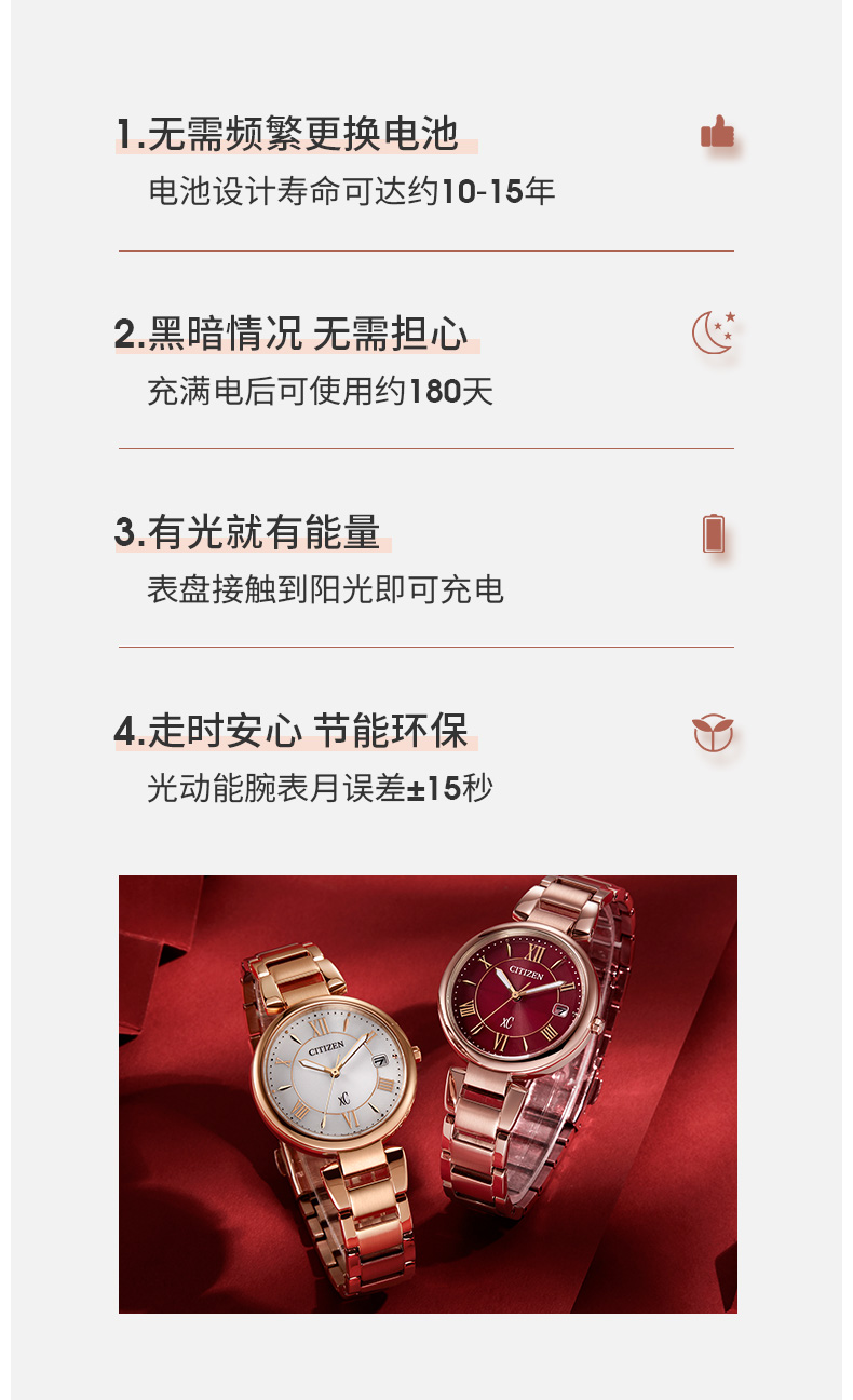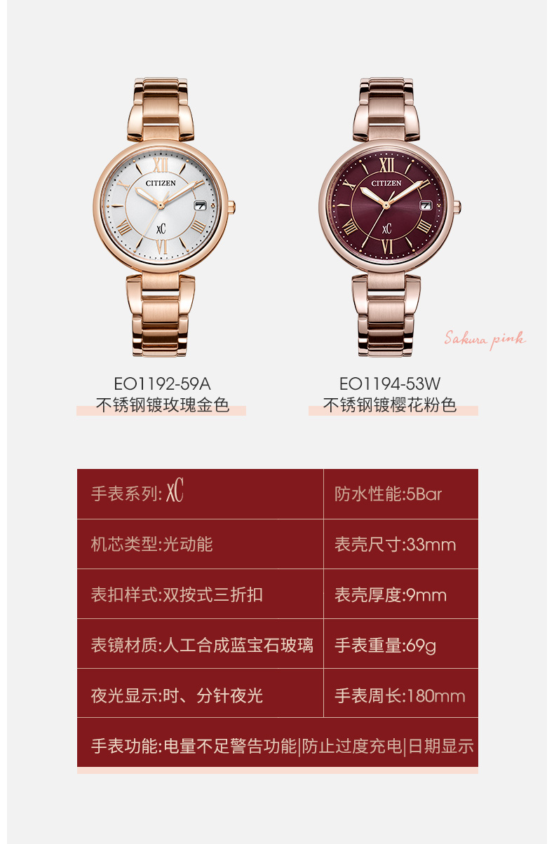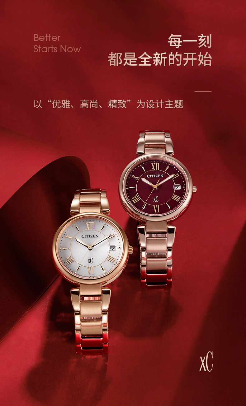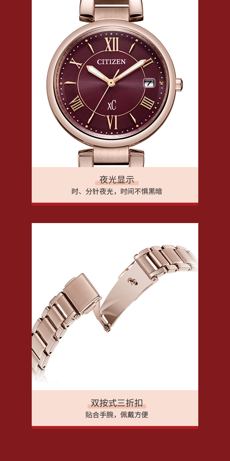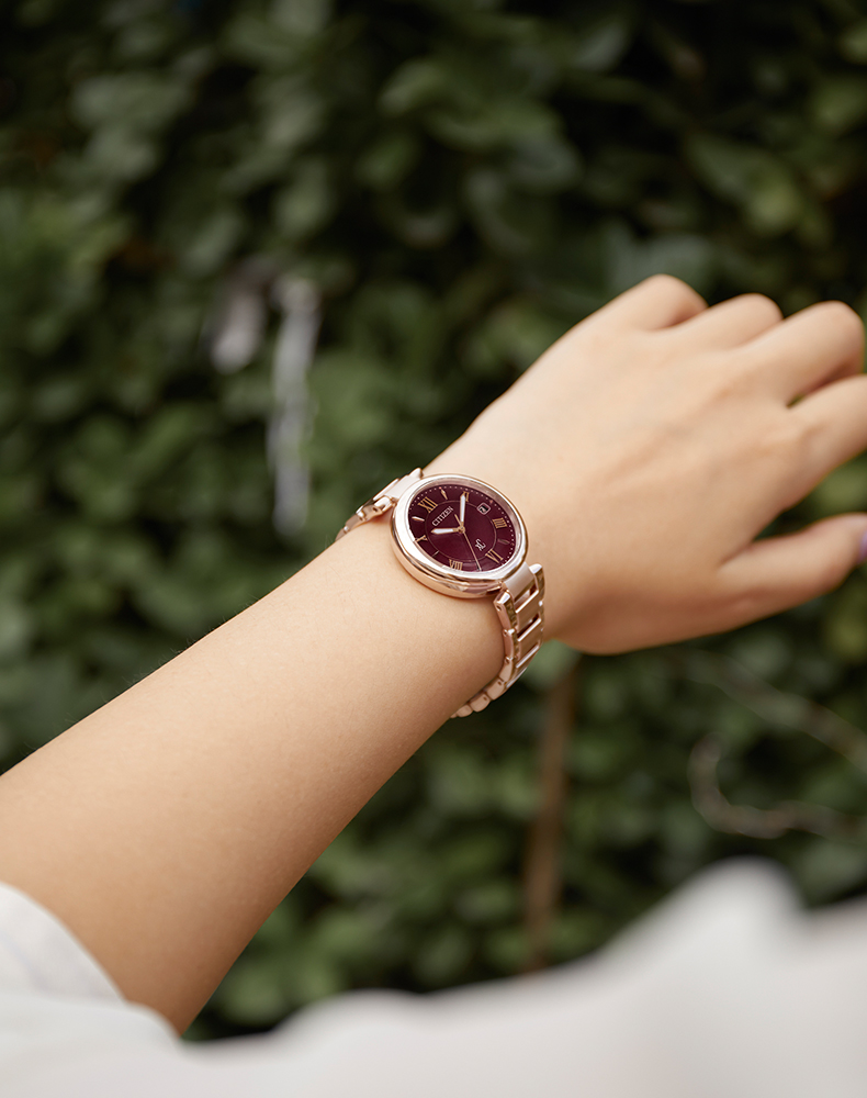 Citizen西铁城 xC系列 光动能手表时尚优雅红盘钢带女表EO1194-53W 酒红
