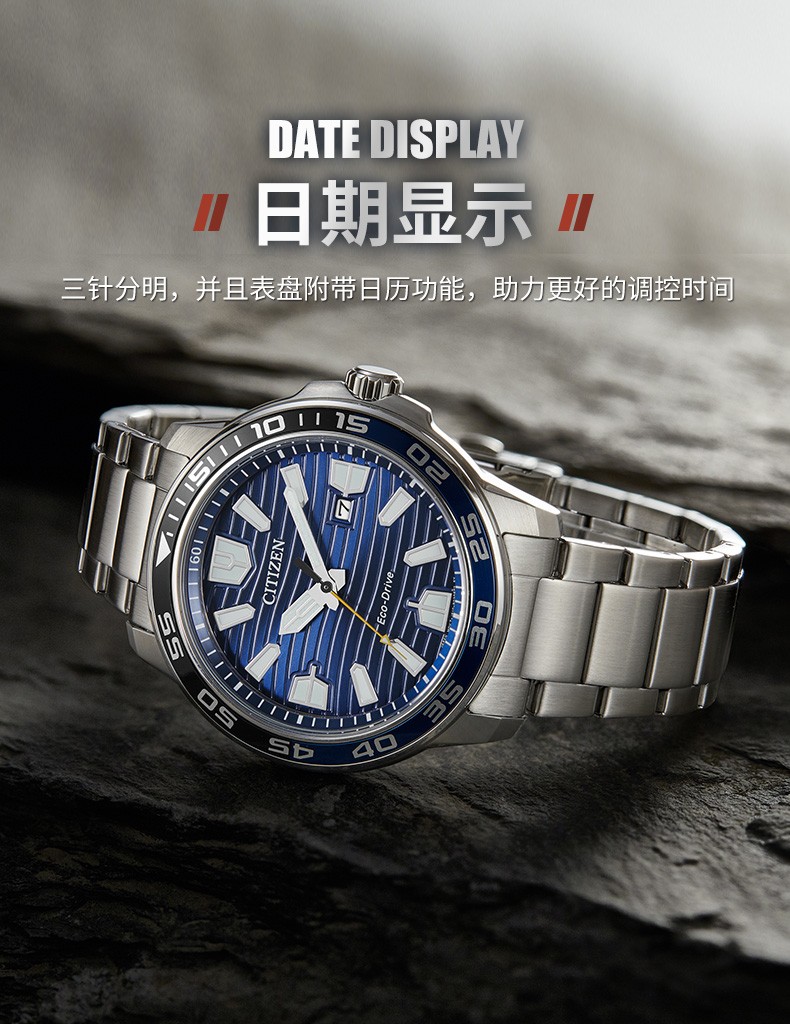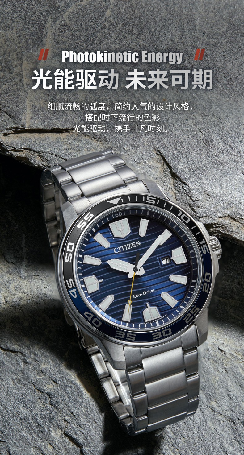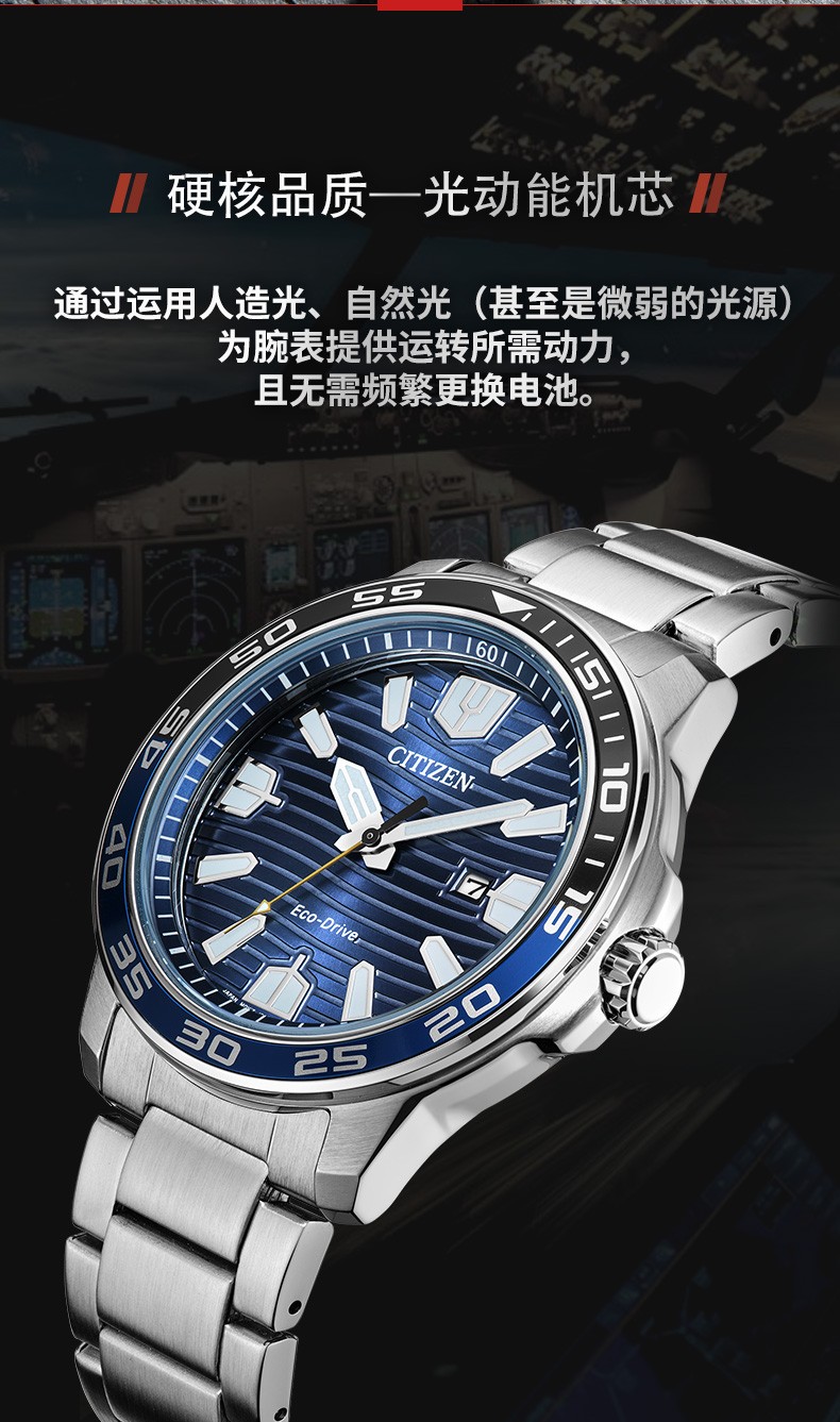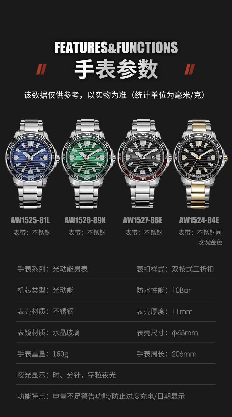 Citizen西铁城 光动能表经典夜光钢带防水水鬼光动能男表AW1524-84E 黑色
