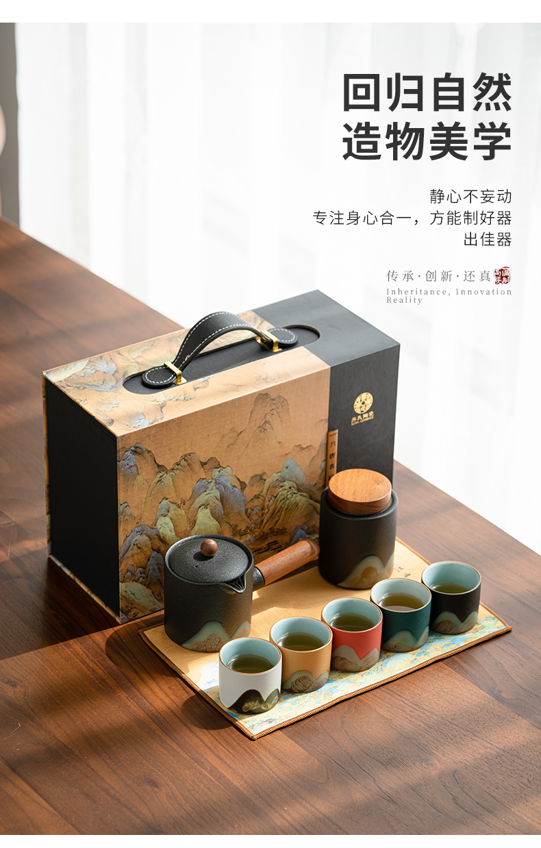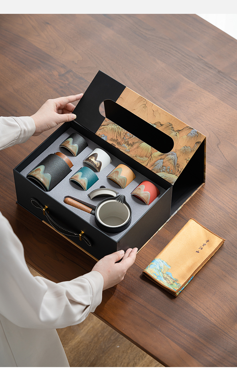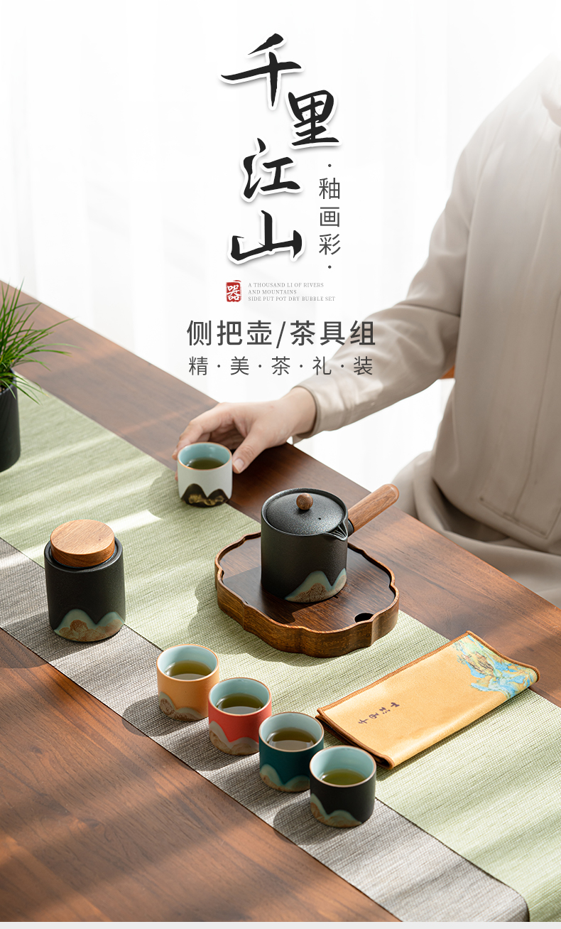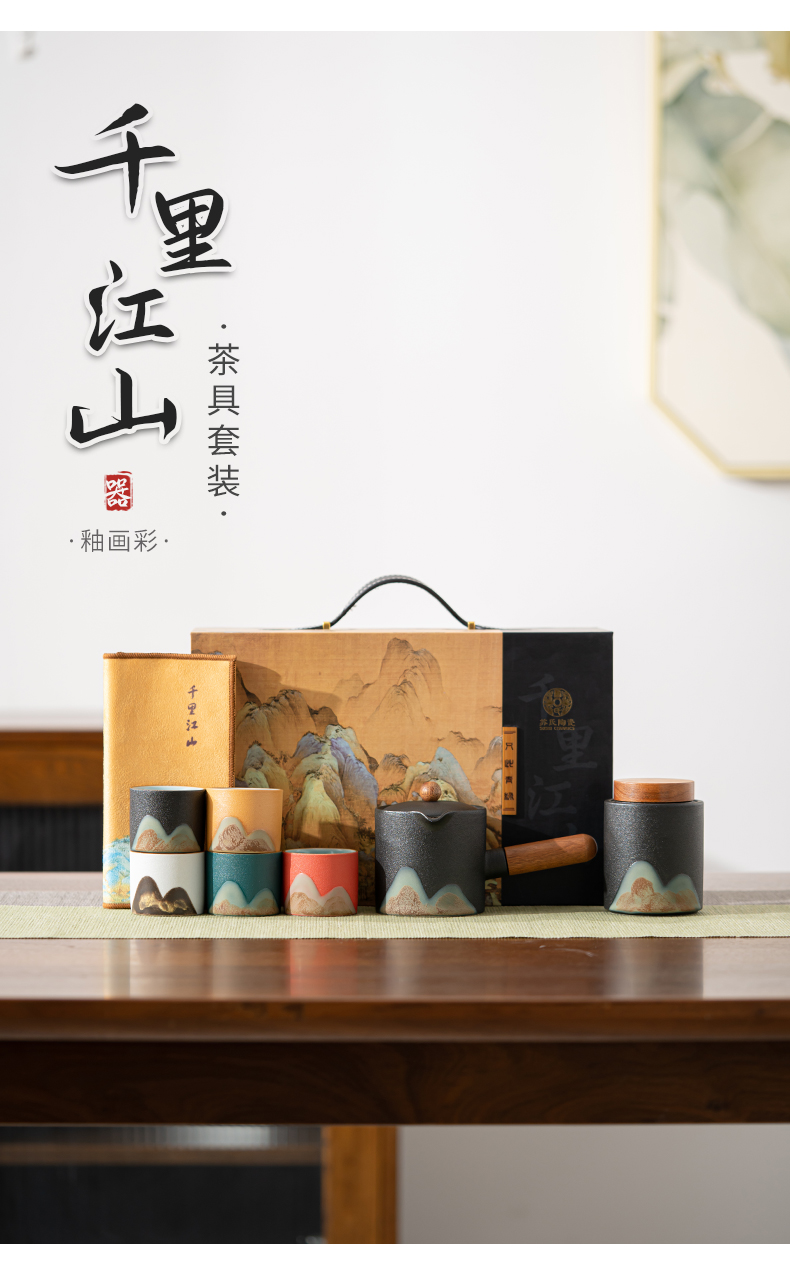 苏氏陶瓷(SUSHI CERAMICS)J0924釉画彩千里江山侧把壶五色杯礼盒装(单位:套) 混色